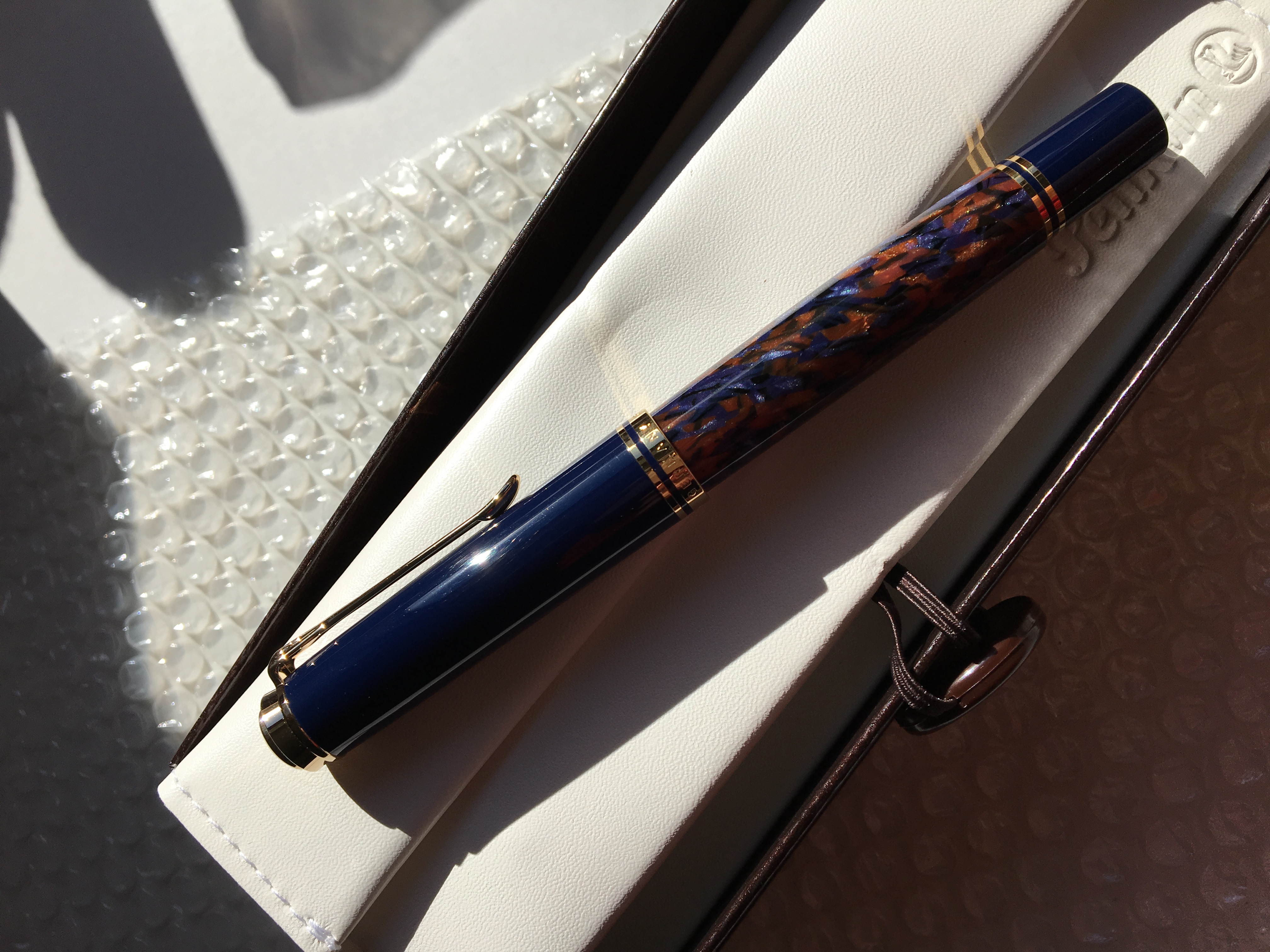 Queste Van Gogh hanno tutte delle colorazioni straordinarie! La mia è arrivata giusto ieri, sono riuscita a trovarla, nuova fiammante, con il pennino con il foro a mezzaluna, semplicemente la adoro! L' ho provata solo ad intinzione con il Pelikan Royal Blue. Scrive molto bene, il pennino Medio ha una certa elasticità. Mi piace! Ora non mi resta che scegliere un bell'inchiostro! Dilemma!