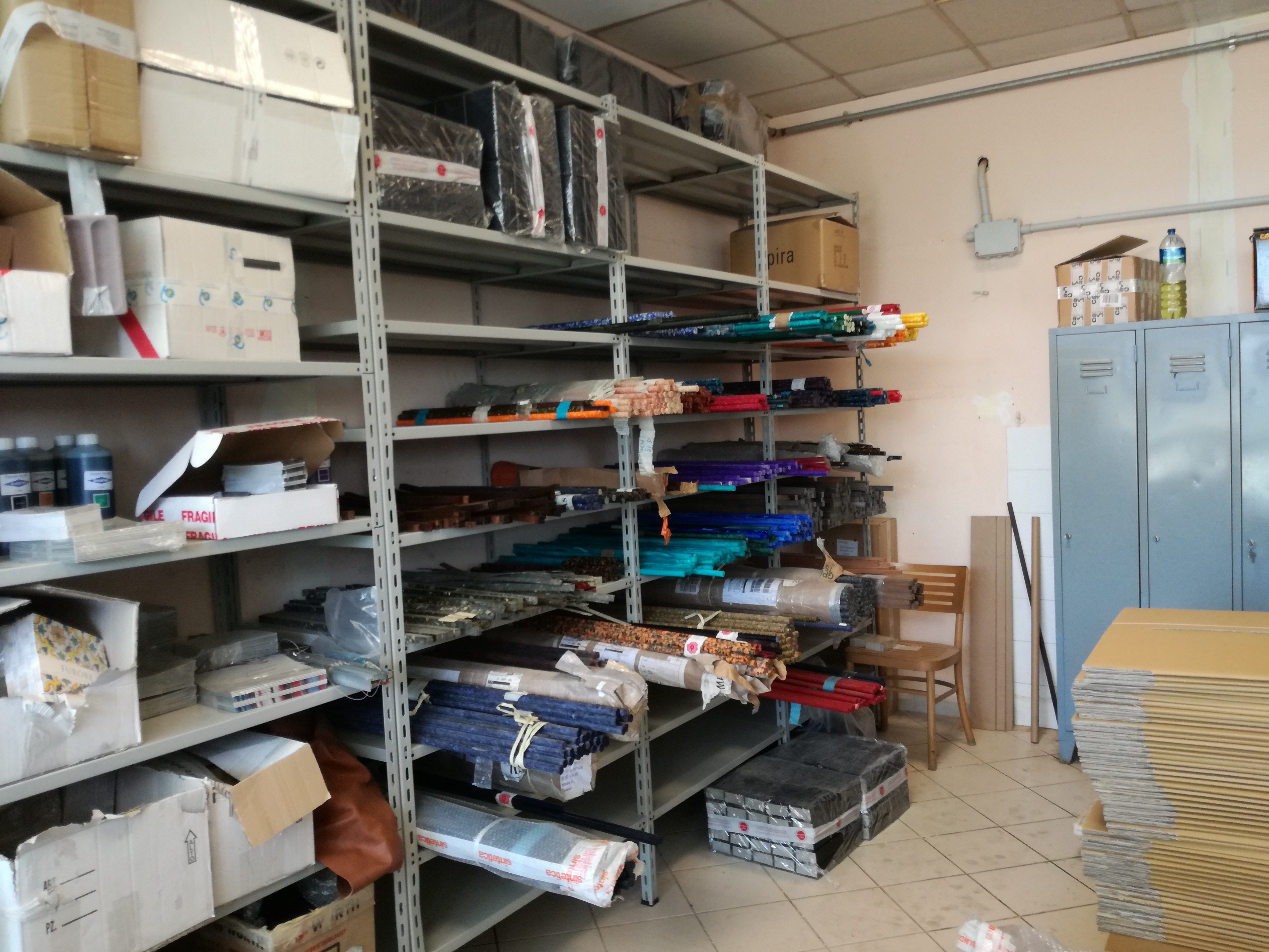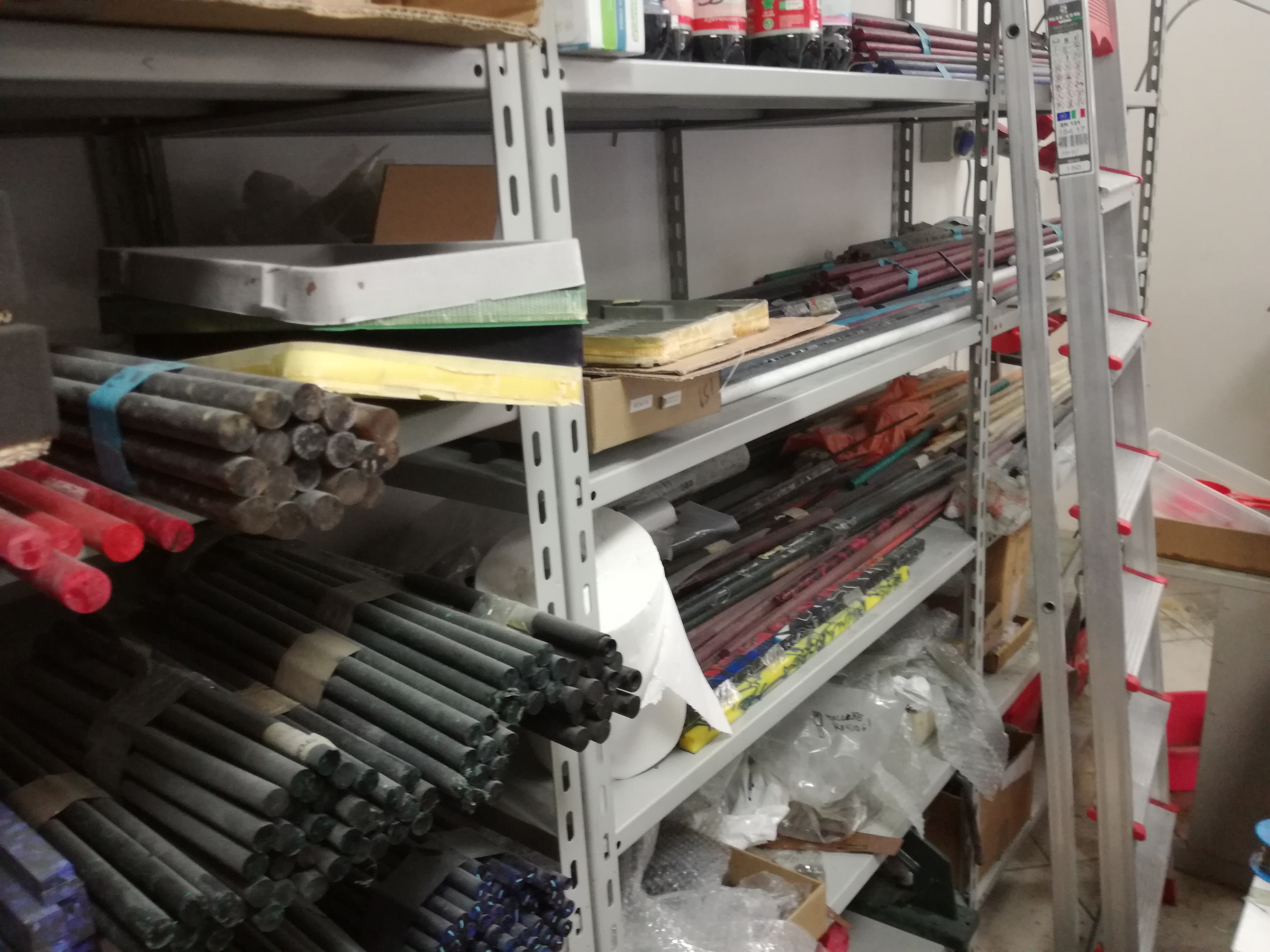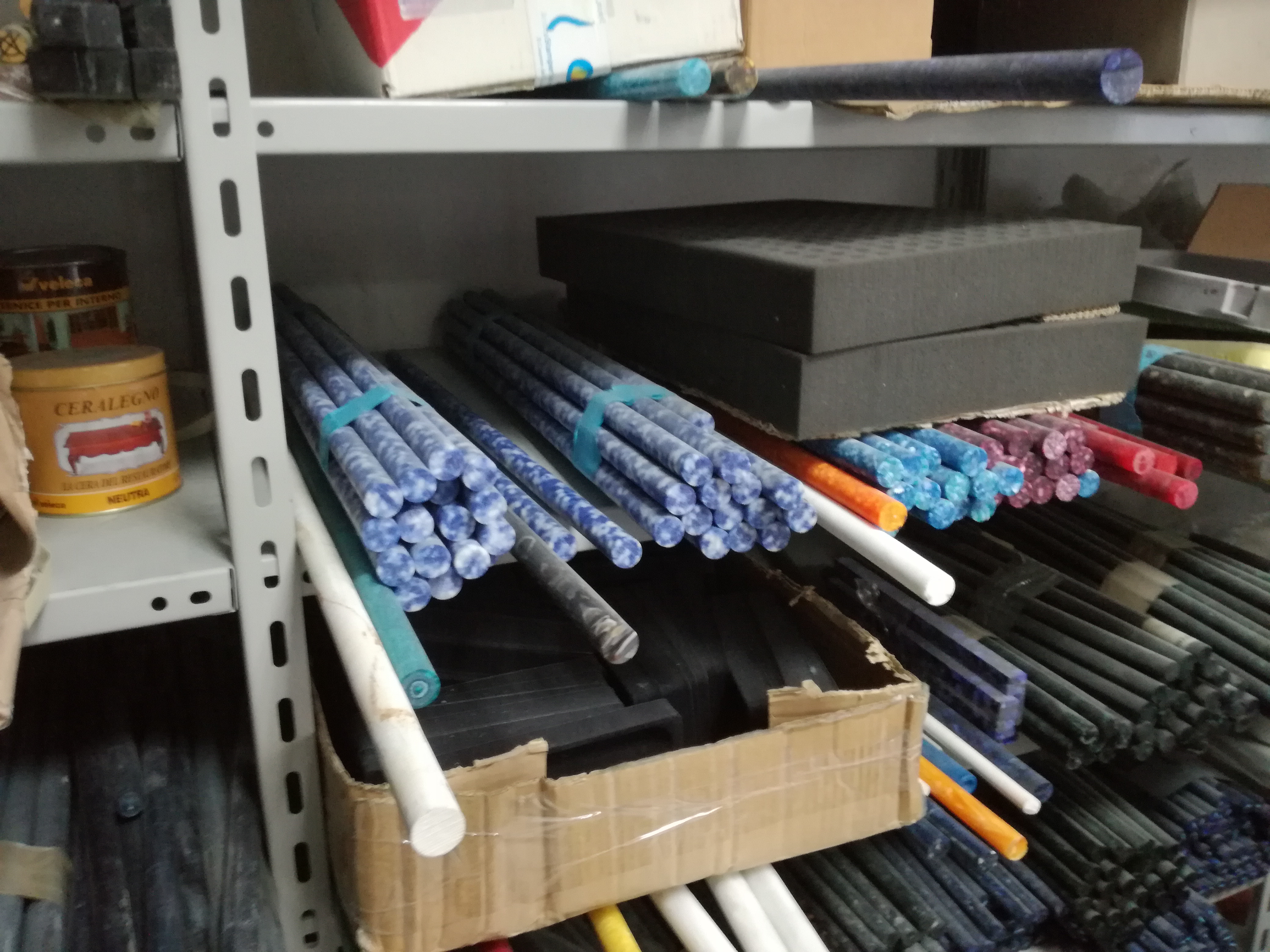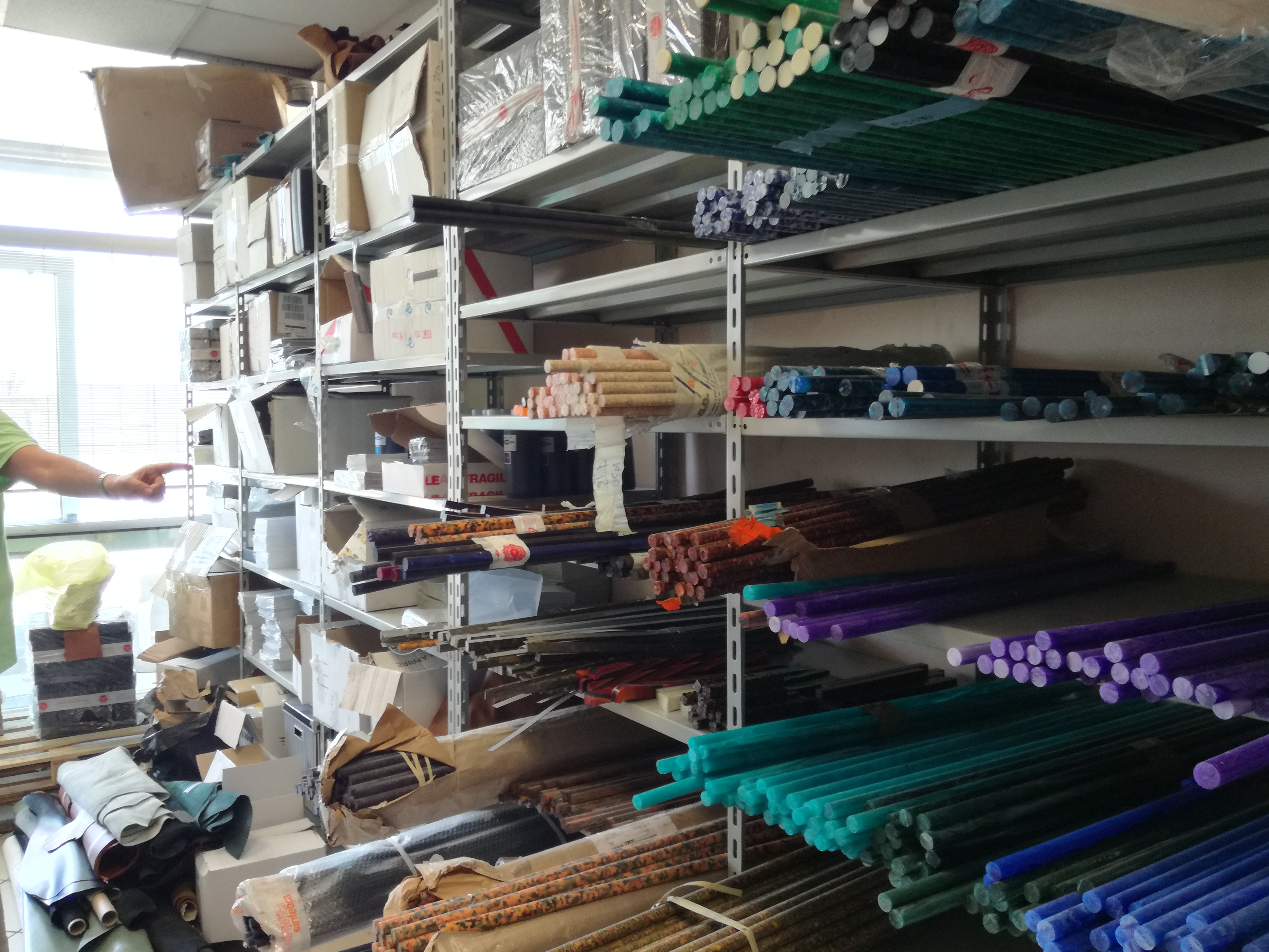 Una volta dentro Salvatore Matrone ci ha iniziato ad illustrare l'area dove assemblano a mano ogni singola penna, l'area dove vengono lucidati i vari componenti prima dell'assemblaggio e dove vengono testati i pennini. Viene davvero fatto tutto a mano. Poi ci ha mostrato il tornio su cui nascono le nuove creazioni, tutti i modelli più esclusivi, ma soprattutto le novità che verranno messe sul mercato a breve. Tra le novità ci sono materiali esclusivi che faranno parlare di loro, sono delle resine molto belle che si ispirano alle introvabile celluloidi Arco che verranno chiamate Cuspide, e modelli nuovi davvero belli, tra questi la prima esclusiva penna faccettata a tredici facce marchiata Leonardo Officine Italiane, occhio perché sarà un'edizione molto limitata. Salvatore è una vera miniera di idee e la qualità dei suoi prodotti fa si che oltre alla sua produzione gli vengano continuamente richiesti modelli esclusivi da diversi negozi di fama e prestigio noti. Poi dalle foto di Maxpop avrete notato l'area dei tesori, dove sono conservate le ultime preziose barre di Arco Marrone... e non solo! Chi ha occhio potrà scorgere anche il bellissimo Saft Green sempre di OMAS, insomma roba da leccarsi i baffi. A proposito di OMAS, è stata una piacevole sorpresa vedere un vecchio macchinario OMAS acquisito da Salvatore, un macchinario che continuerà a servire un marchio che realizza penne con passione e professionalità.