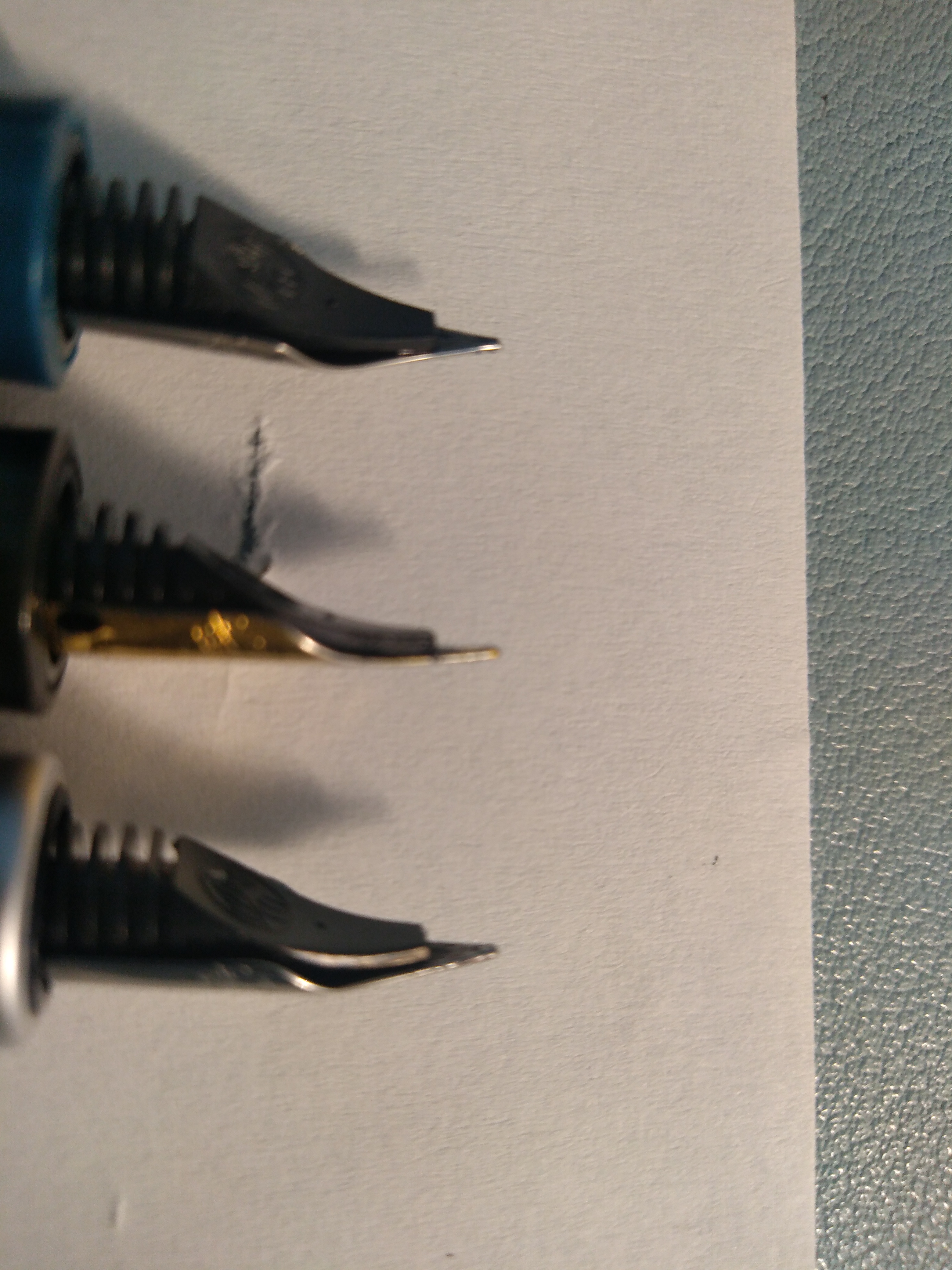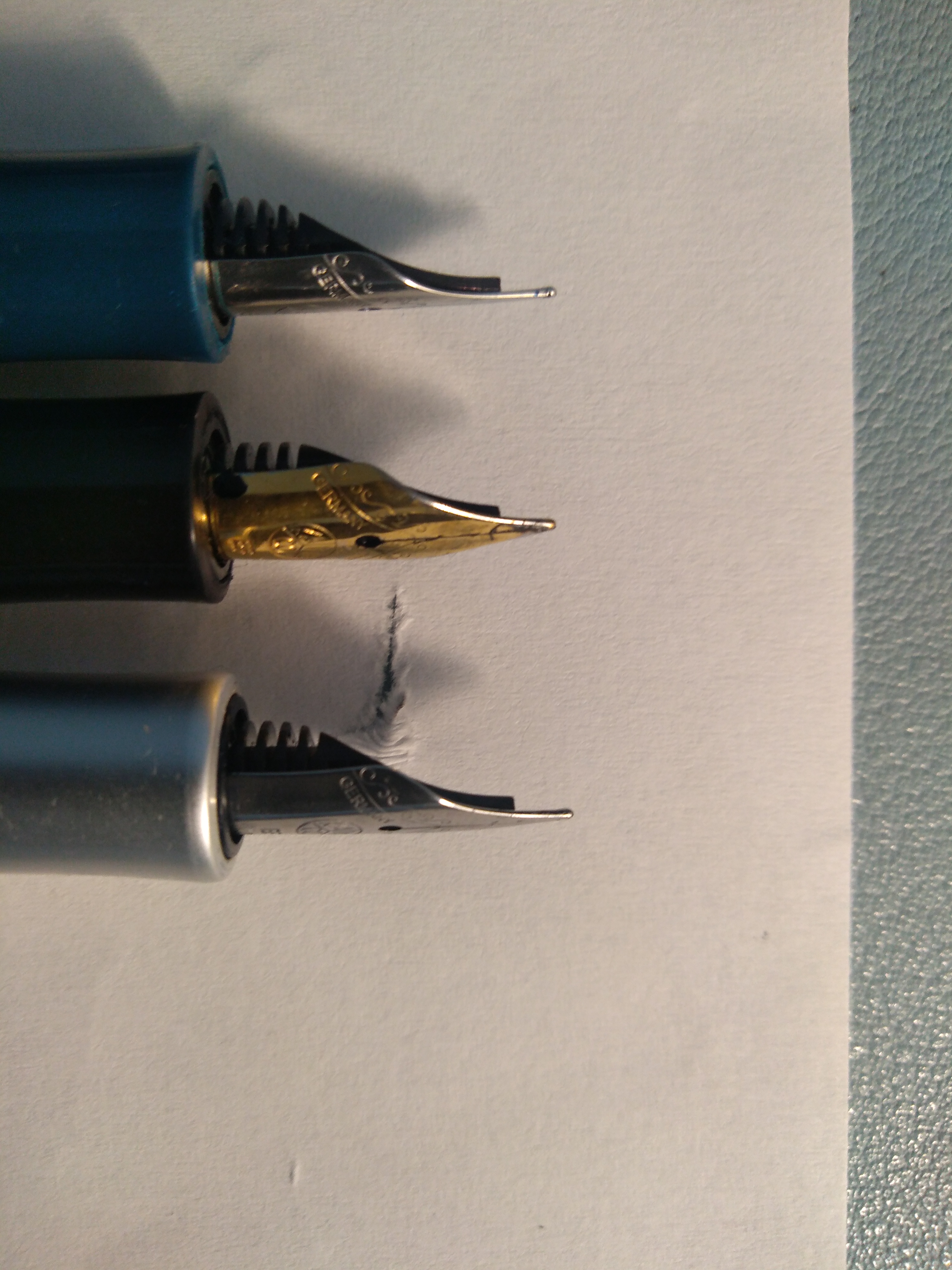 Premetto che ho preferenza per il pennino con tratto molto sottile e con feedback importante, delle tre non c'è un pennino che scriva uguale all'altro, pur essendo tutti marcati EF.
