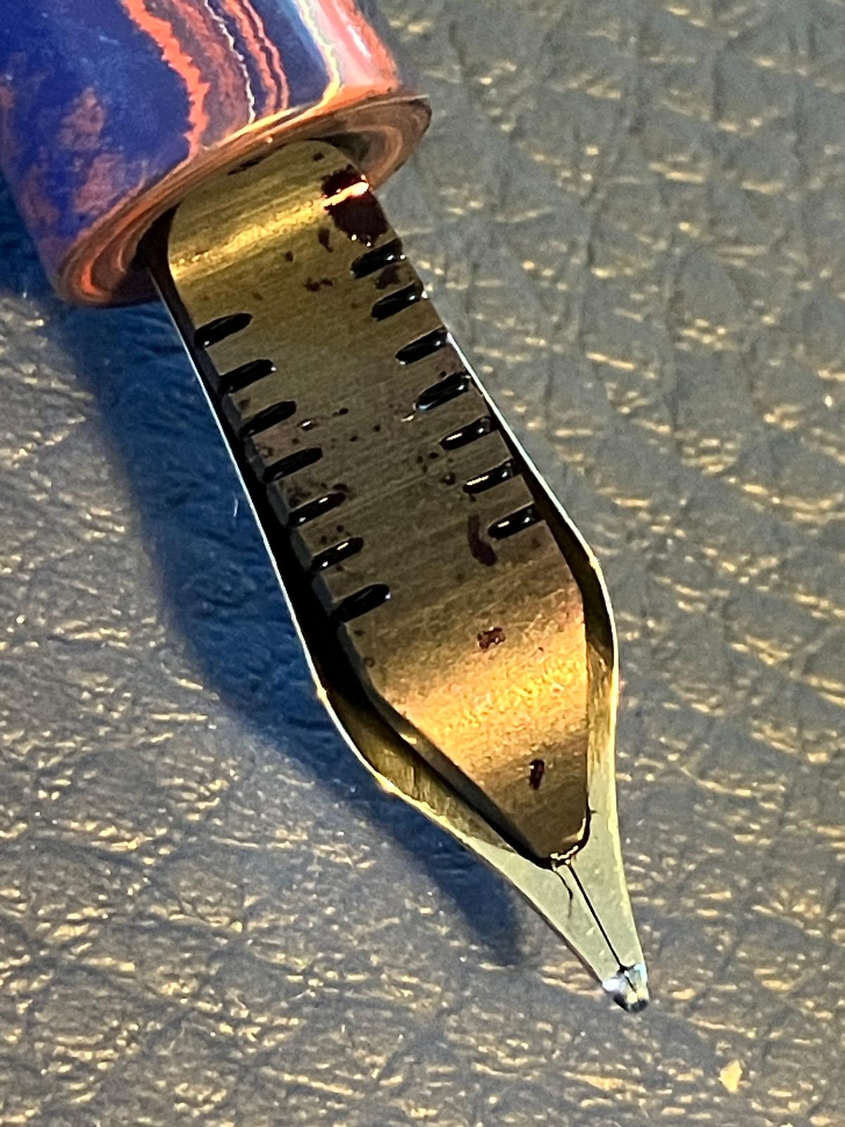 sto usando la penna da almeno 10 minuti, dopo averla caricata ieri per circa 3/4 di serbatoio, e non vedo inizi di burping, gli spazi tra pennino e alimentatore sono liberi (di solito è lì che si nota l'insorgere del burping quando l'inchiostro supera il margine dell'alimentatore e dilaga sul retro del pennino).
