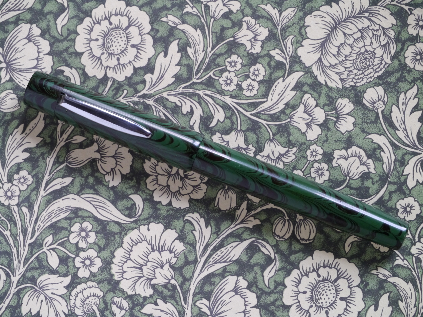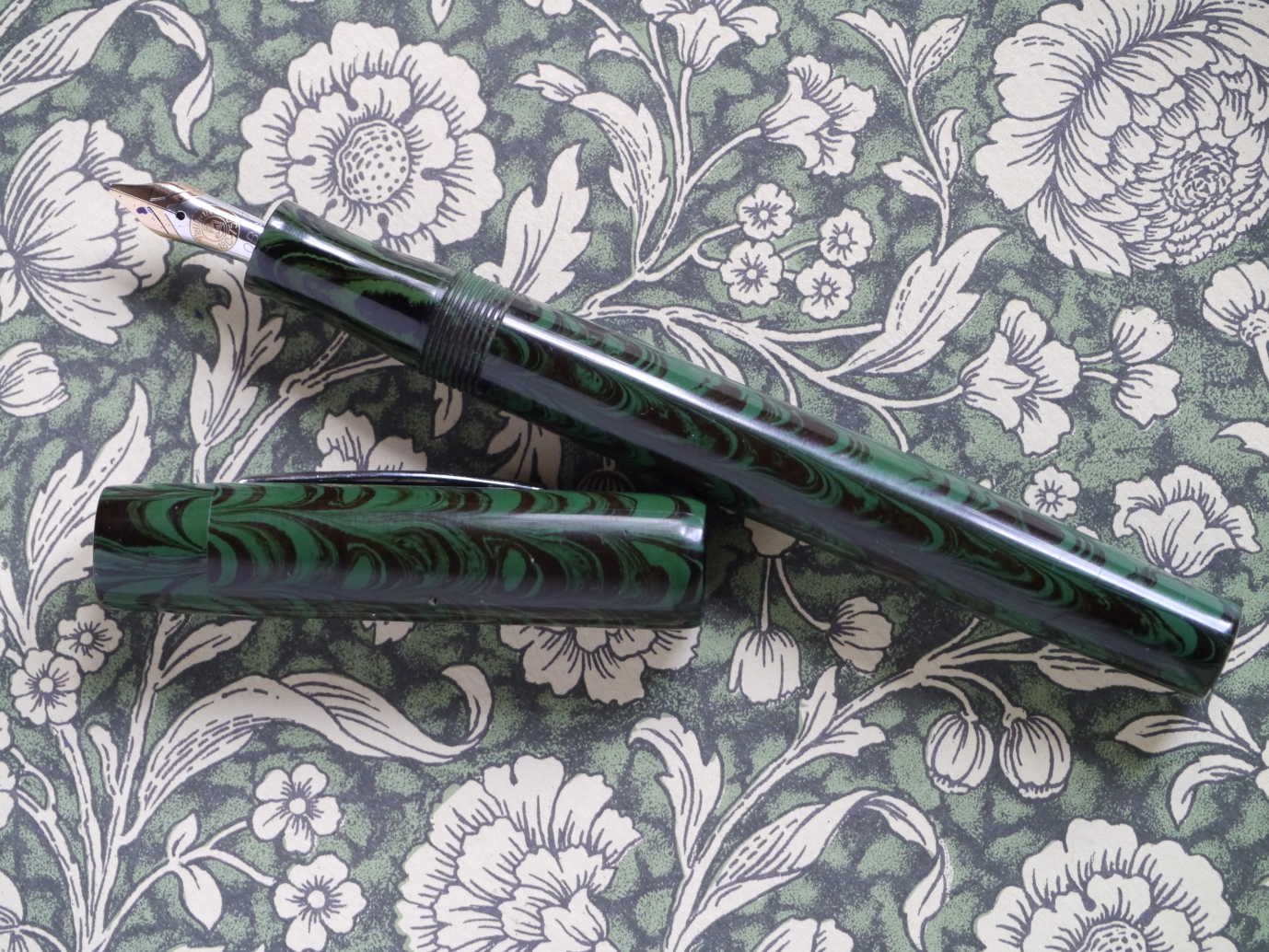 Questa Deccan ha impostazioni simili ad altre eyedropper in ebanite, cappuccio che si svita in 4 giri, forellino di sfiato sul cappuccio, ma ha una peculiarità, è stata filettata (su richiesta) con filettatura Pelikan (M200/400/M400/M600), e monta quindi un pennino Pelikan, in particolare, al momento, un pennino OB di una M700 (o di una M600 old style).