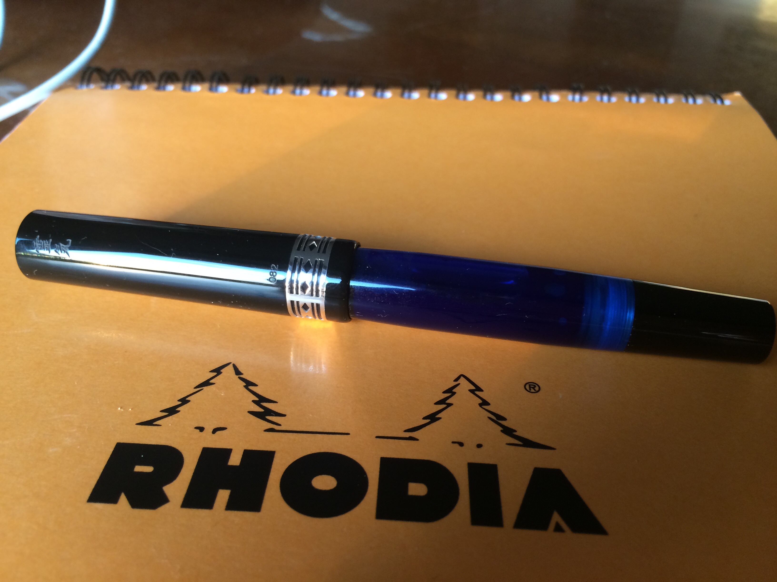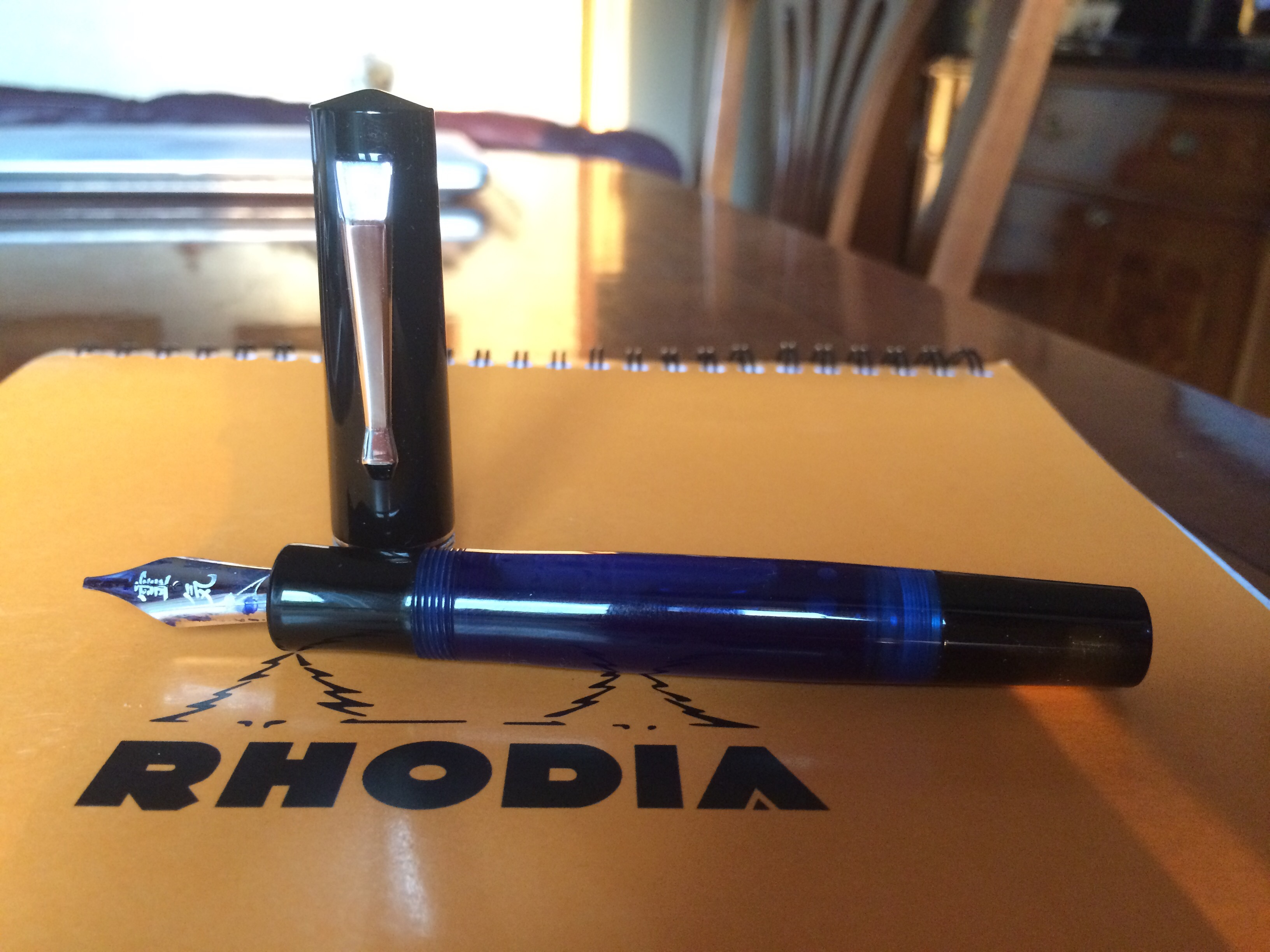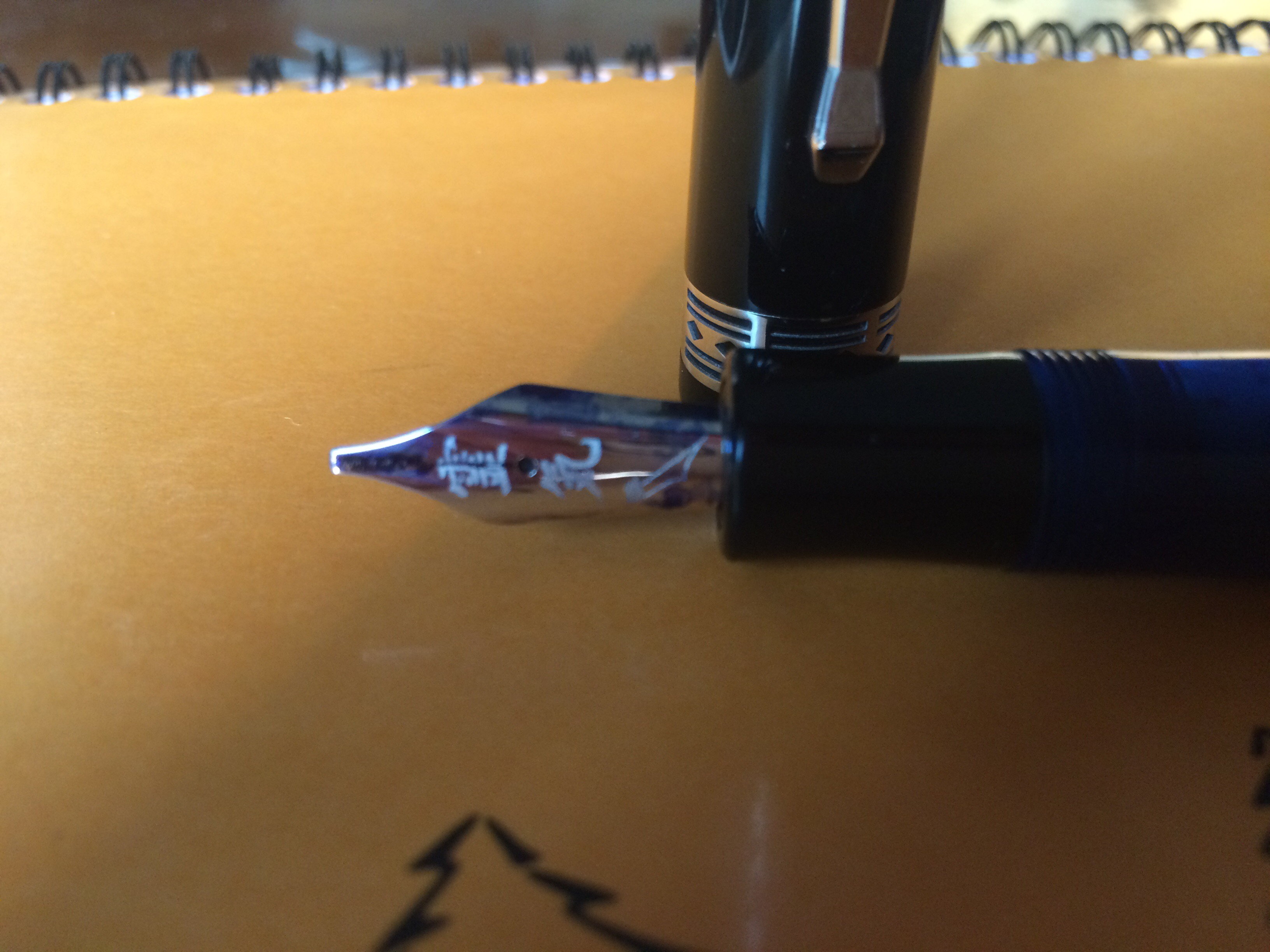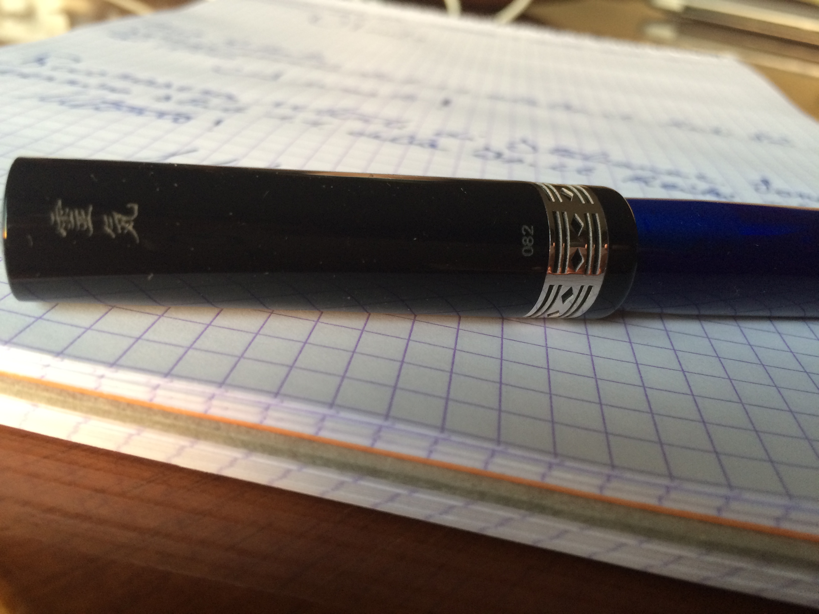 Dal vivo, l'ho trovata ancora più interessante che dal vivo, soprattutto il 'contrasto' tra linee e sistema di caricamento decisamente retrò e clip e vera che io trovo nettamente più moderne. Ho inizialmente caricato la penna col Montblanc Permanent Blue, tuttavia anche questa - come la Parker Sonnet - dopo poco si bloccava, obbligandomi ad agire sul pulsante di fondo per far arrivare l'inchiostro al pennino. Stufo della situazione, ho smontato completamente la penna (svitando la sezione, in base a quanto letto qui) e ho proceduto al lavaggio; ho trovato incrostazioni sulla parte inferiore del pennino e lungo il taglio, per cui ho pulito tutto accuratamente. Caricata con Iroshizuko Kon-peki (che è davvero un bellissimo colore), ho provato a scrivere e anche se la situazione è migliorata, noto sempre false partenze ed interruzioni durante la scrittura; ora, questo è il mio primo sub, per cui chiedo: è normale questo comportamento? La penna ha meno margine a causa del pennino tagliato, oppure devo provare a pulirla più a fondo?