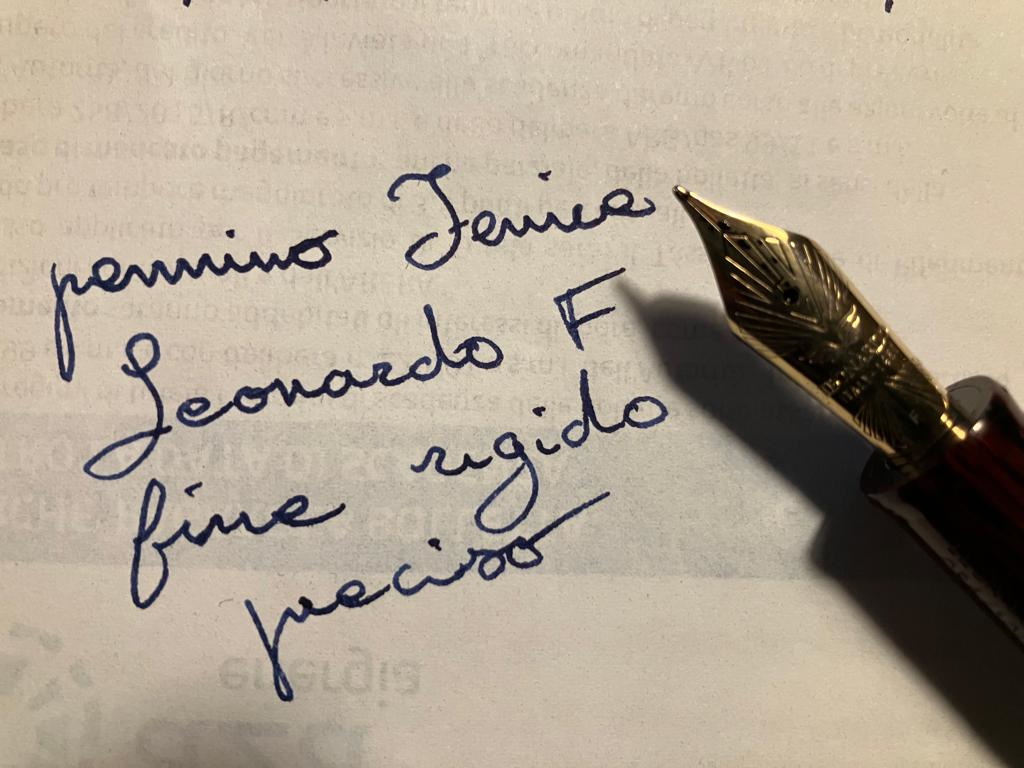 Del pennino avevo detto già da qualche parte, e confermo, oltre all'essere esteticamente molto piacevole, è fine abbastanza fine, piuttosto rigido, molto scorrevole su carta di buona qualità, e molto preciso. Il flusso mi sembra giusto, per nulla abbondante malgrado l'alimentatore in ebanite.