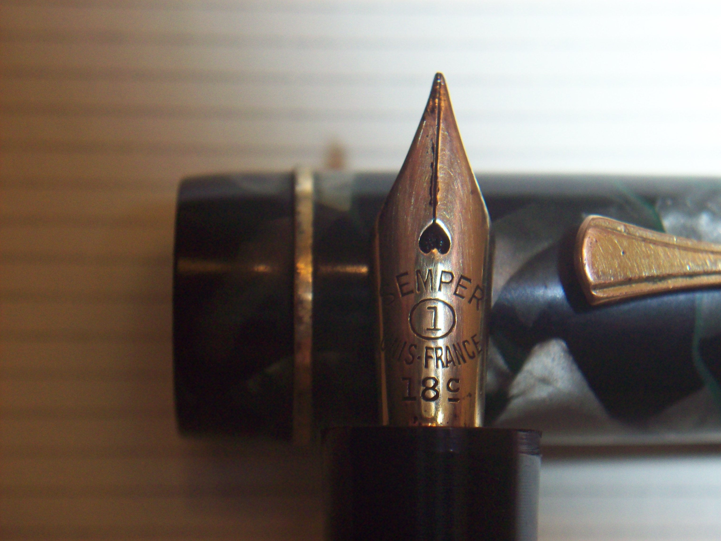 Da circa una settimmana sto provando una Semper (J. M. Paillard) trovata domenica scorsa al mercatino dell'antiquariato di Valeggio sul Mincio, pagata 15 euri. Non era certo in buone condizioni: sacca sbriciolata, pennino - piccolo e flessibile - pieno di incrostazioni, fusto e cappuccio leggermente opachi. Una volta sistemata, devo dire che scrive veramente bene.