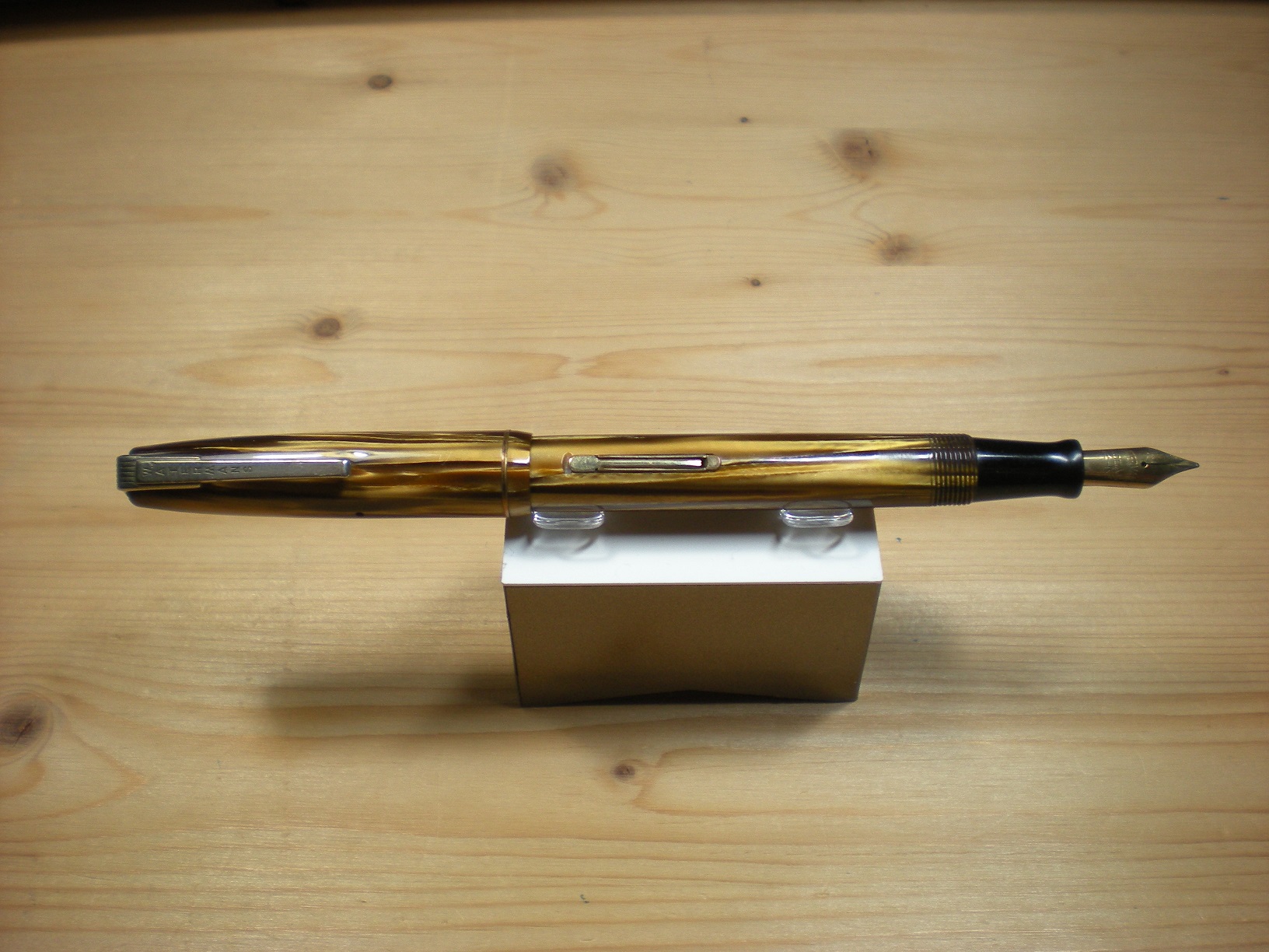 Buonasera, in questo periodo in cui ho un po' di tempo libero approfitto per mettere ordine in soffitta. Da uno scatolone è uscita questa penna Waterman's Dauntless 352 prodotta dal 1942 al 1953 in diverse versioni. Questa è stata prodotta negli Stati Uniti come riportato nell'incisione sul corpo. Il corpo è in celluloide con il pennino in oro 14 kt. Ricordo il pennino Waterman's Ideal 14 kt abbastanza flessibile con una discreta variazione del tratto e comunque morbido anche con una pressione normale.