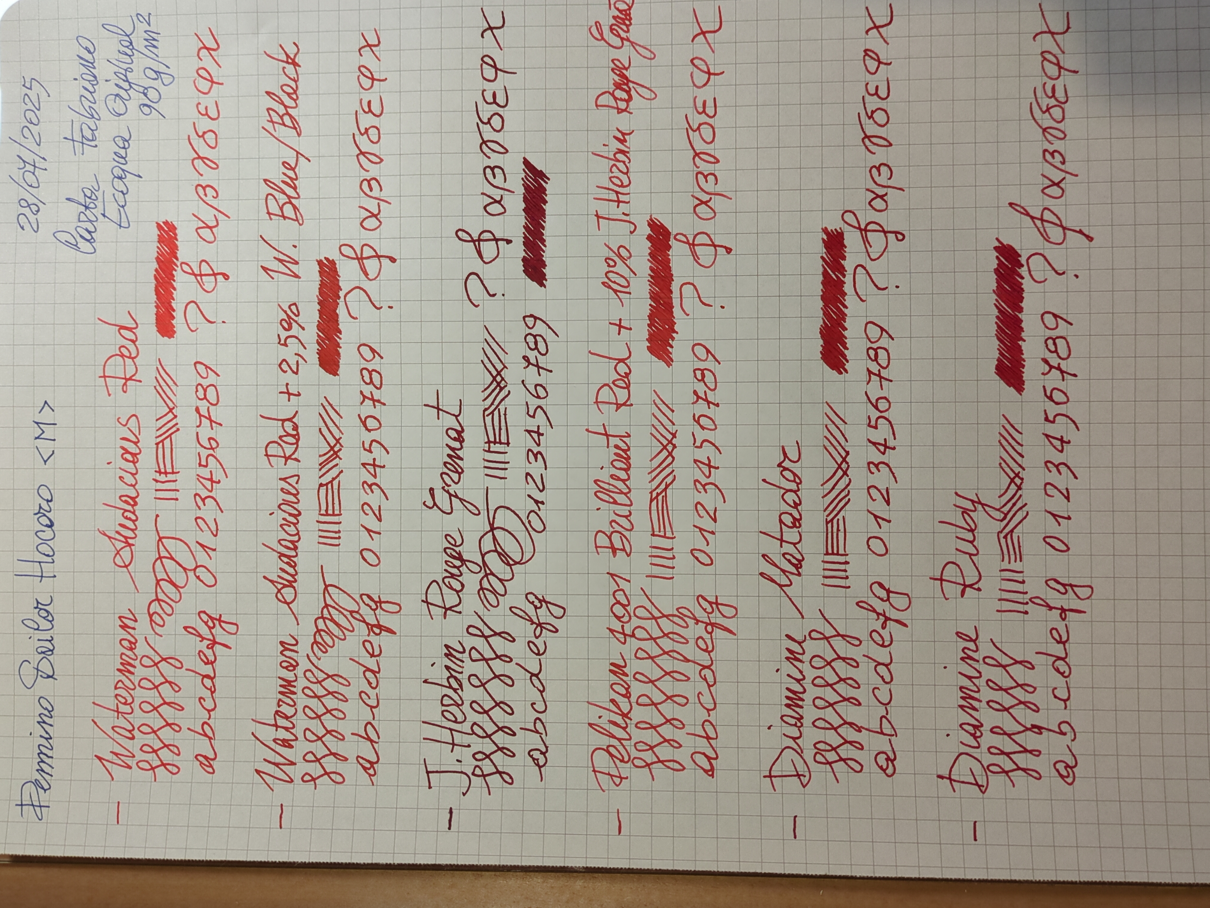 Bello! Per confronto, ho scritto due righe con Herbin Rouge Grenat, che ho nella Pilot Lightive M (Bello pure lui!) e con il Pelikan 4001 Brilliant Red (quasi arancio, poco interessante), che ho in una Pelikan scolastica in metallo dal nome sconosciuto.