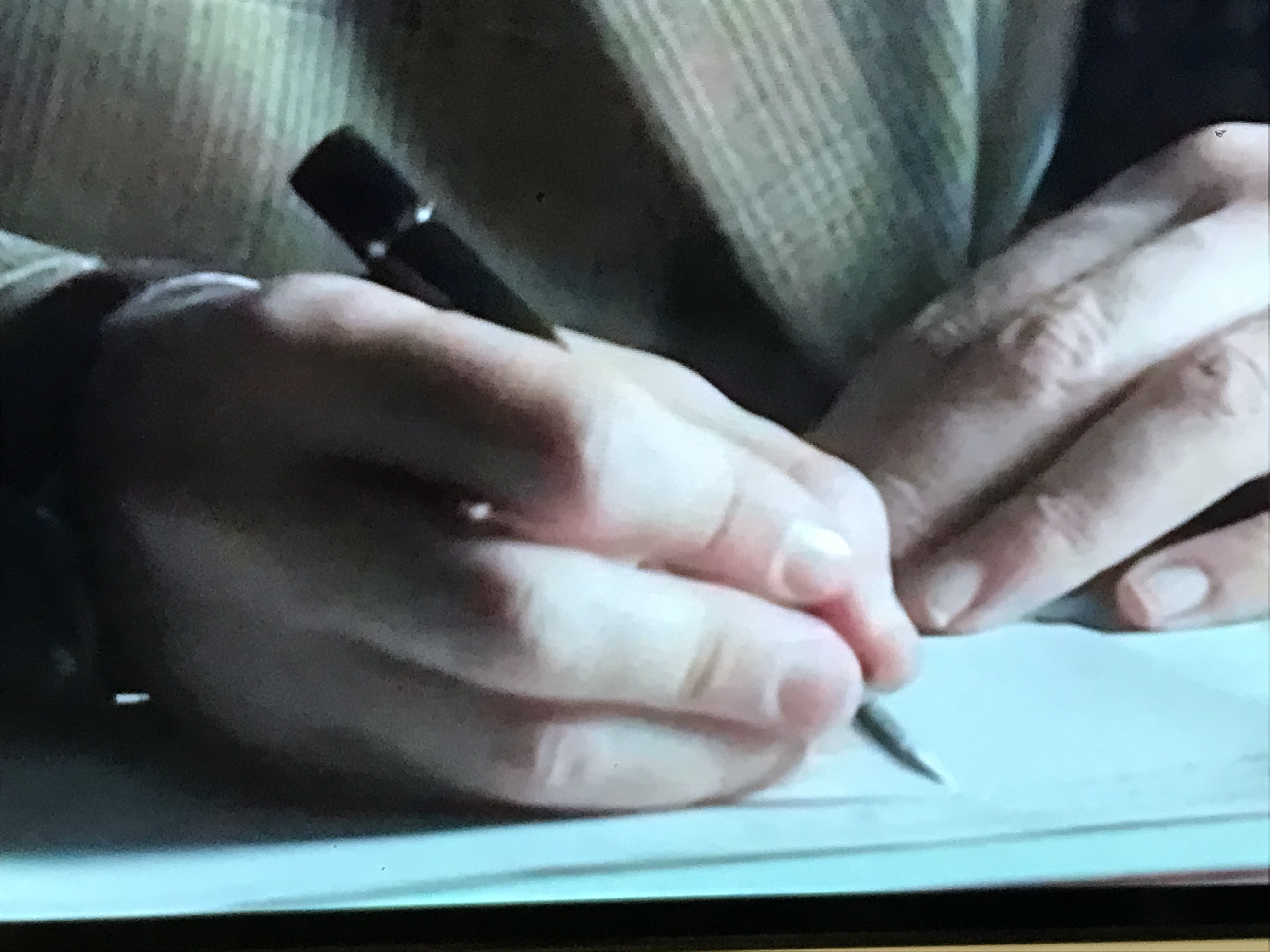 Difficile fare un fermo-immagine significativo, e la penna è sempre piuttosto sfocata, ma dovrebbe essere una Lamy Scala, calzata.