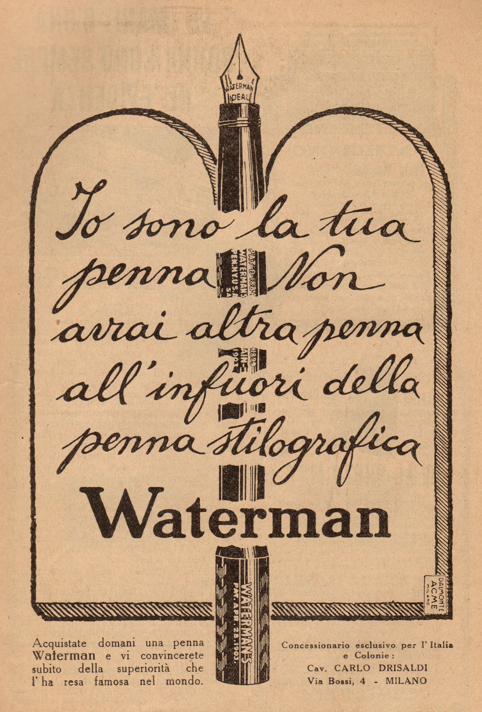[attachment=7]A1. WATERMAN - generica - 1928-01-22. L'Illustrazione Italiana - Anno LV - N.4, pag.II. By Cappadonia.jpg[/attachment] La sua inchiesta su "I Grandi della Letteratura e la loro stilografica preferita" gli ha fruttato (manco a dirlo ) un prestigioso Premio internazionale e la pubblicazione di un libro...