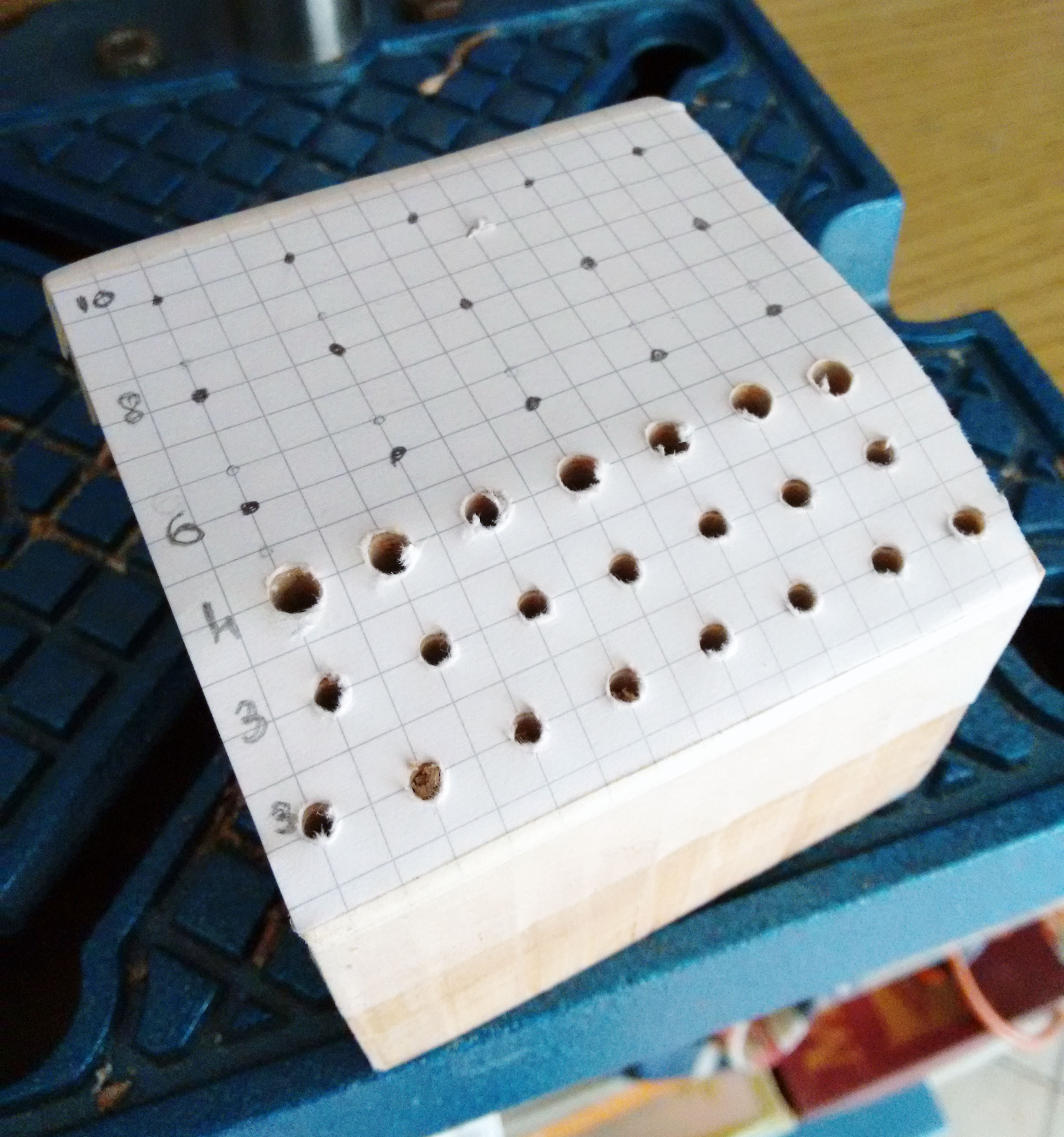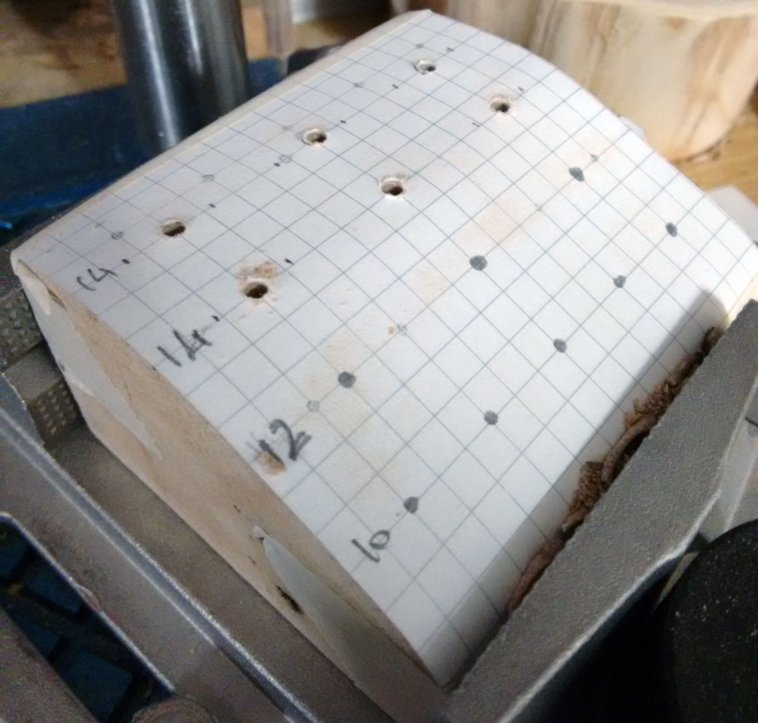 Segnate sulla punta del trapano da 14 una linea che vi indichi una profondità di foro di circa 2/3 del blocchetto in modo da fare fori di altezza simile.