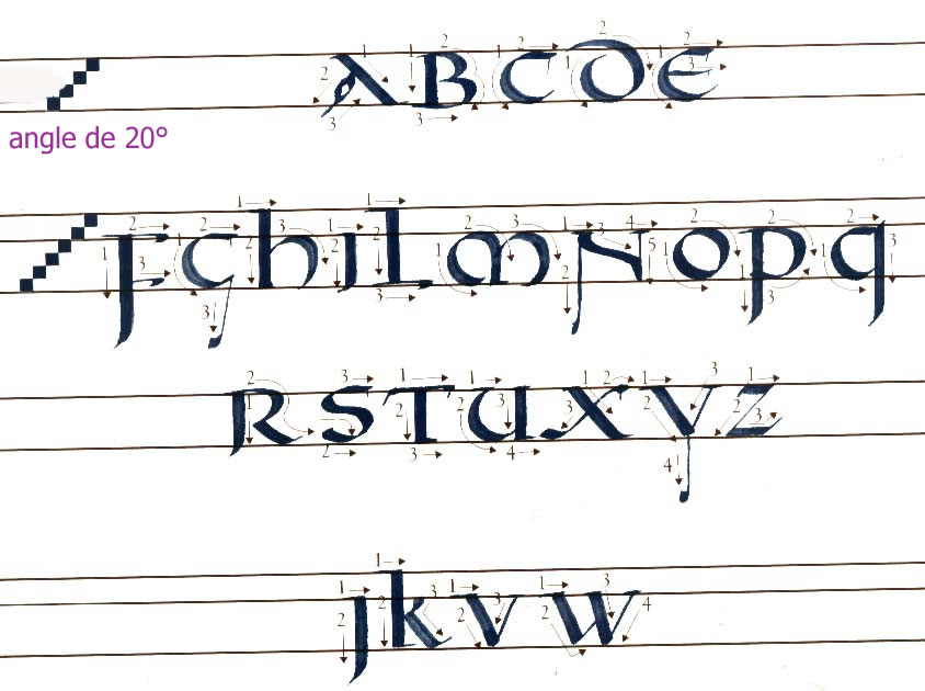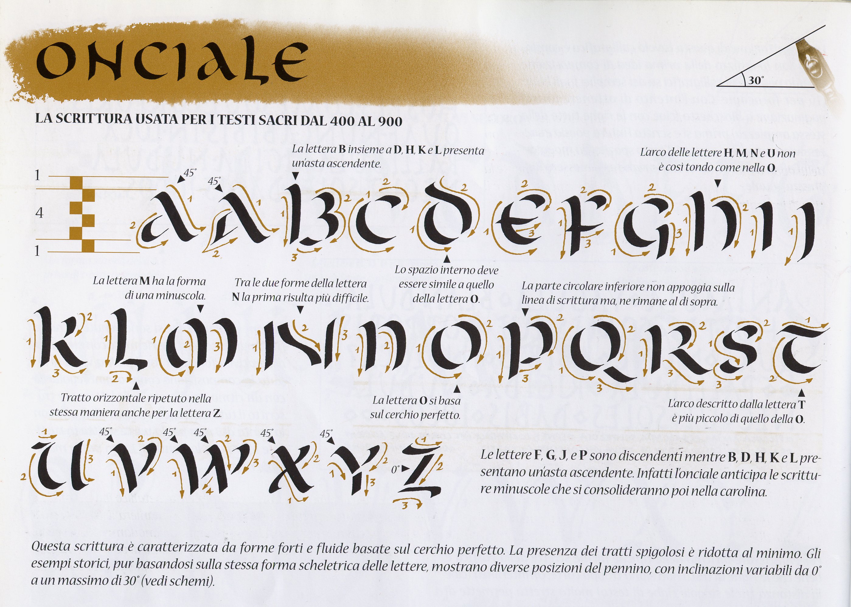 Potrei avanzare solo delle considerazioni di carattere generale come la necessità di cambiare angolazione del pennino fra i tratti verticali e quelli obliqui, ad esempio, in modo di ottenere uno spessore costante.