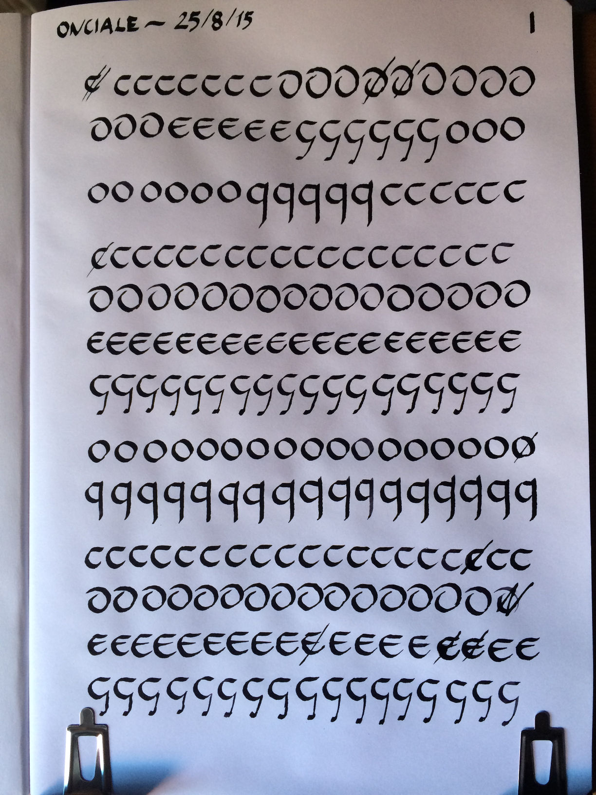 Magari una per volta, però. Onciale, minuscola carolina e gotico (nelle sue varie declinazioni) sono scritture molto diverse tra loro, richiedono una differente gestione della penna, del tratto e degli spazi: forse sarebbe meglio dedicarsi allo studio di una sola delle tre fino a quando non la si padroneggi con sufficiente sicurezza.