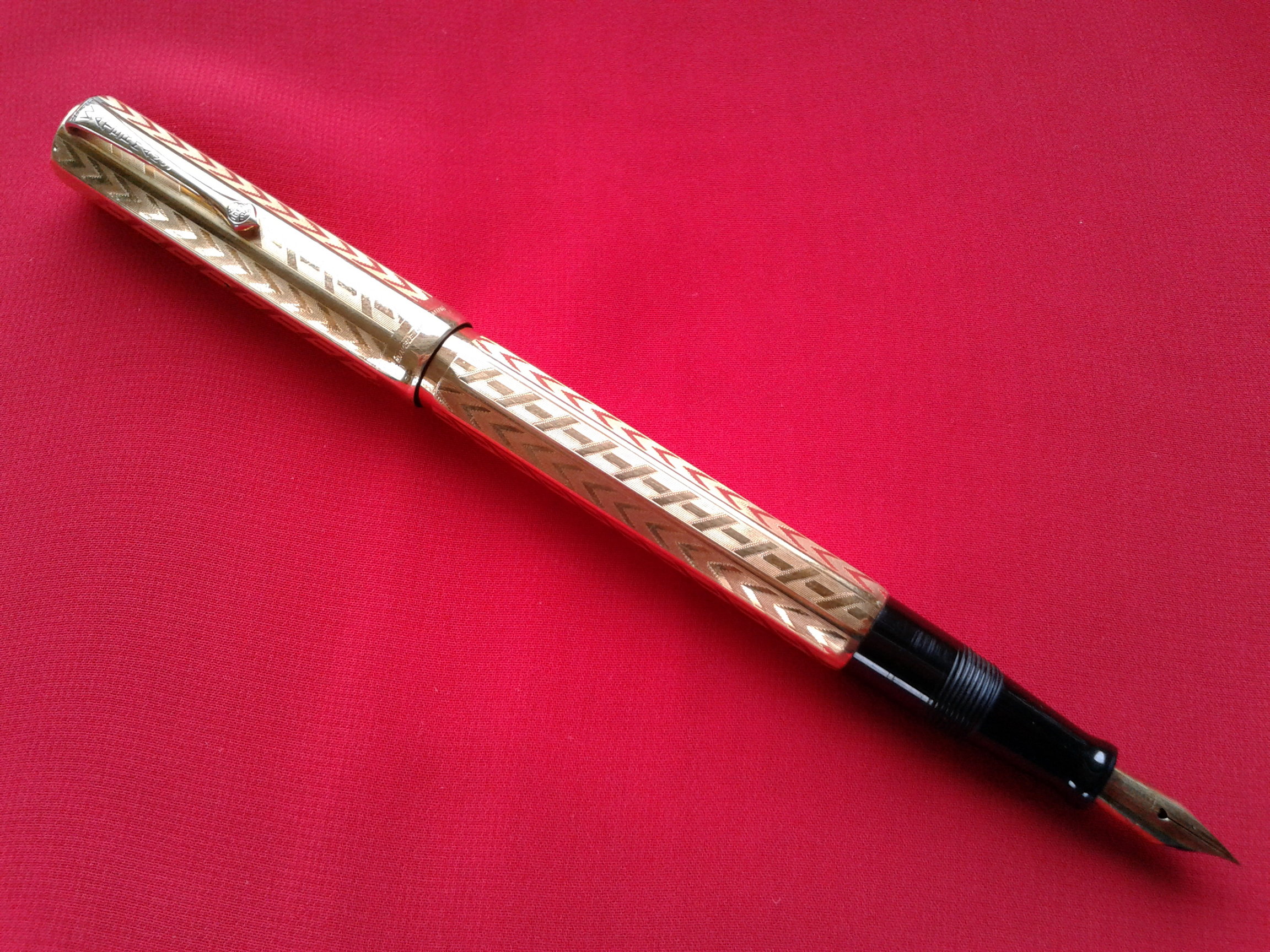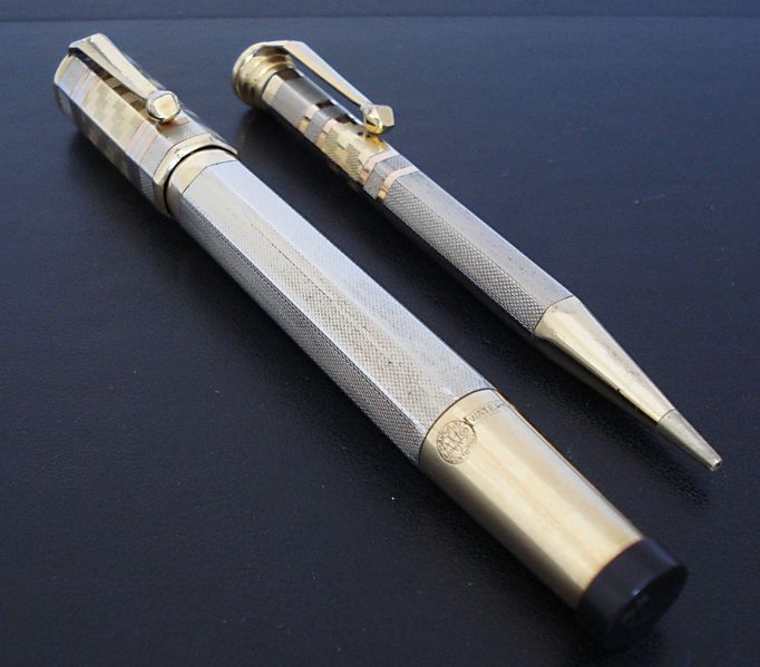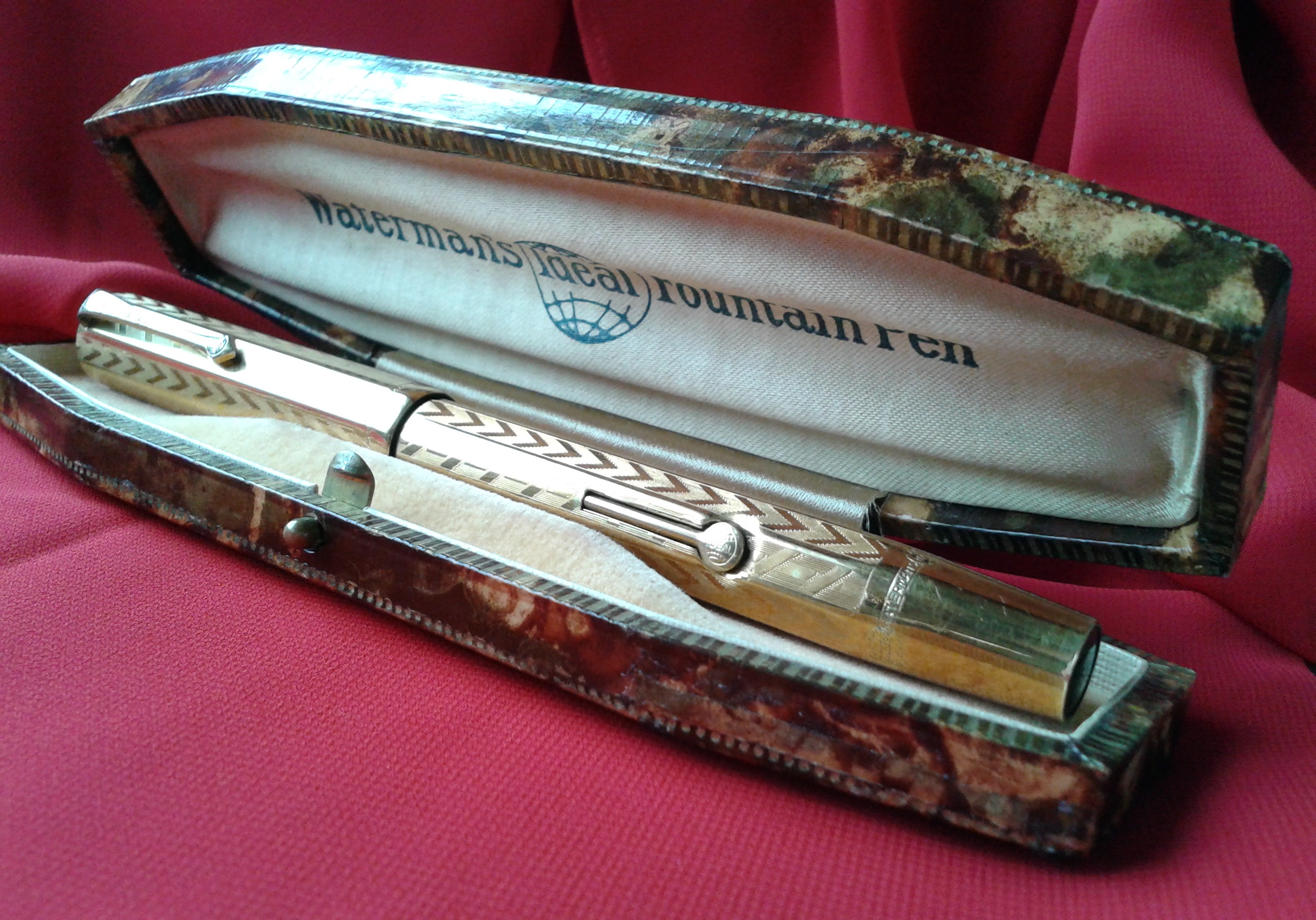 Foto di una Waterman 42 e della matita meccanica abbinata con rivestimento sfaccettato laminato in oro di tre colori (giallo, rosa, bianco) forse di produzione Kosca. Contributo di Fabio (utente forum fountainpen.it fabbale09).