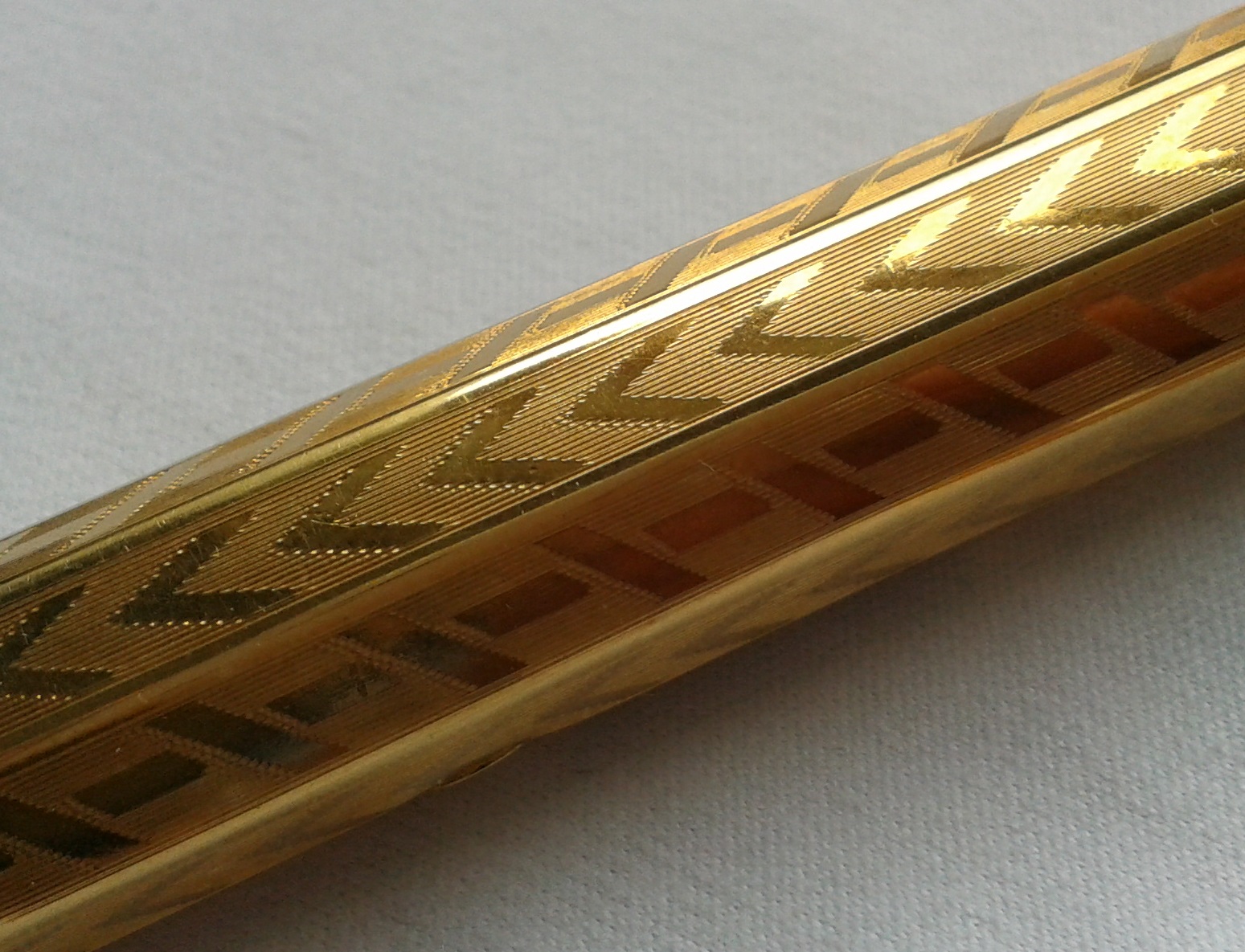 La decorazione della lamina è, nella sua ascetica essenzialità, un capolavoro di eleganza Art Déco: decoro a guilloché (sulle macchine a controllo manuale per questa notevole lavorazione si veda il Wiki https://www.fountainpen.it/Guilloch%C3%A9 )