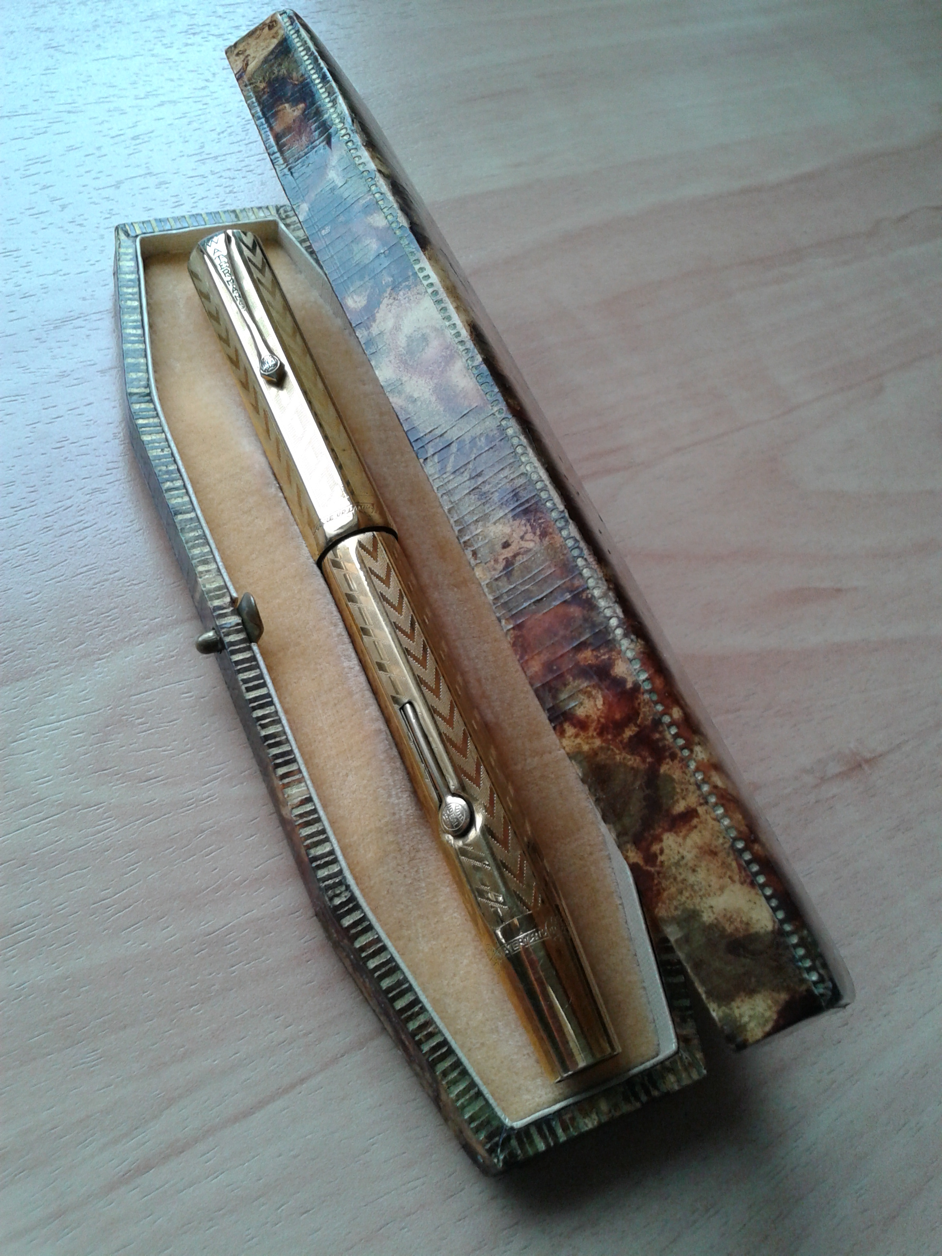 Una volta a casa ho dovuto dedicare tutte le mie amorevoli cure alla scatolina (lunga 16 cm., larga quasi 5 cm. per 50 gr. di peso, rivestita di carta lucida dorata e marmorizzata), poichè la stilografica era proprio in condizioni pari al nuovo... :mrgreen: