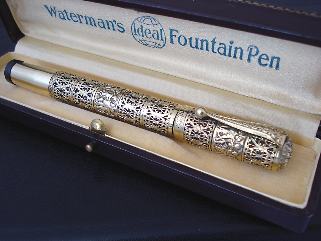 Foto di una Waterman 42 con rivestimento italiano laminato in oro e decorazione di putti. Contributo di Fabio (utente forum fountainpen.it fabbale09).