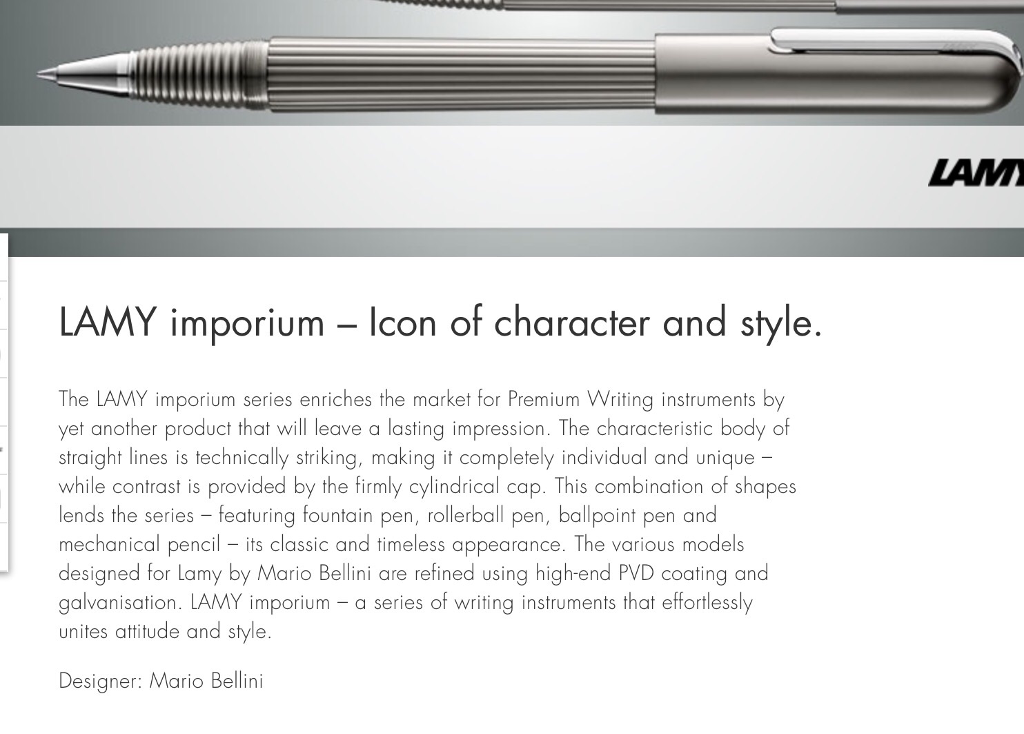 Forse quella vaga allusione alla colonna (papiriforme sul fusto, tortile sulla sezione, se la foto non mente) ha suggerito ai soloni del marketing della Lamy il nome cacofonico e pseudo-antico di Imporium, mai pronunciato prima da lingua umana (in nessuna delle lingue, vive e morte), che tuttavia in modo surrettizio riecheggia "Emporium" (e certo Lamy di cartolerie ed empori se ne intende) e, tremate con me nemici della Safari, "Imperium": Safari in saecula saeculorum!!!