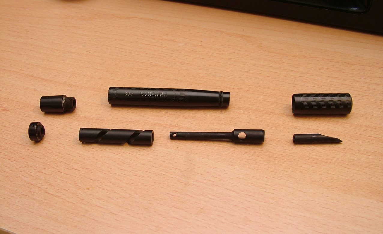 Per smontare il tutto basta dare qualche colpetto con un punzone piatto che vada ad interessare SOLAMENTE L'ASSE DEL FONDELLO, ovvero il cerchio più grande, senza interessare la spina. Solitamente è un'operazione facile e non occorre nessuna violenza. Sarebbe molto utile però disporre di un supporto con un foro dove entri la parte filettata del fondello e che il supporto sia sollevato dall'appoggio quanto basta per lasciare sfilare la spirale.