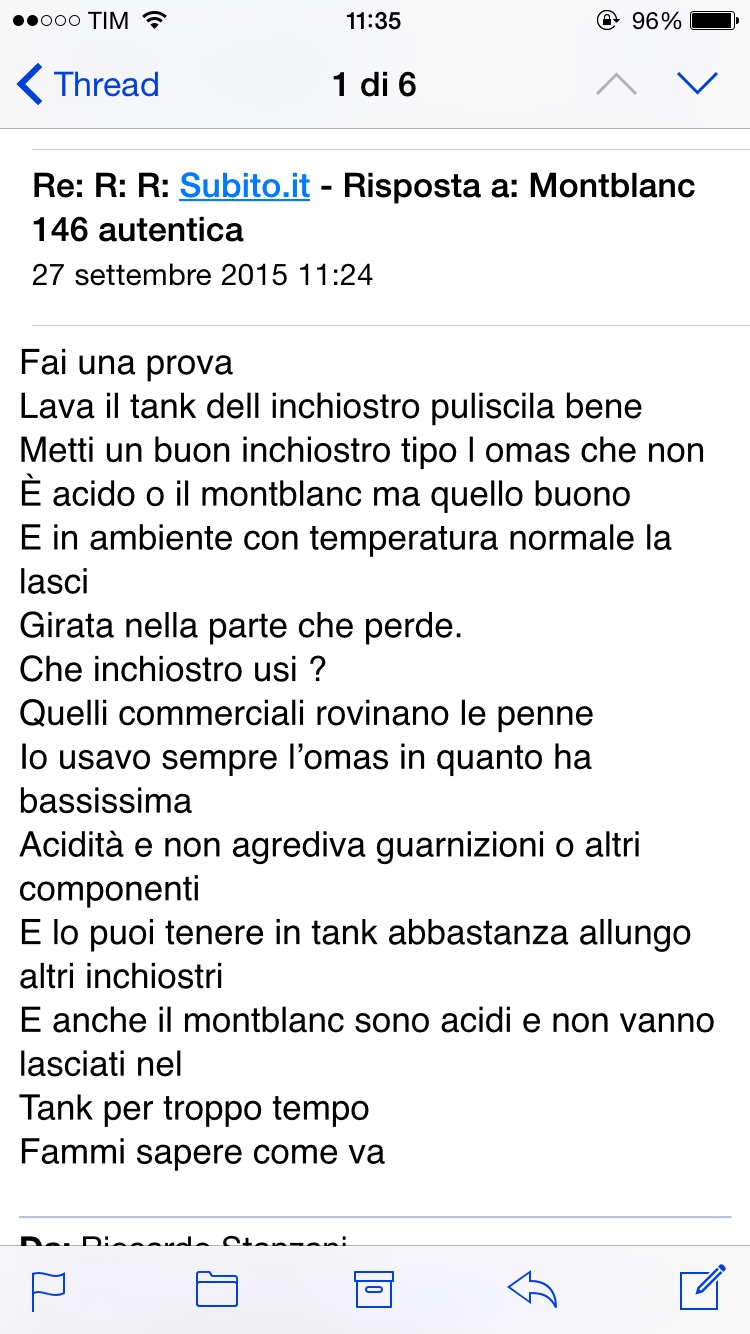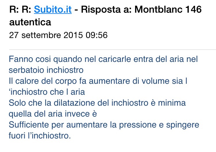 Ciao a tutti. La mia Montblanc ha un problema: quando si svita il fondello per ricaricare o se innavvertitamente fa piccole rotazioni mentre è nel taschino perde. In particolare durante la fase di ricarica si vedono proprio le bolle di aria e inchiostro a livello dell'anello dorato sul fondo.