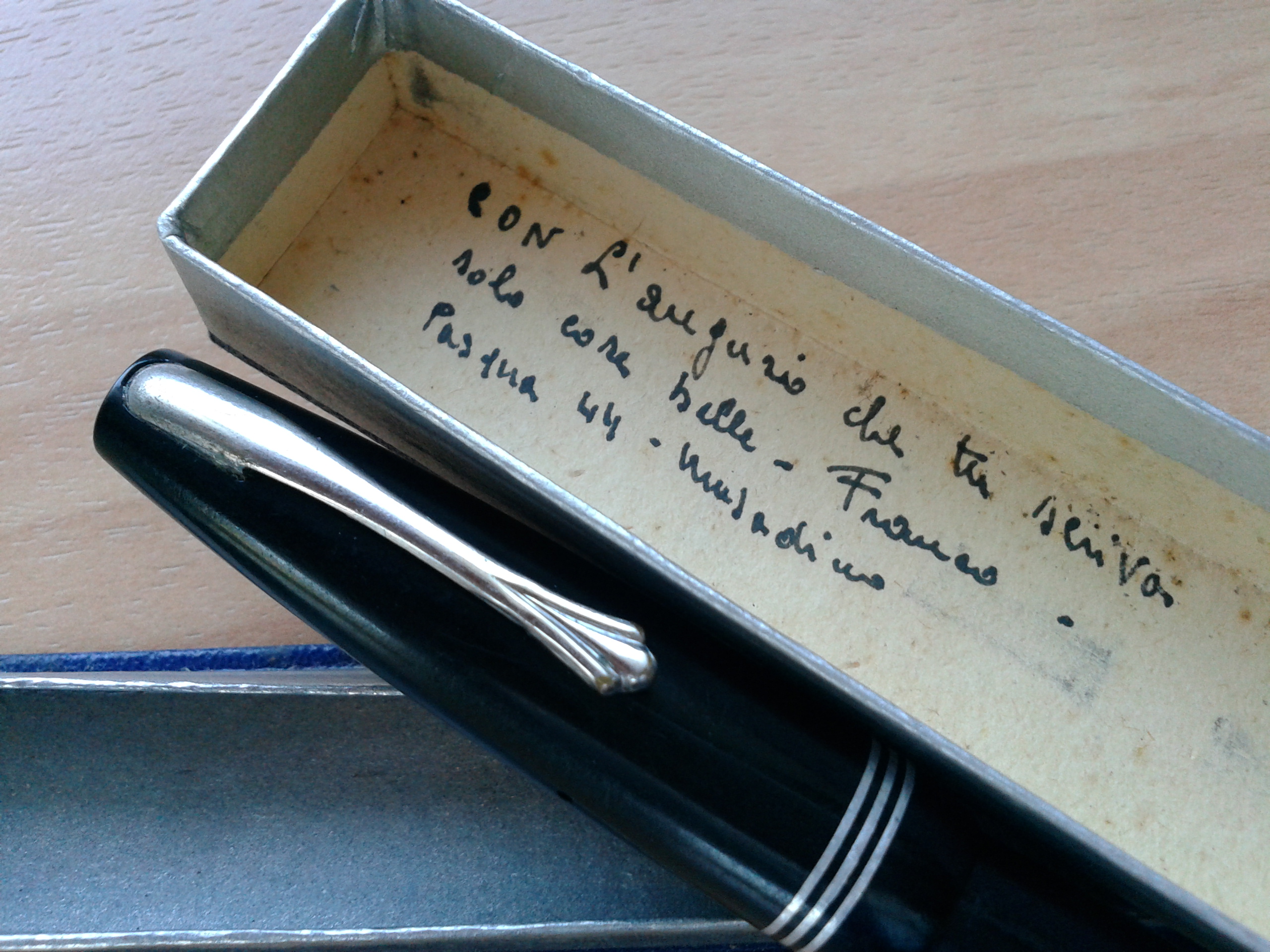 D' accordo con le opinioni sulla scritta all' interno della scatolina : è sempre affascinante leggere ciò che si è scritto tanti anni fa e purtroppo di questa penna come di migliaia di altre sapremo solo questo , ma è già qualcosa.