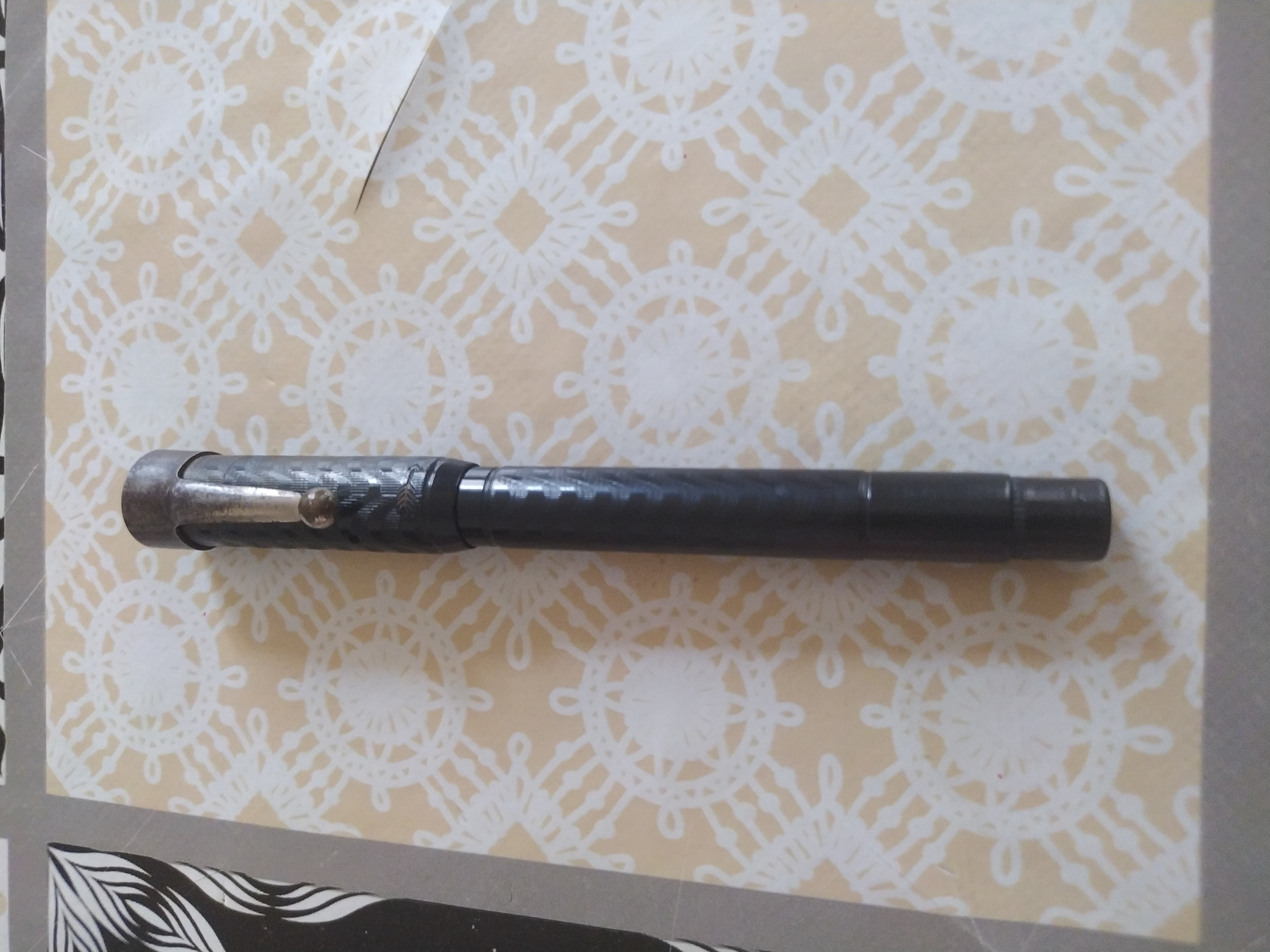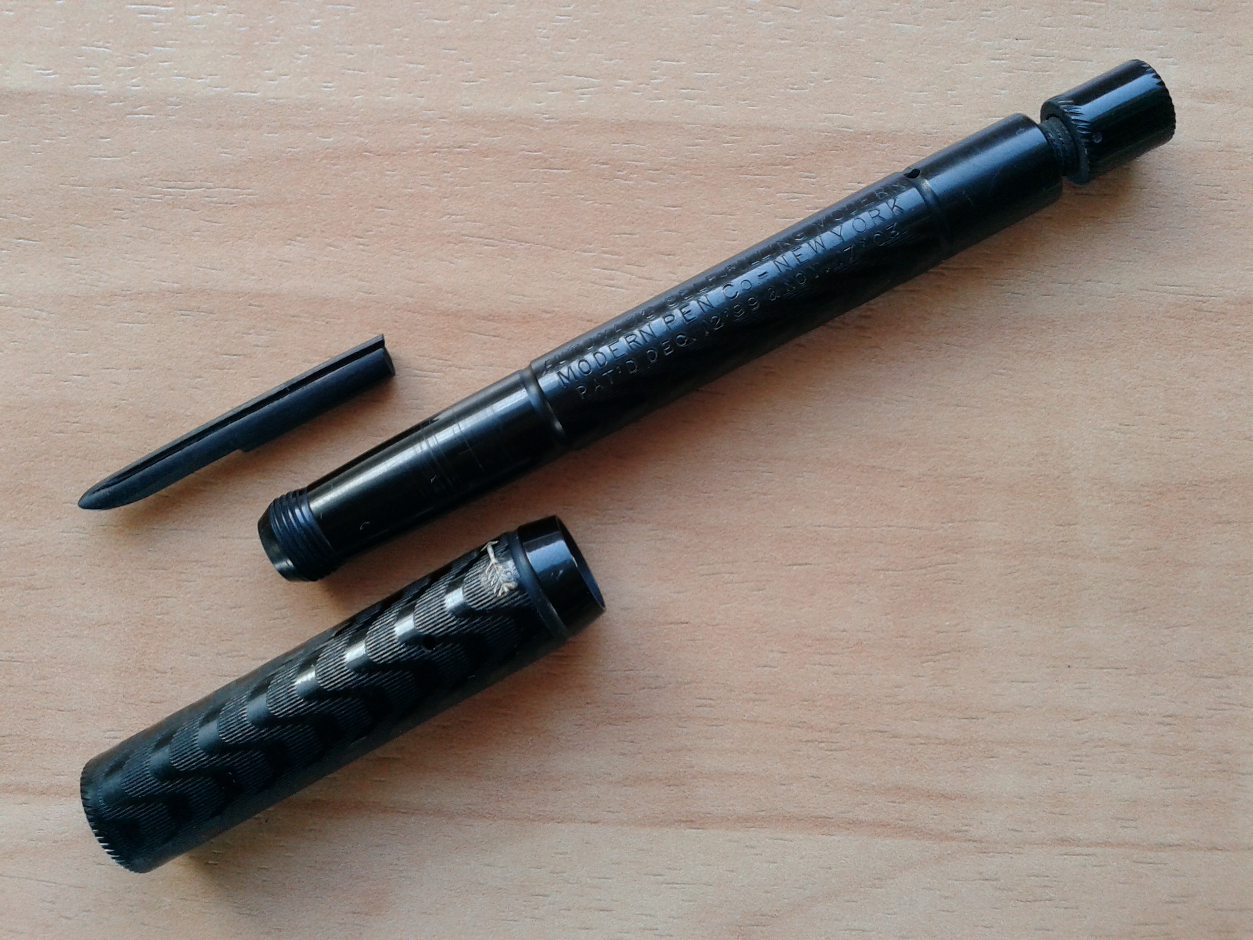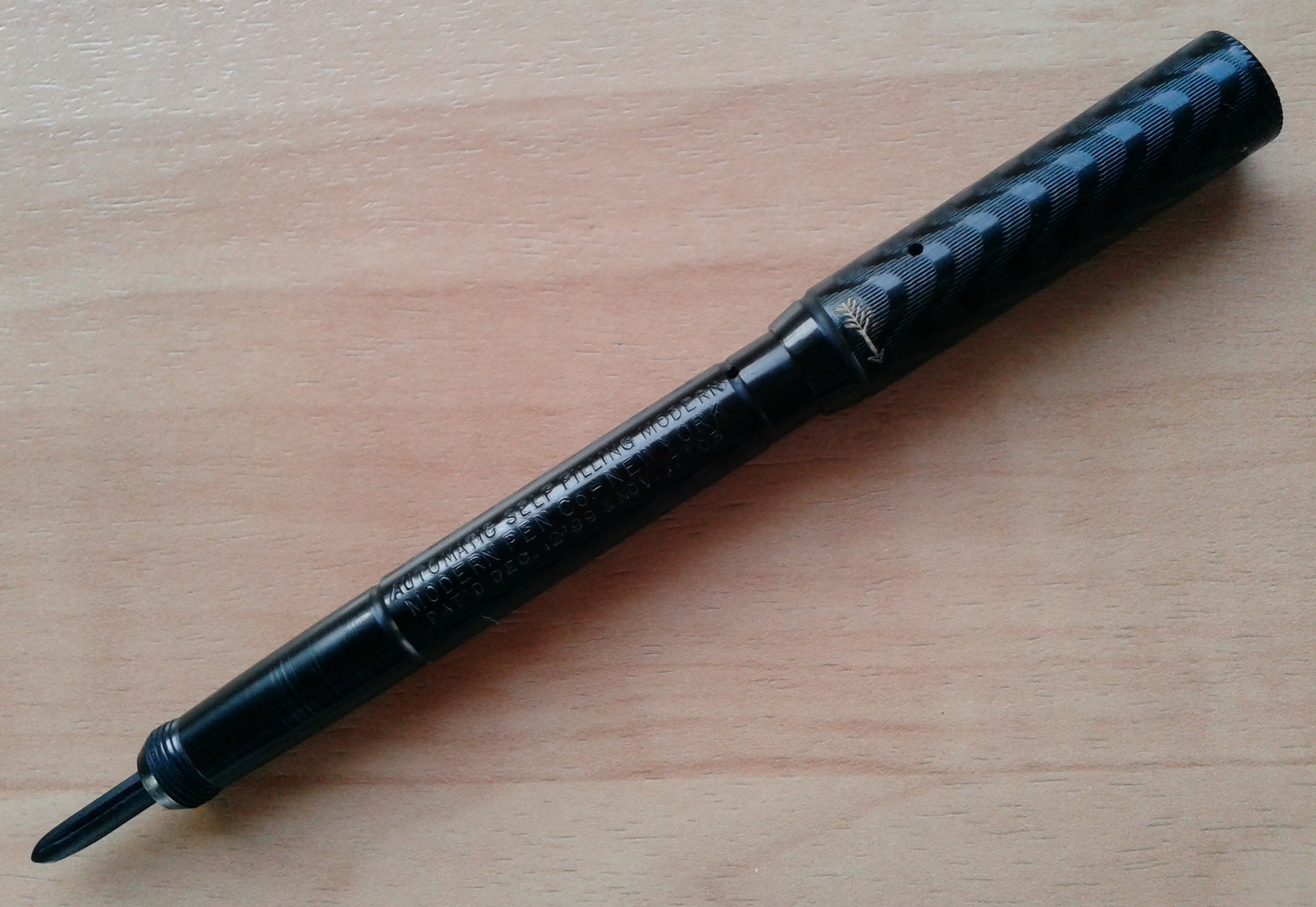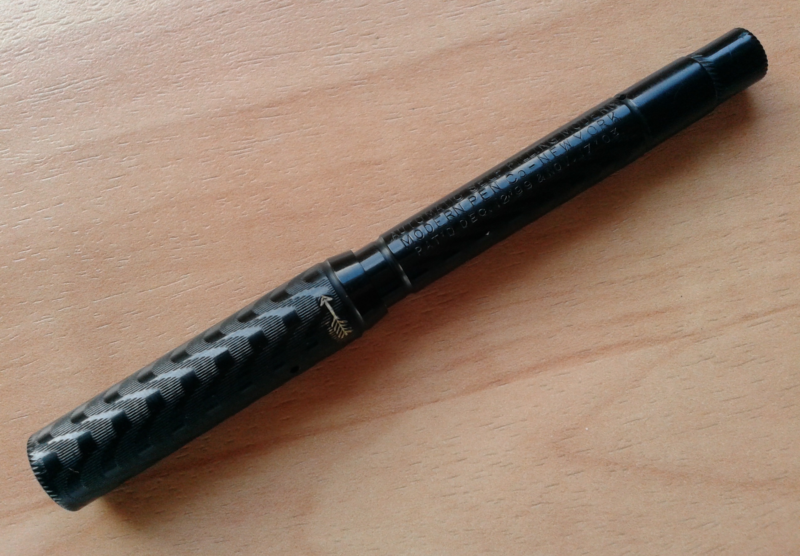 AUTOMATIC SELF FILLING MODERN della MODERN PEN Co. di NEW YORK in ebanite nera cesellata (BCHR), pennino mancante, caricamento a torsione ("twist filler"), fabbricata dalla Arthur A. Waterman Company di New York U.S.A., nel 1911. Le misure