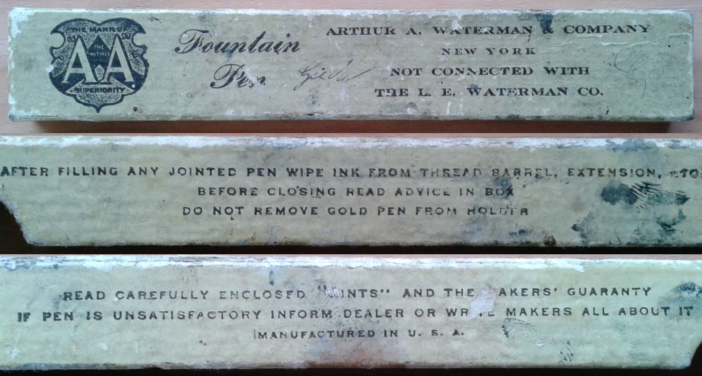 La stilografica in presentazione potrebbe essere stata prodotta fra il 1910, data dell'ultimo brevetto citato, ed il 1912 quando fu reso obbligatorio il disclaimer "Not connected with the L.E. Waterman Co.". Allora il disclaimer venne stampato anche sulle scatole, ma la penna non ce l'ha. Potrebbe essere stata prodotta proprio durante la discussione della causa, per mandare avanti la produzione senza buttare via il manufatto in caso di condanna a non più utilizzare il nome "A.A. Waterman".