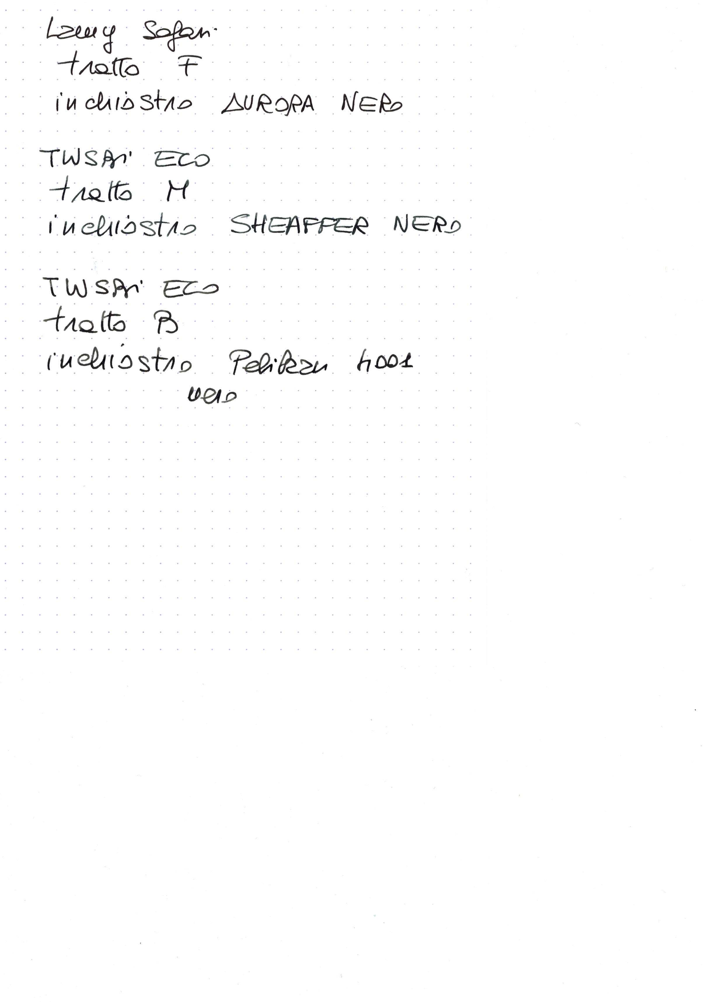 Concludo segnalando che il mio tratto di riferimento è il Fine europeo perciò vi chiedo cortesemente anche una mano nel trovare il pennino che più si avvicini a tale misura. Cercando su internet ho trovato che la Eco dovrebbe scrivere più fine.