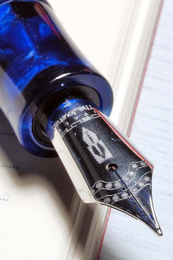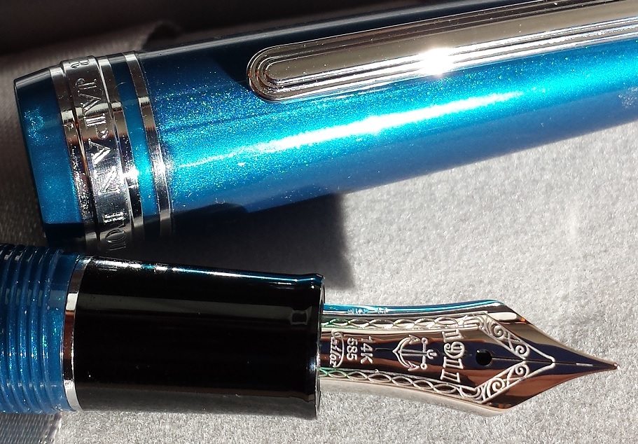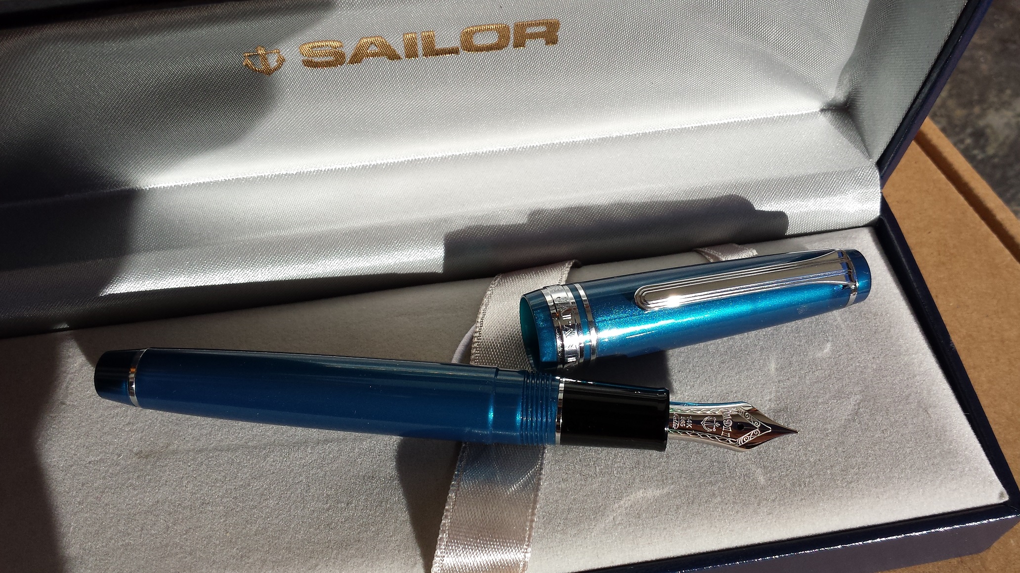 Le ho dato da bere un Iroshizuku Shin-kai, inchiostro che non mi è mai piaciuto particolarmente, ma volevo provarlo su questa. Tratto fine ma non finissimo, liscia come l'olio ma ha quel minimo di feedback durante la scrittura, che io preferisco rispetto alle penne che scivolano troppo sulla carta. Flusso medio/abbondante, come piace a me. Alimentatore perfetto: per provarla ho consumato una intera carica di converter, scrivendo parecchie pagine A4 di continuo, senza che la penna mostrasse segni di "stanchezza". La mia reca il numero 5467. In questa penna lo Shin-kai, secondo me, è bellissimo e dà il meglio di se. Farò una recensione approfondita appena possibile.