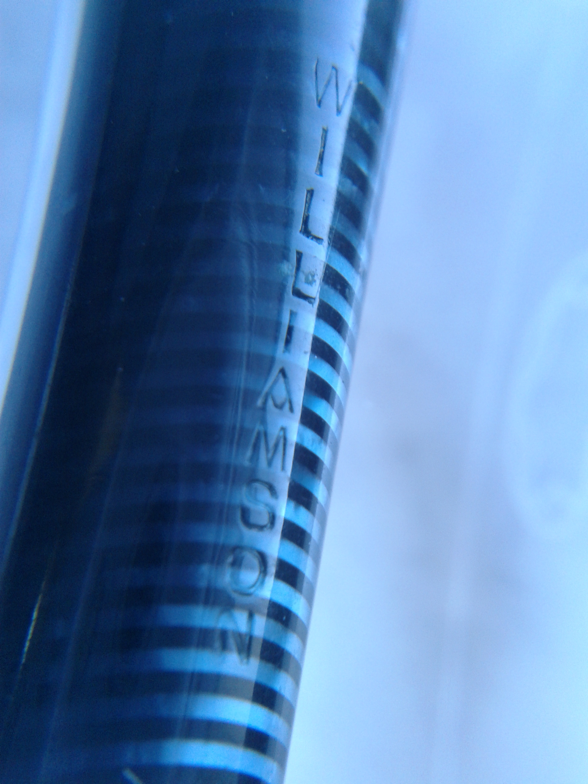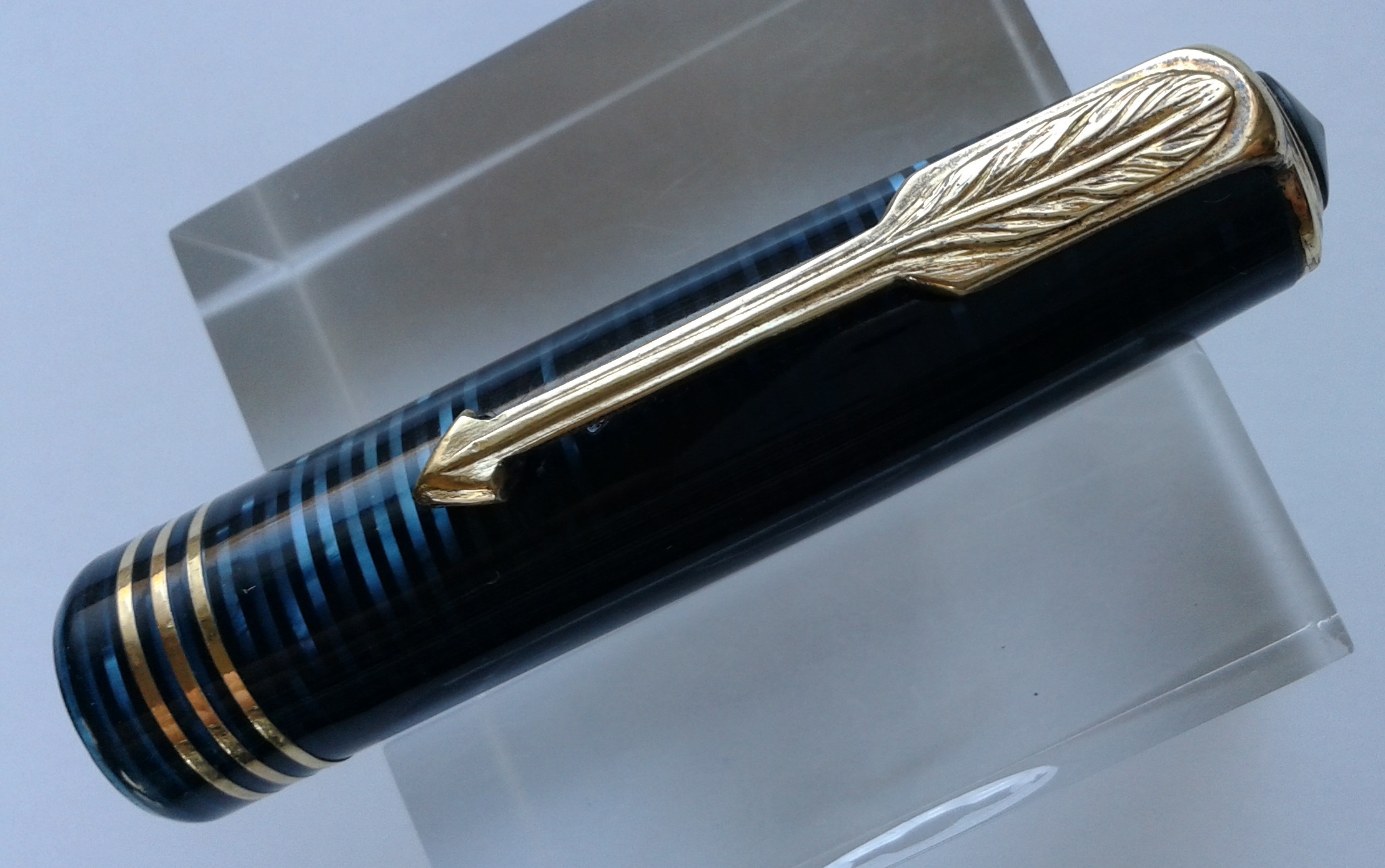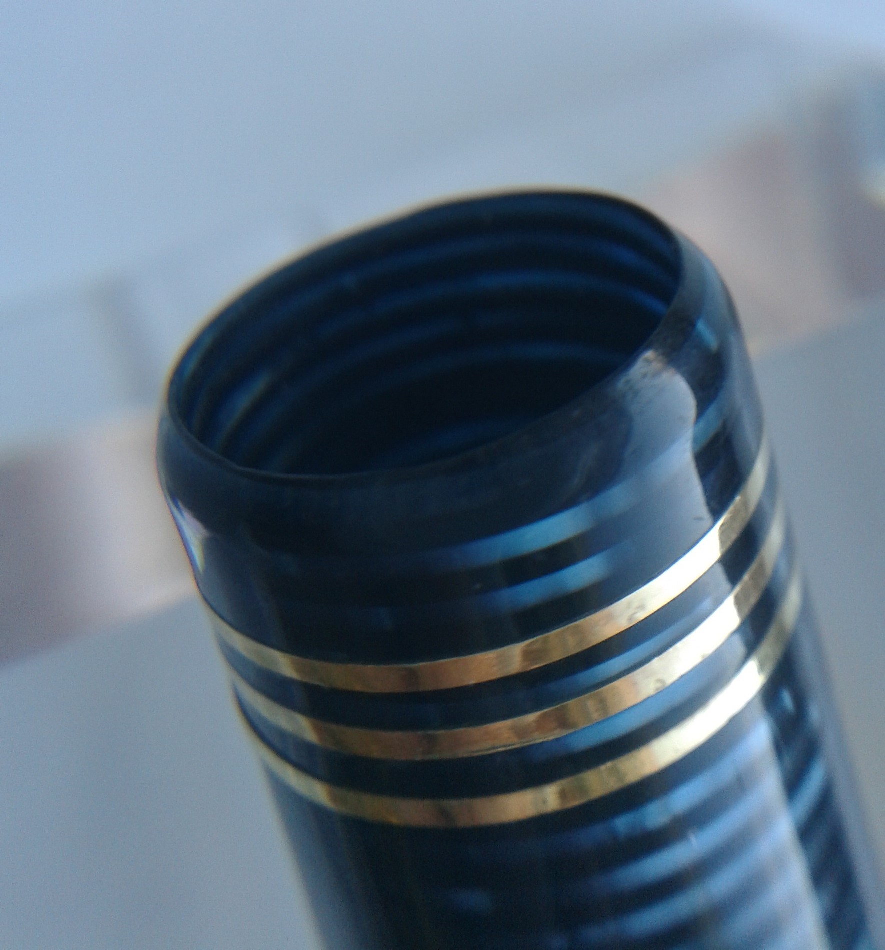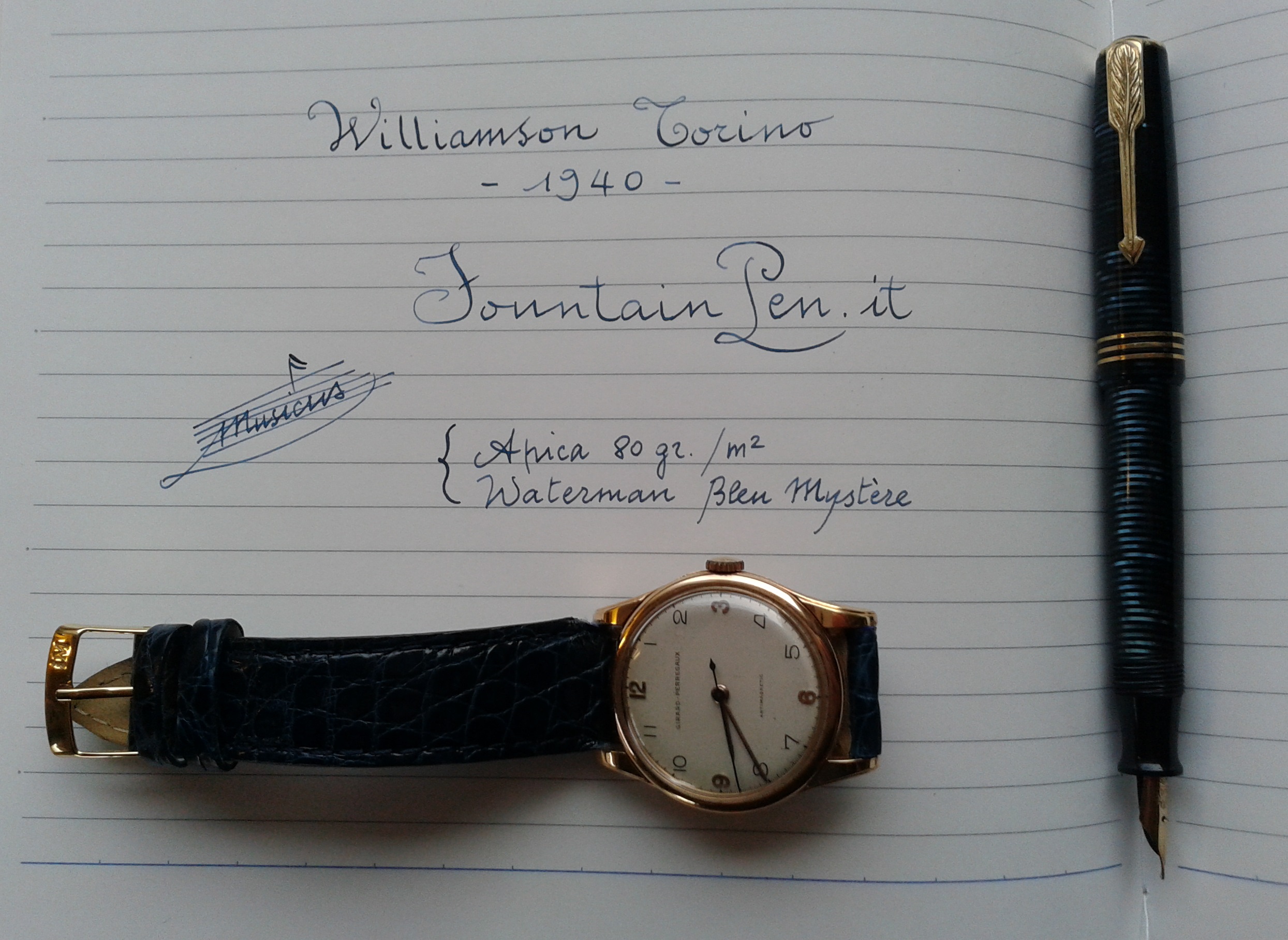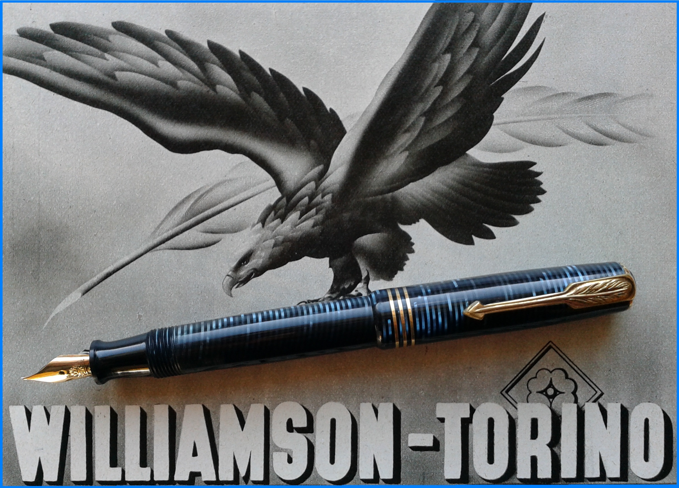 WILLIAMSON TORINO* misura piccola** in celluloide anellata blu tornita da barra piena, parti metalliche a vista laminate in oro, pennino Williamson in oro 585, caricamento a pulsante di fondo, produzione Italia anno 1940. * Non è noto il nome di questo modello cilindrico.