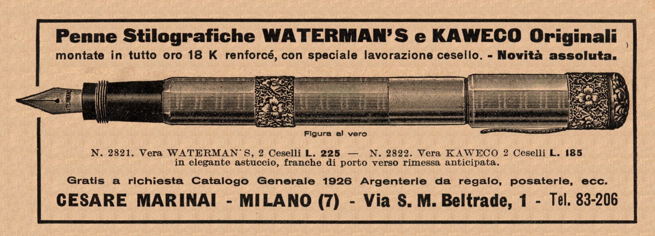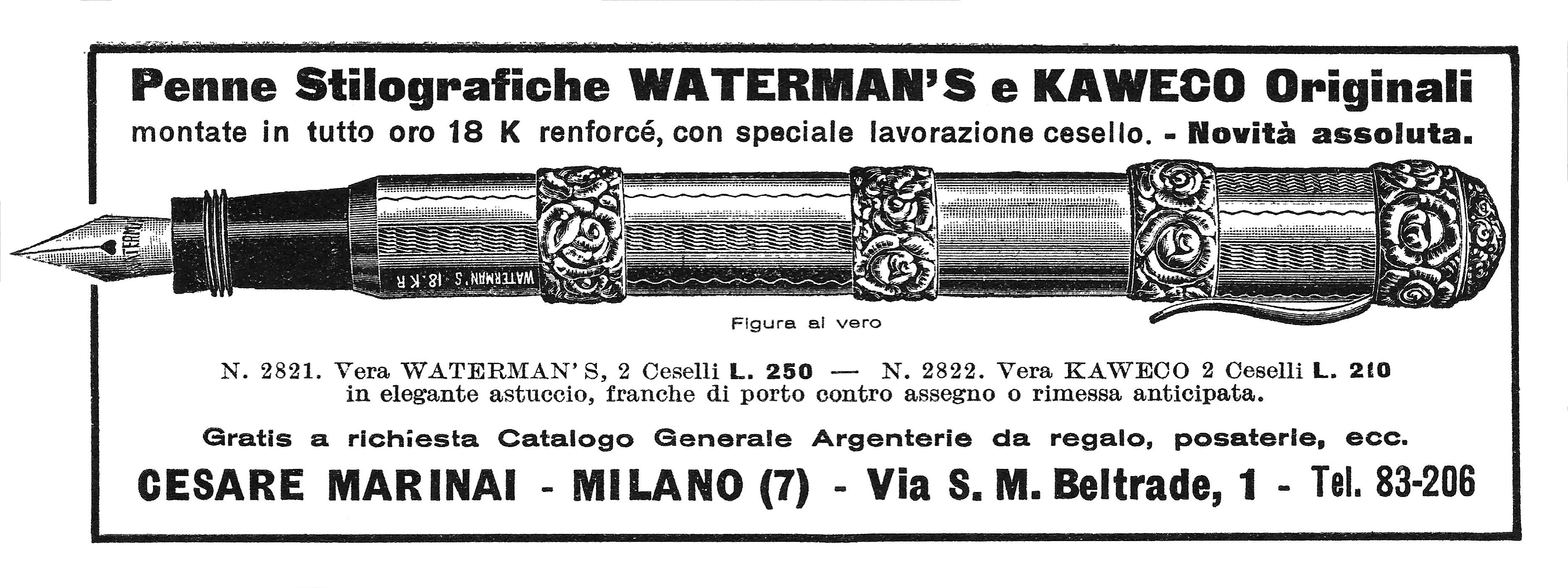 Dall'ultima pubblicità apprendiamo, inoltre, che i rivestimenti in oro 18 K.R. per le penne Waterman vendute sul Catalogo Marinai, poichè proposti insieme a penne marchiate "Angloamer" e "Ideal", sarebbero con buona probabilità anch'essi riconducibili alla produzione dei Fratelli Cavaliere di Milano.