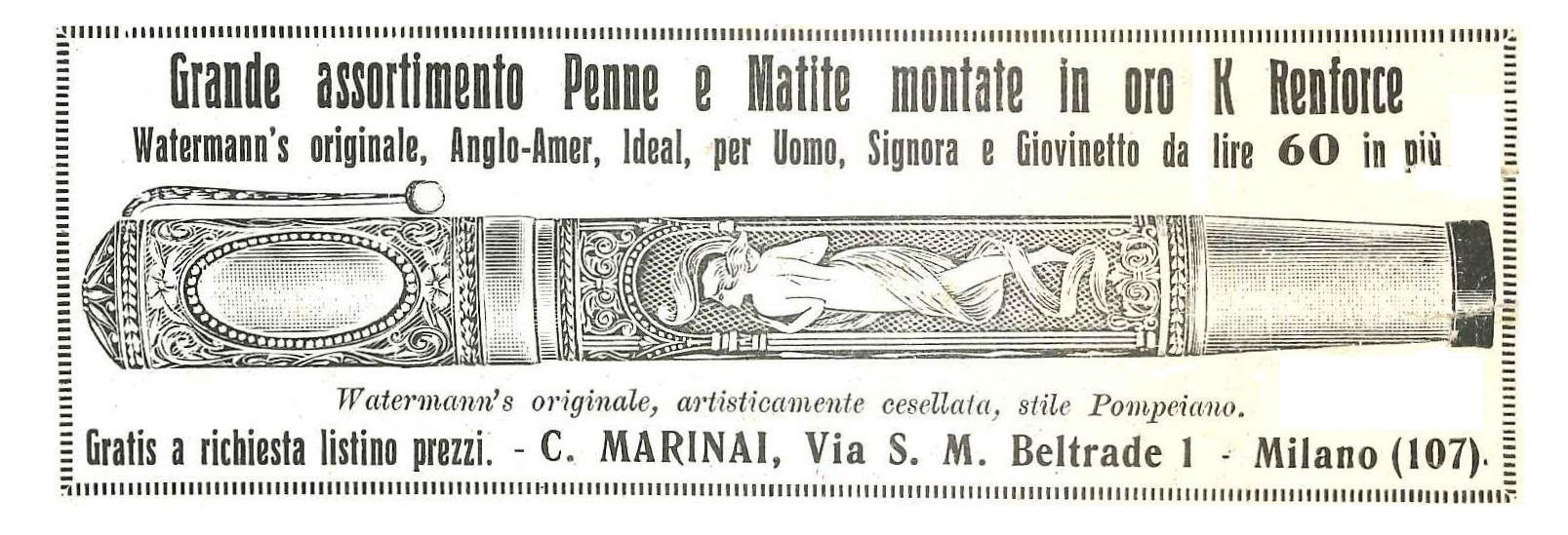 Lo stile dei rivestimenti in oro 18 K.R. delle penne stilografiche proposte dal Catalogo di vendita per corrispondenza della ditta Cesare Marinai di Milano subì, nel breve periodo tra il 1924 ed il 1928, quelle che definirei "paurose oscillazioni": grazie all'archiviazione sul nostro fantastico Wiki delle inserzioni pubblicate sulle riviste più "alla moda" del periodo, possiamo essere testimoni di un radicale quanto repentino cambiamento di gusto: