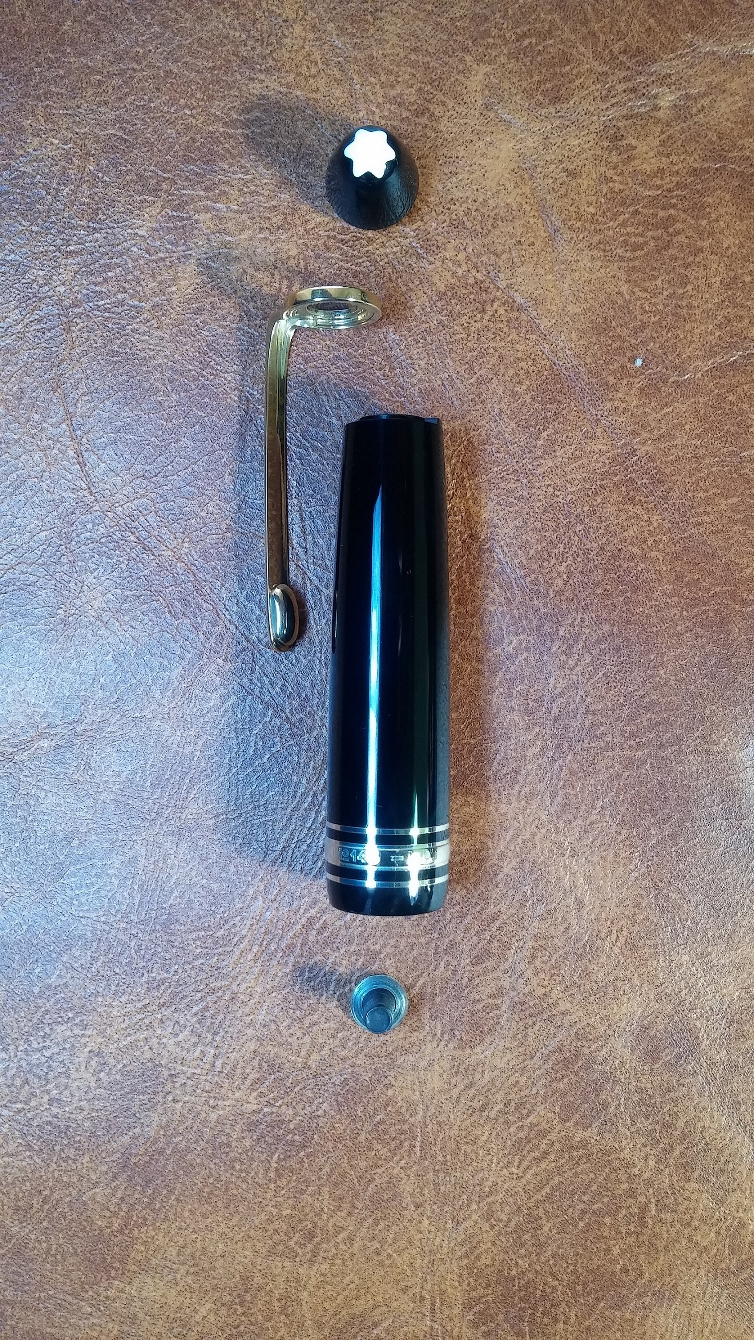Qualche settimana fa, mi sono divertito a restaurare una Montblanc Meisterstück 146 parecchio rovinata. La penna presentava dei graffi profondi sul cappuccio e sul fusto una crepa sotto il fondello (che non inficiava la tenuta) il pennino era inserito male nella sezione e presentava dei graffi e in generale la resina era opaca e piena di micro-graffi e le dorature scure Come prima cosa, ho smontato il pistone (su youtube ci sono due tutorial molto completi) poi ho estratto il gruppo pennino/alimentatore dalla sezione non senza difficoltà in quanto risultava incastrato per un errato montaggio. Ho poi smontato tutte le parti del cappuccio e con tanta pazienza, pasta Iosso e panni in microfibra ho iniziato a rimuovere tutti i graffi dalle parti in resina, lucidare la parte in ottone del pistone e le parti dorate come la clip. Questo è il risultato con la penna ancora tutta smontata qui una macro del pennino lucidato (purtroppo uno dei graffi più profondi non è stato possibile rimuoverlo, ad occhio nudo è quasi invisibile ma se si osserva con una lente d'ingrandimento si nota che la parte platinata è completamente abrasa e si vede la parte in oro sottostante) qui altre foto della penna ancora smontata (segue al post 2)