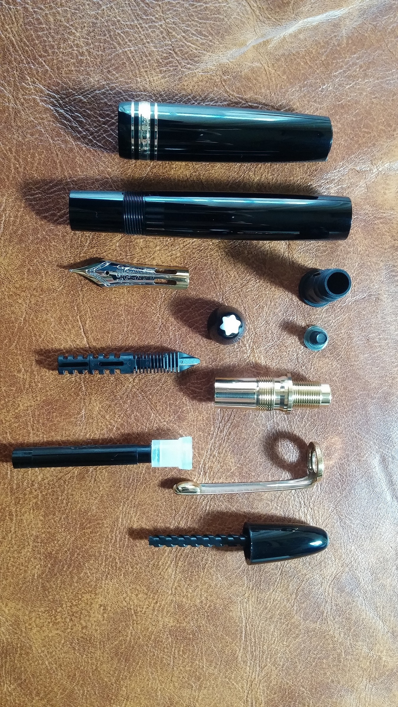 Qui un insieme di tutti i pezzi prima di essere rimontati Dopo aver lubrificato con del grasso siliconico il pistone ho provveduto a rimontare la penna e... voilà il risultato finale Sono molto soddisfatto del risultato, certo la penna non è perfetta ma a me occorreva una penna per tutti i giorni da portare sempre con me e da utilizzare per scrivere sull'agenda o prendere degli appunti al volo.