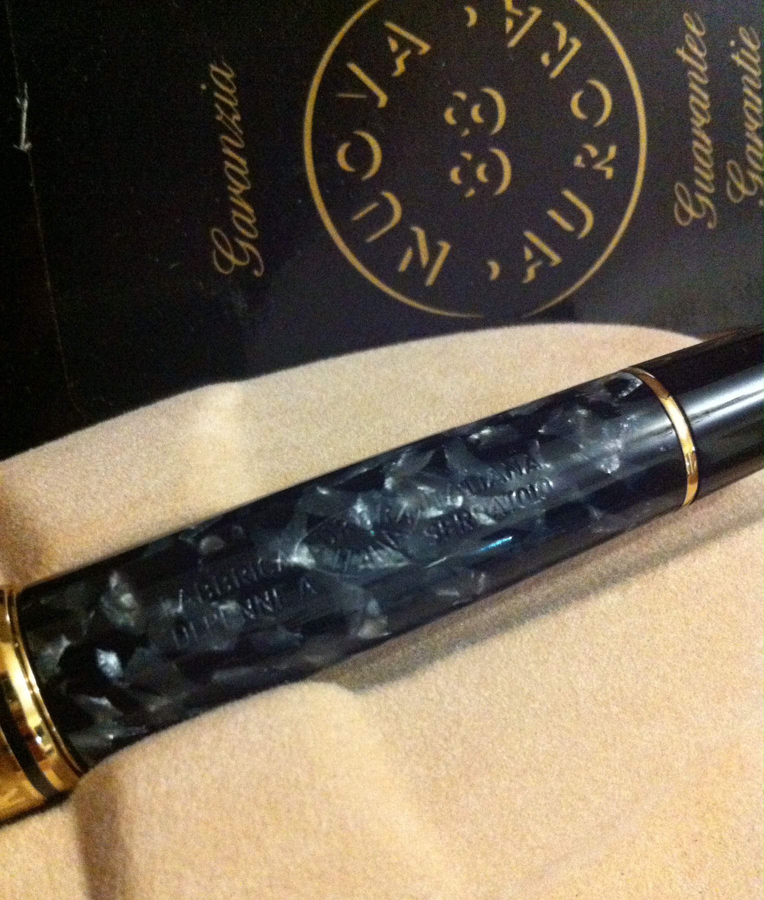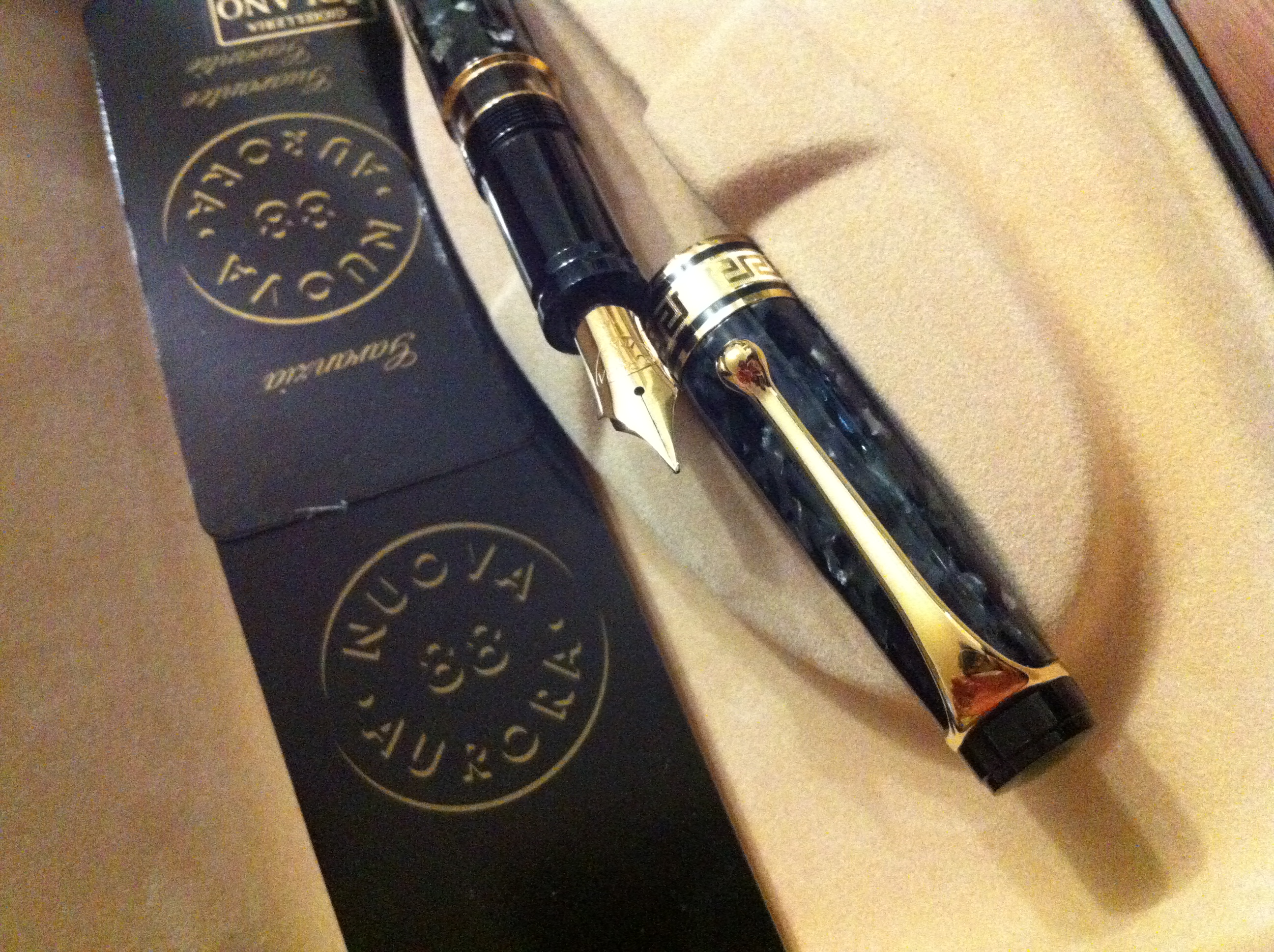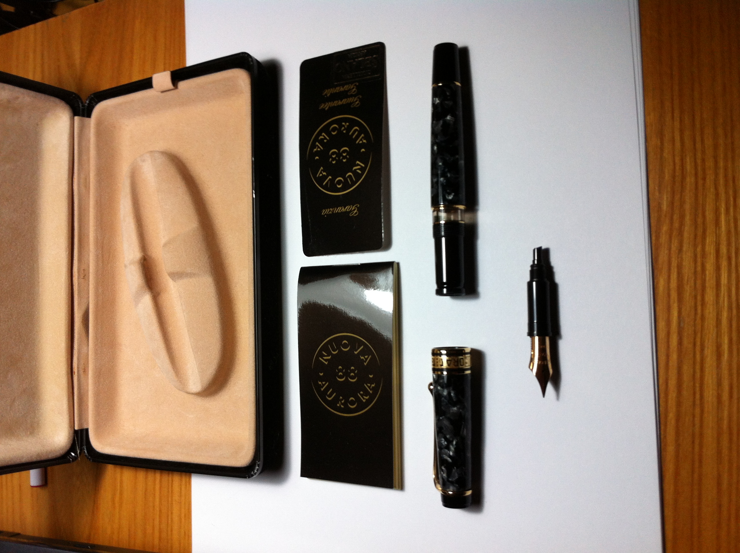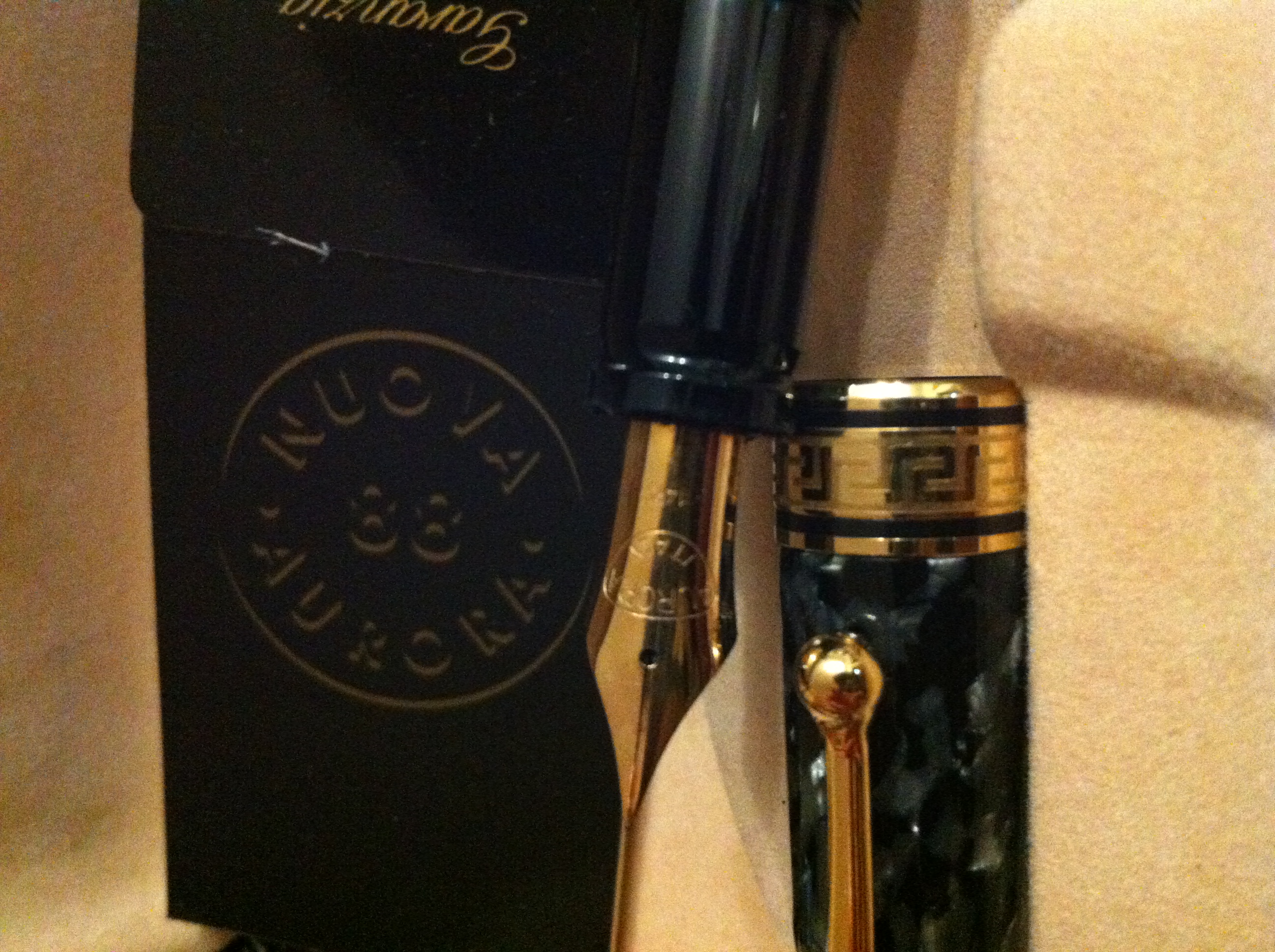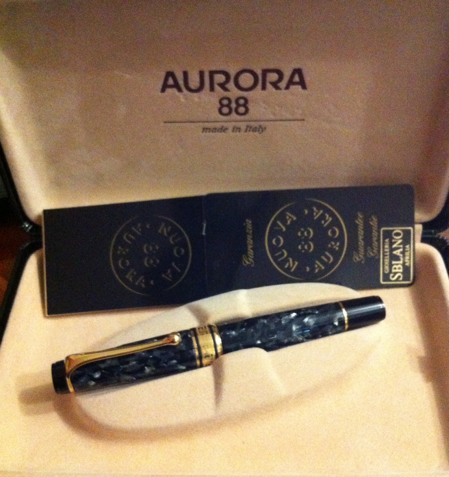 La Optima delle foto è la versione "auroloide" (il nome con cui l'Aurora indicava la celluloide quando iniziò ad usarla) marmorizzata; la greca del cappuccio la data a prima del 2008