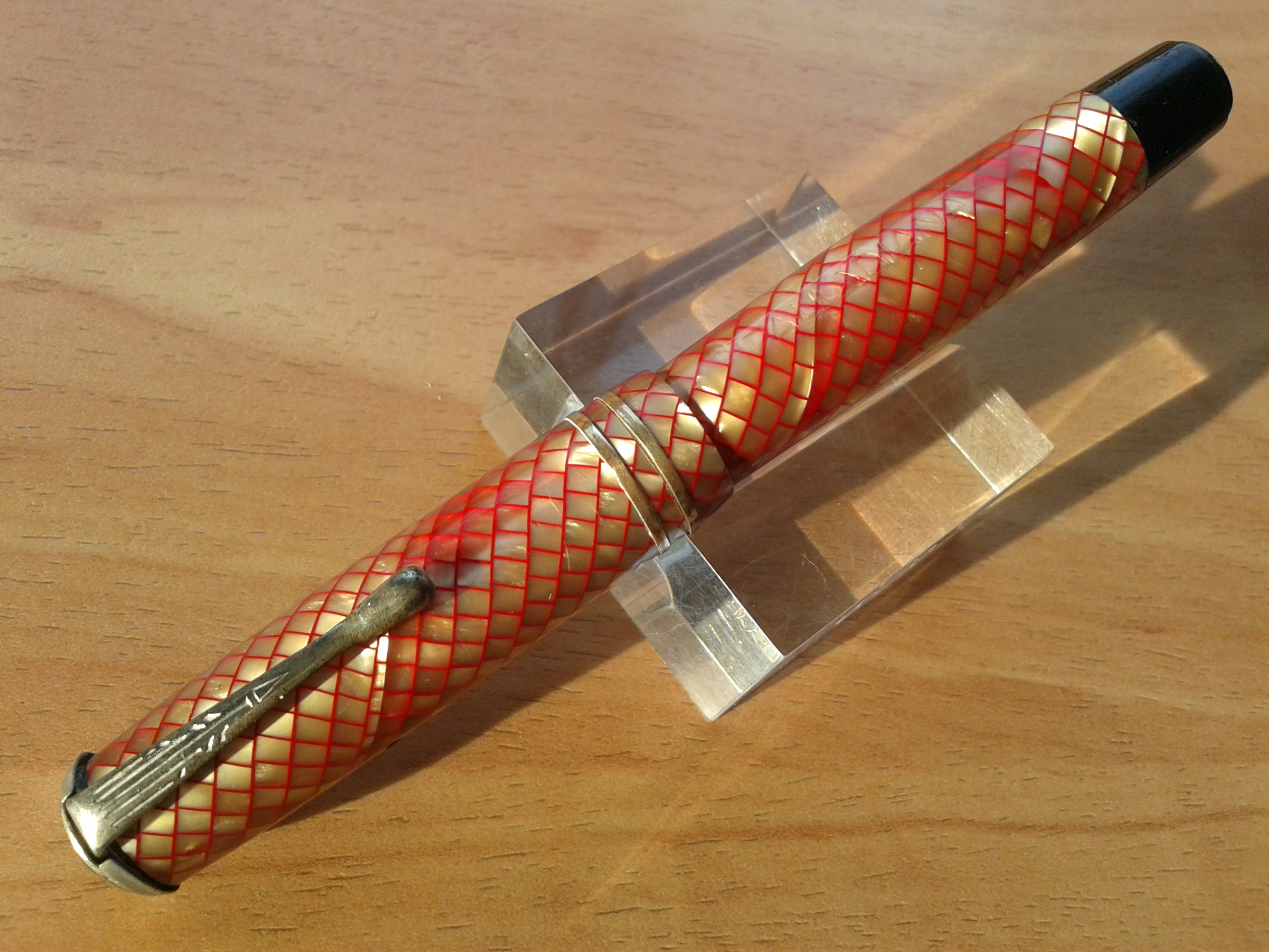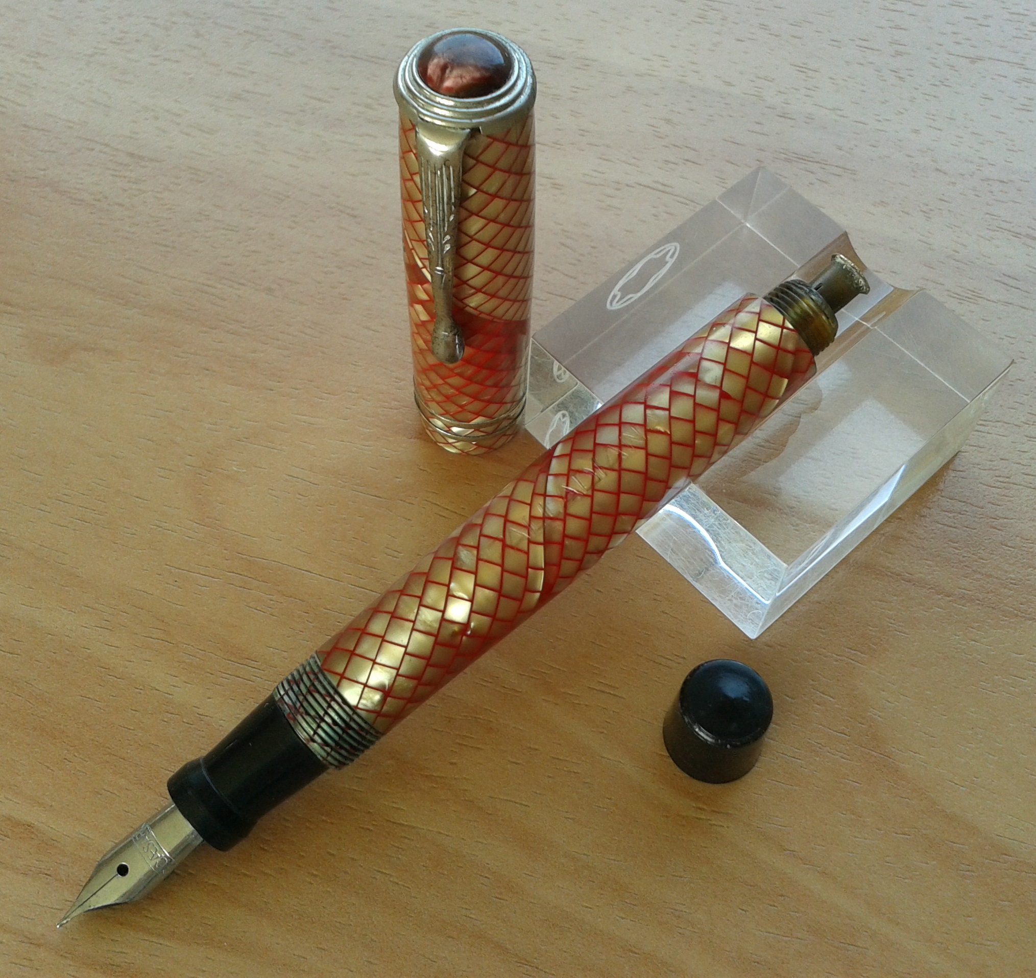 La penna PALLADIANA in celluloide red snake-skin, pennino in acciaio Caesar, parti metalliche a vista cromate, caricamento a pulsante di fondo, produzione Italia anni 1940.