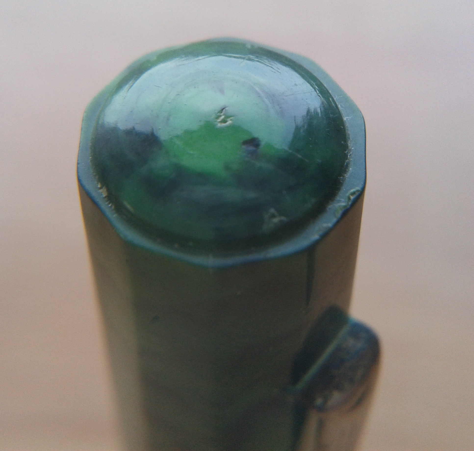 La (seconda ) penna JUVENTUS in galalite variegata verde-nera sfaccettata, lunga circa 11,5 cm., con pennino in acciaio, parti metalliche a vista cromate, caricamento a pulsante di fondo, produzione Italia fine anni 1930.