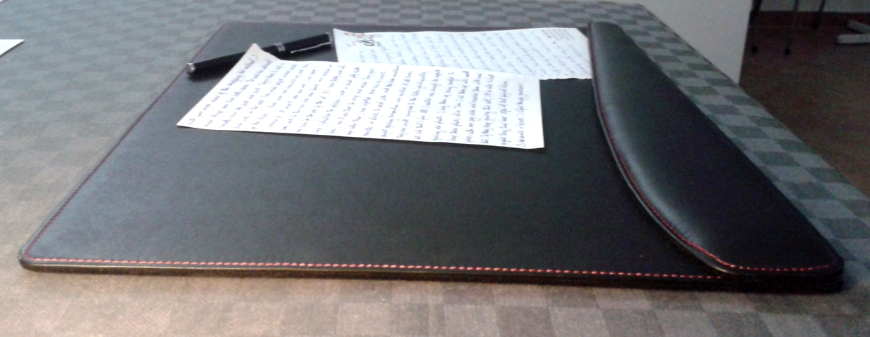 Ribadisco che io uso quasi sempre fogli singoli e di scarsa qualità (carta per fotocopie, fogli di vecchie agende) ed è difficile trovare come base d’appoggio un buon compromesso tra il tavolo (troppo duro) e una base troppo morbida con la quale è facile lasciare solchi sul foglio. Ho sempre cercato degli “accrocchi” economici, ma alla fine non ero mai soddisfatto.