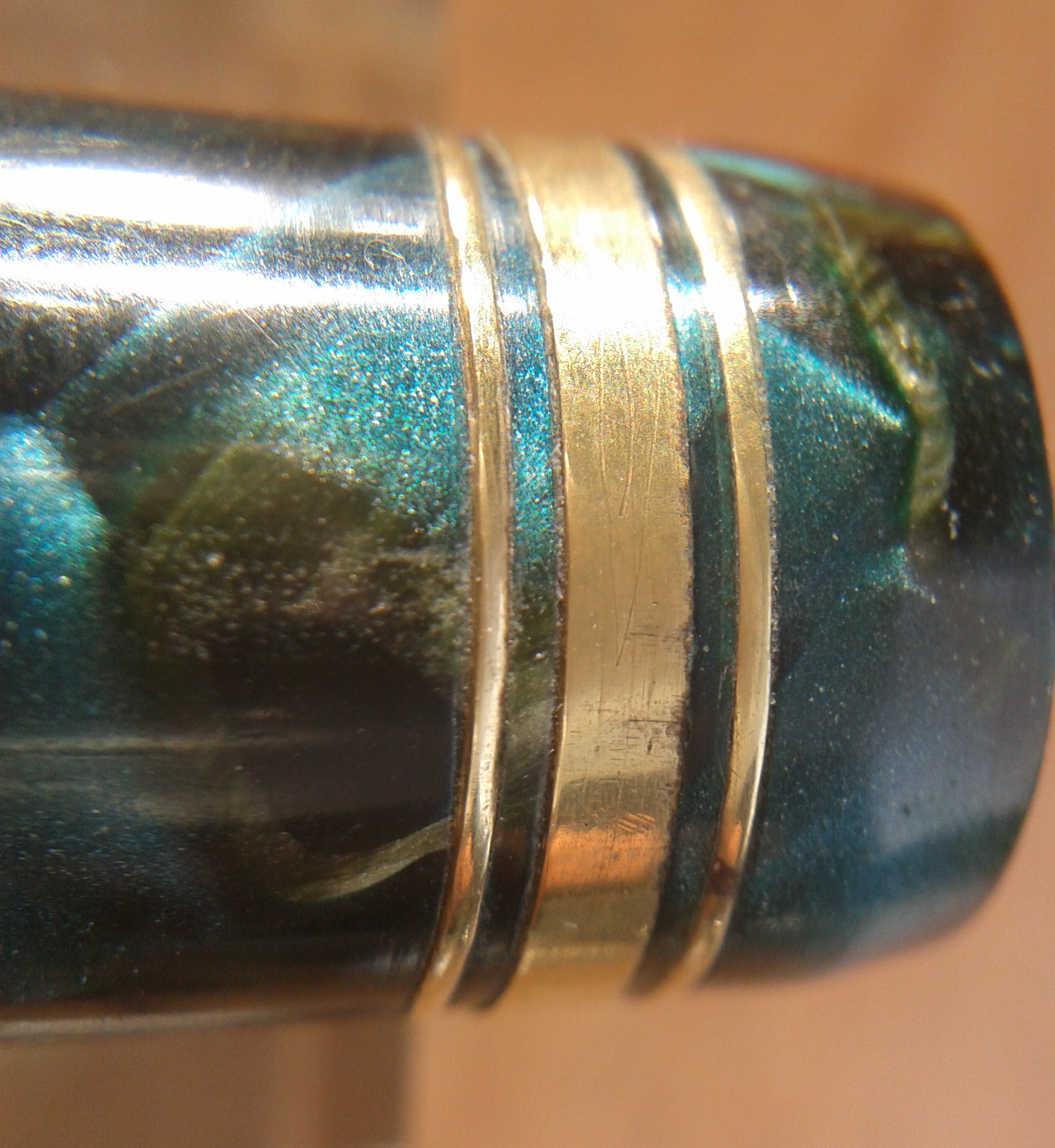 Gli anellini decorativi d'ottone, forse dorato all'origine, che troviamo lungo il corpo penna ed alla sommità del cappuccio non furono certo una novità, essendo stati precedentemente impiegati con eleganza sui modelli di lusso ("Extra") di alcuni Marchi di prima grandezza (fra gli italici Montegrappa ed Ancora, ad esempio). Sulla penna in presentazione hanno il difficile compito di separare (o meglio, unire) blocchi di materiali eterogenei: ad un esame attento, essi sembrano assemblati con grande cura, come anche i più tradizionali anellini con veretta che compongono la decorazione principale.