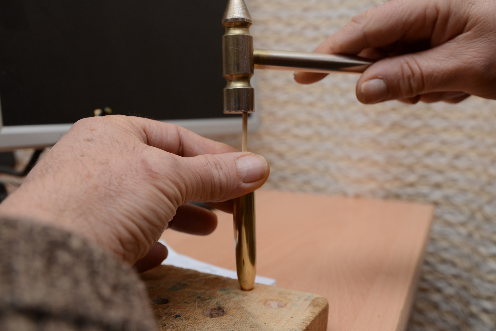 Ora possiamo iniziare il lavoro di "battilamiera" purtroppo non potevo fotografarmi mentre lavoravo, però è abbastanza semplice posizionare la cupola del cappuccio nel foro non passante della giusta dimensione passando nelle varie fasi dal più grande al più piccolo man mano che la l'ammaccatura diminuisce.