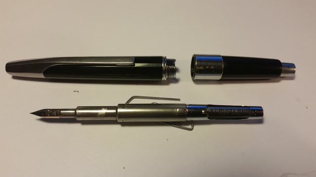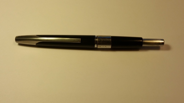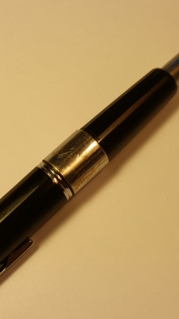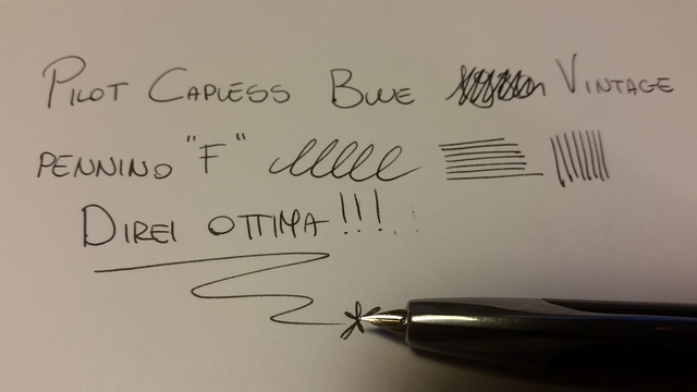 Dopo l'indimenticabile esperienza al Pen Show di Milano, vorrei condividere con voi uno dei miei tre "souvenir" della meravigliosa giornata. Da tanto tempo volevo provarne una, incuriosito dal suo design particolare e fuori dal solito. Sto parlando della celebre Pilot Capless! Tanto originale quanto affascinante, il suo meccanismo che permette al pennino di uscire e rientrare nel corpo con un semplice click, rende questa penna uno degli strumenti da scrittura più interessanti in circolazione. La mia è la versione degli anni 90 (almeno credo), il cui design più squadrato, il corpo sfaccettato e la clip che fa da continuazione alla parte superiore, la rendono, secondo me, più bella della versione moderna, tutt'ora in commercio. Scrive divinamente, con un pennino F in oro 14 carati, era incluso il converter areometrico. Purtroppo c'è un piccolo particolare che stona: più o meno in corrispondenza della filettatura che permette di aprire la penna, è presente una banda di acciaio piuttosto larga. A mio parere, questa banda non fa parte della penna, dato che sembra un tappo incastrato e successivamente tagliato. Sinceramente non mi cambia molto tenerla, ma preferirei comunque eliminarla, anche se ho il sospetto che sia stata messa di proposito come una rudimentale riparazione di una crepa nascosta sotto di essa. Secondo voi che dovrei fare?