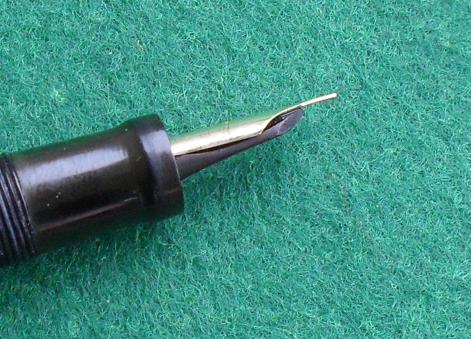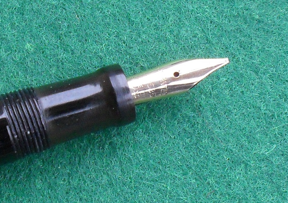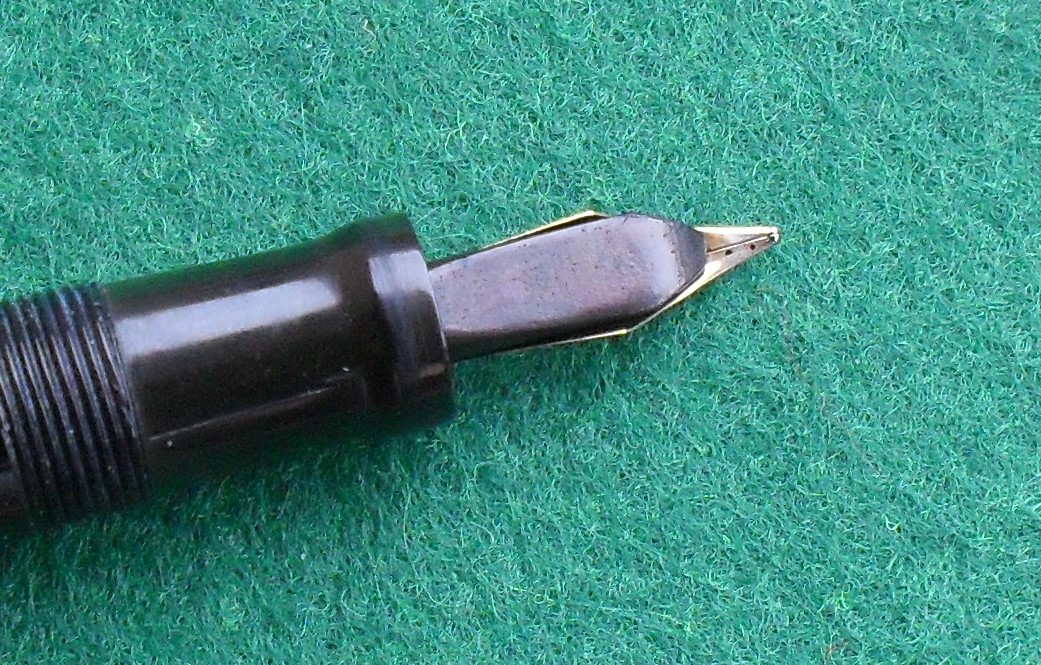 La scrittura si rivela subito pronta, con un bel flusso ma precisa, senza salti o false partenze. Nonostante l’alimentatore sia completamente liscio, senza alette per il trattenimento dell’inchiostro, due selle longitudinali, coperte dal pennino, svolgo egregiamente la loro funzione, impedendo qualunque perdita d’inchiostro ed assicurando un flusso costante. La penna non soffre di mancanze d’inchiostro, neppure parzialmente, anche se tenuta a lungo in posizione verticale. Il pennino in oro 14k, di belle proporzioni e che secondo l’abitudine del marchio era un semplice ma ottimo “Warranted 14-C–535 made in England” prodotto da terzi, è morbido, anche se non flessibile, e molto piacevole da usare, come quasi tutti i pennini inglesi coevi.