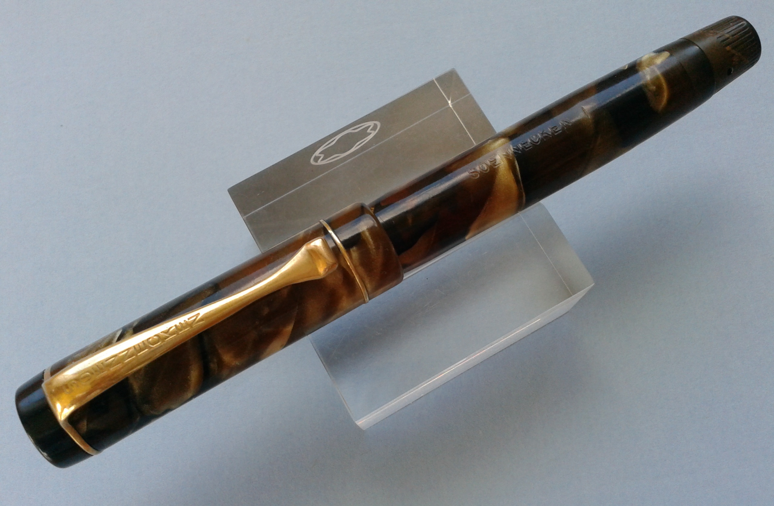 SOENNECKEN S19, taglia lady, in celluloide "brown, black&pearl" tornita dal pieno, finestra d'ispezione ambra, parti metalliche a vista placcate oro, pennino Soennecken 14K, caricamento a pistone, prodotta in Germania nel 1947. Le misure