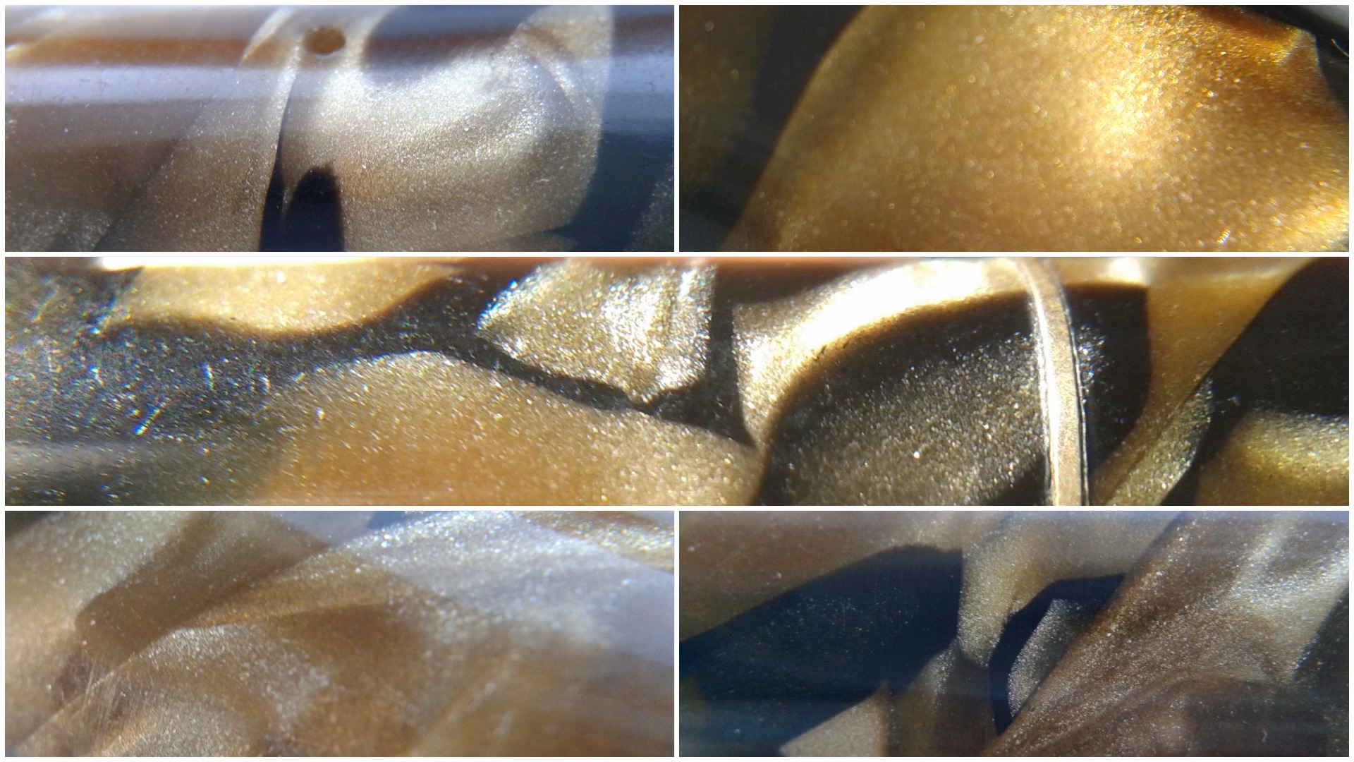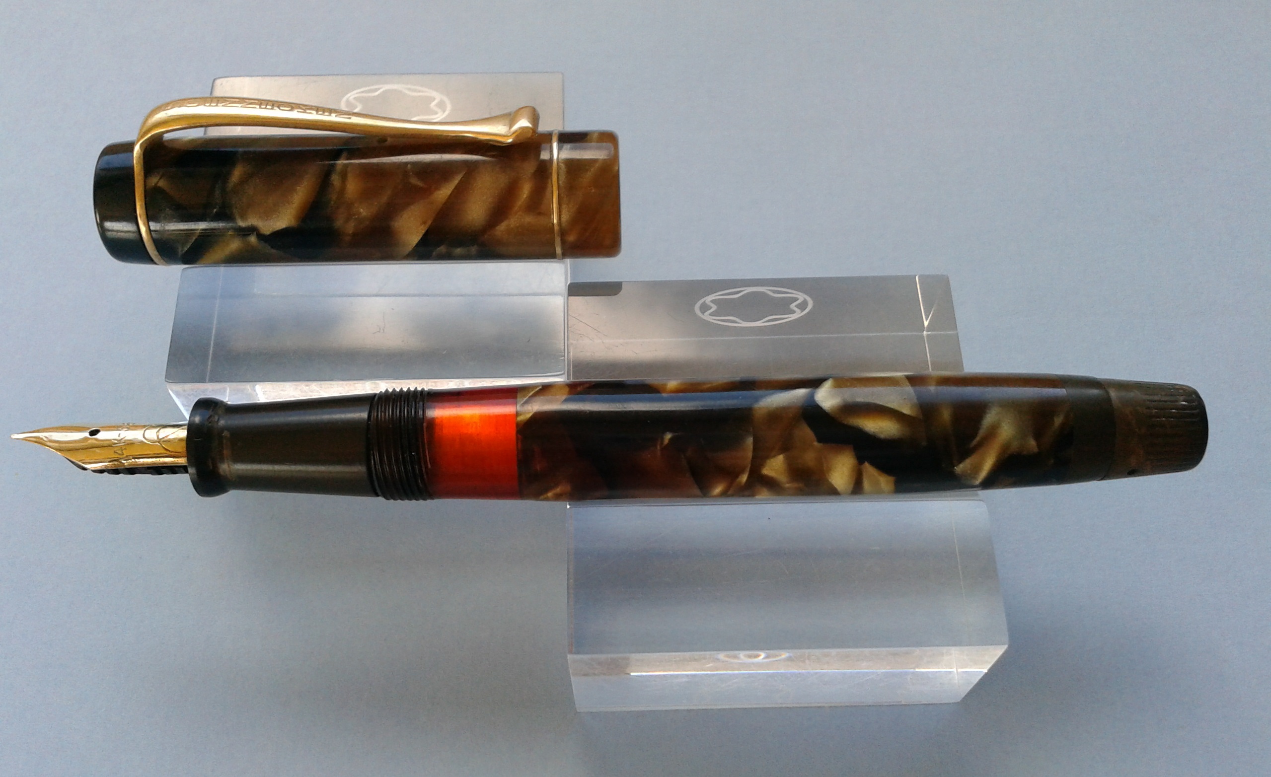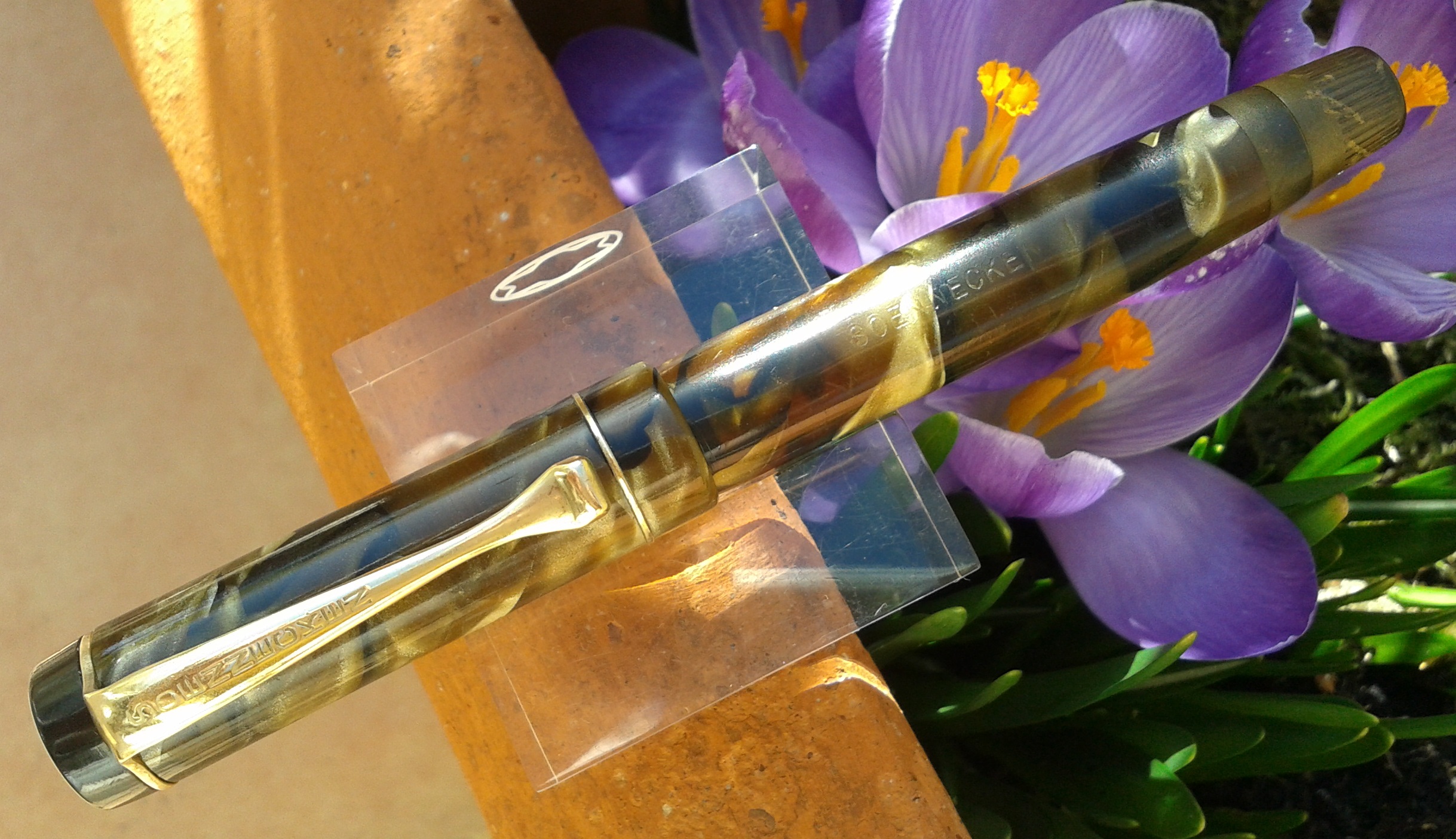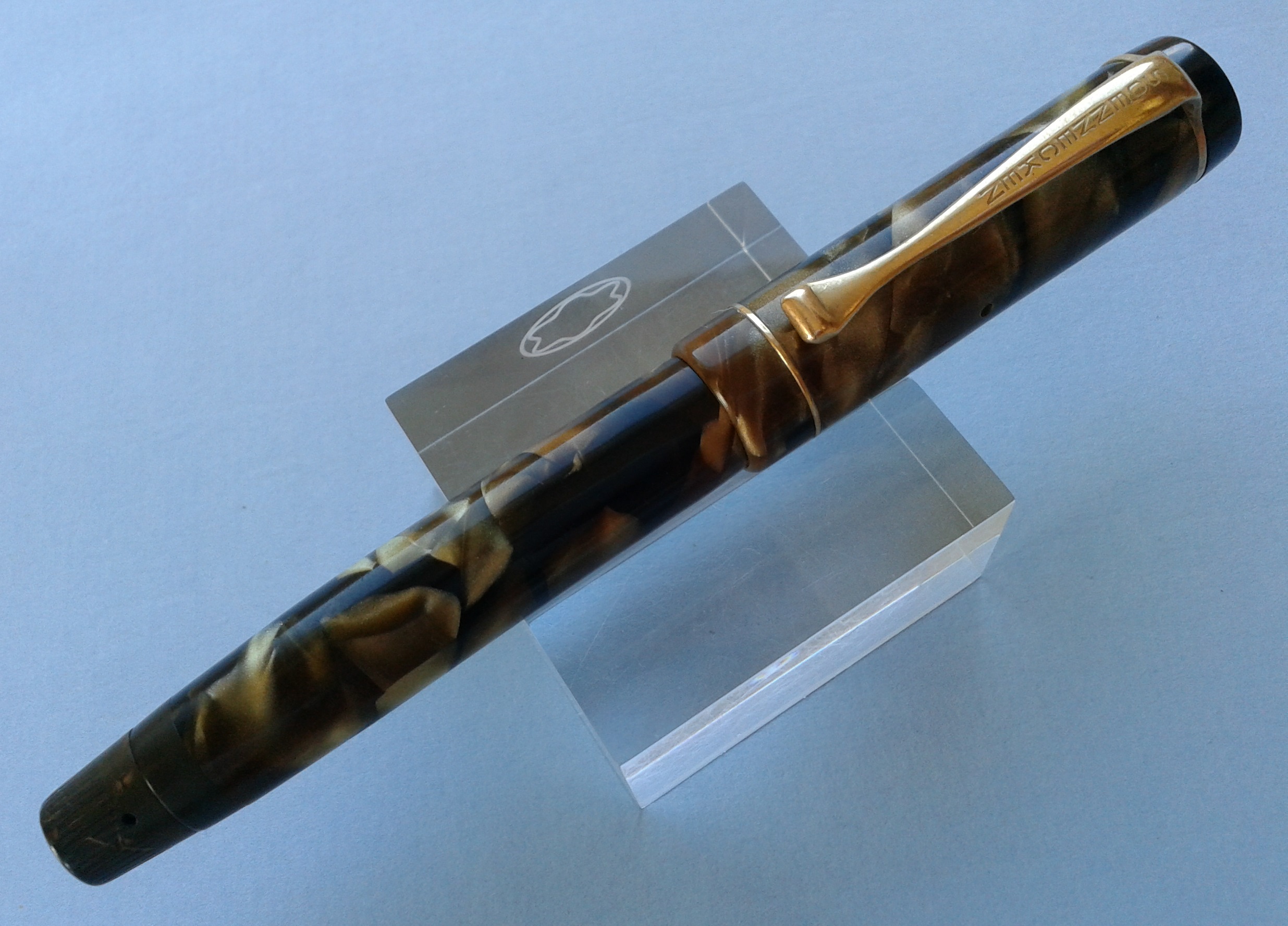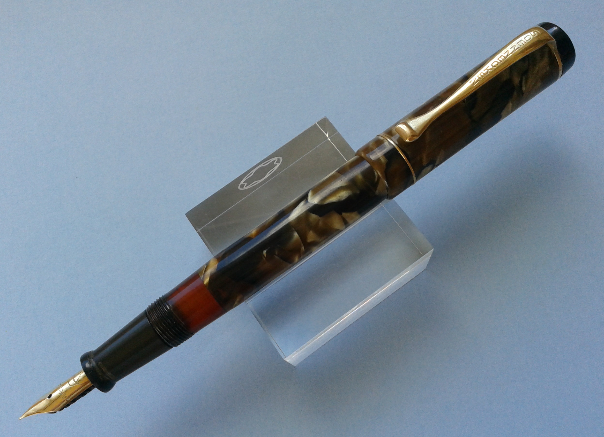 Iniziamo dalla celluloide, molto bella con sfumature suggestive. Il cappuccio è perfettamente cilindrico, un tipico "flat top" con testina piatta tronco conica in celluloide nera dell'altezza di quasi mezzo centimetro. L'aspetto è molto tradizionale, quasi serioso (per "studenti che studiano e che si devono prendere una Laura", avrebbe detto Totò