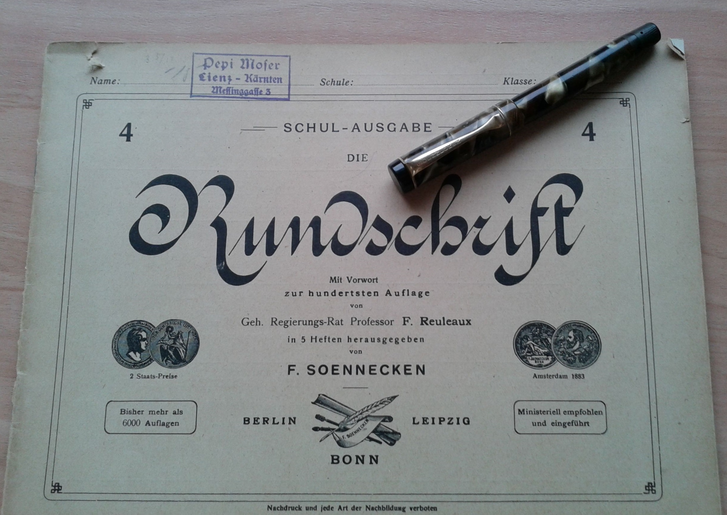 A questo proposito, vi mostro un quaderno di esercizi di calligrafia edito dalla Soennecken, dedicato proprio alla scrittura "Rotonda" (Rundschrift) di Friedrich Soennecken, il fondatore, che diede inizio alla propria fortuna intorno al 1868 proprio con la creazione di un manuale di scrittura normale "rotonda" da contrapporre agli stili tradizionali tedeschi... Il quaderno era stato venduto da una cartoleria di Lienz in Carinzia, e, nonostante le molte ristampe, non deve essere molto recente, se porta come ultimo premio internazionale ricevuto un riconoscimento di Amsterdam del 1883...