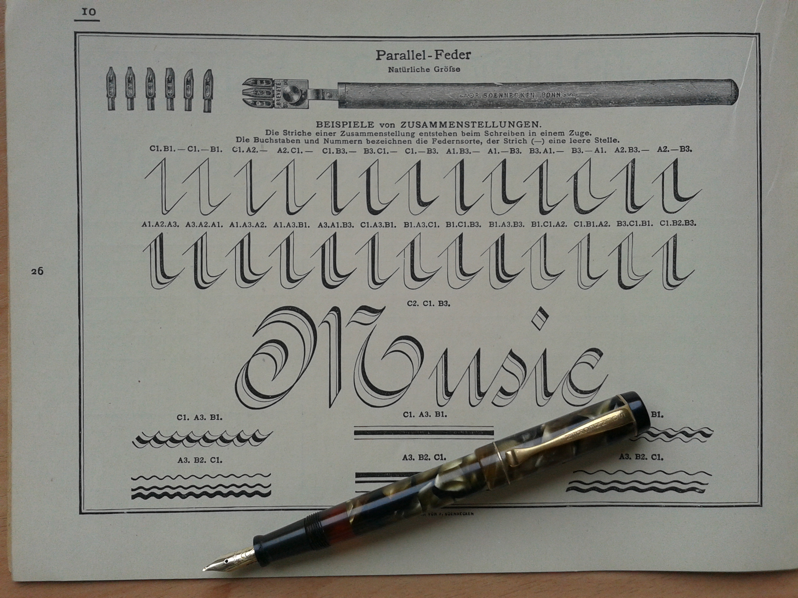 Come si può vedere, in questi corsi di calligrafia venivano anche pubblicizzati gli strumenti (pennini e cannucce) da utilizzare per la miglior riuscita dei compiti: strumenti ovviamente prodotti e venduti dalla Soennecken stessa, per l'apprendimento dei diversi stili (il corso di Rotonda per le scuole era in 5 quaderni) ed anche per particolari esigenze grafiche, come nella pagina seguente: Una riforma analoga fu introdotta nella Svizzera tedesca nel 1947: ed è proprio per il mercato svizzero, il meno prostrato dalla catastrofe materiale e morale della Guerra, che ritengo sia stata prodotta la penna oggetto di questa recensione.