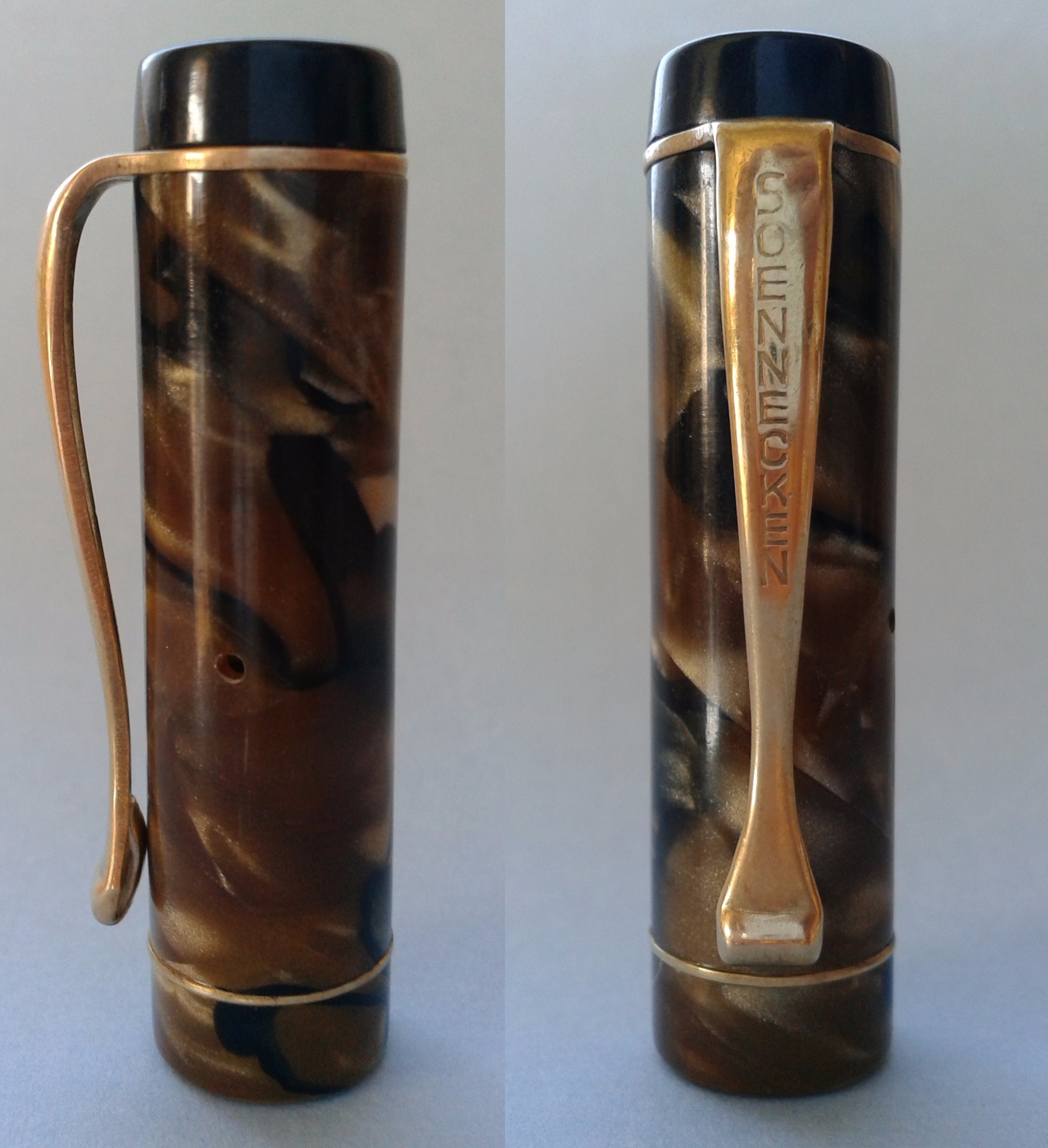 - quella della penna in presentazione, cioè flat top con testina in celluloide, cappuccio e fusto in celluloide tornita da barra piena, minuterie (clip e anellino singolo) in metallo dorato (ottone) con clip a goccia squadrata, la sola Marca "Soennecken" nell'iscrizione sul fusto, l'indicazione S19 sul fondello (non rilevata da nessun commentatore): secondo alcuni risalirebbe al 1947 e sarebbe una produzione destinata alla Svizzera;