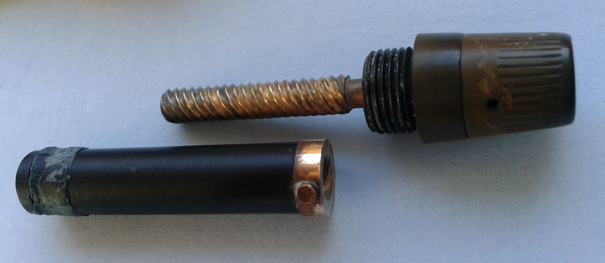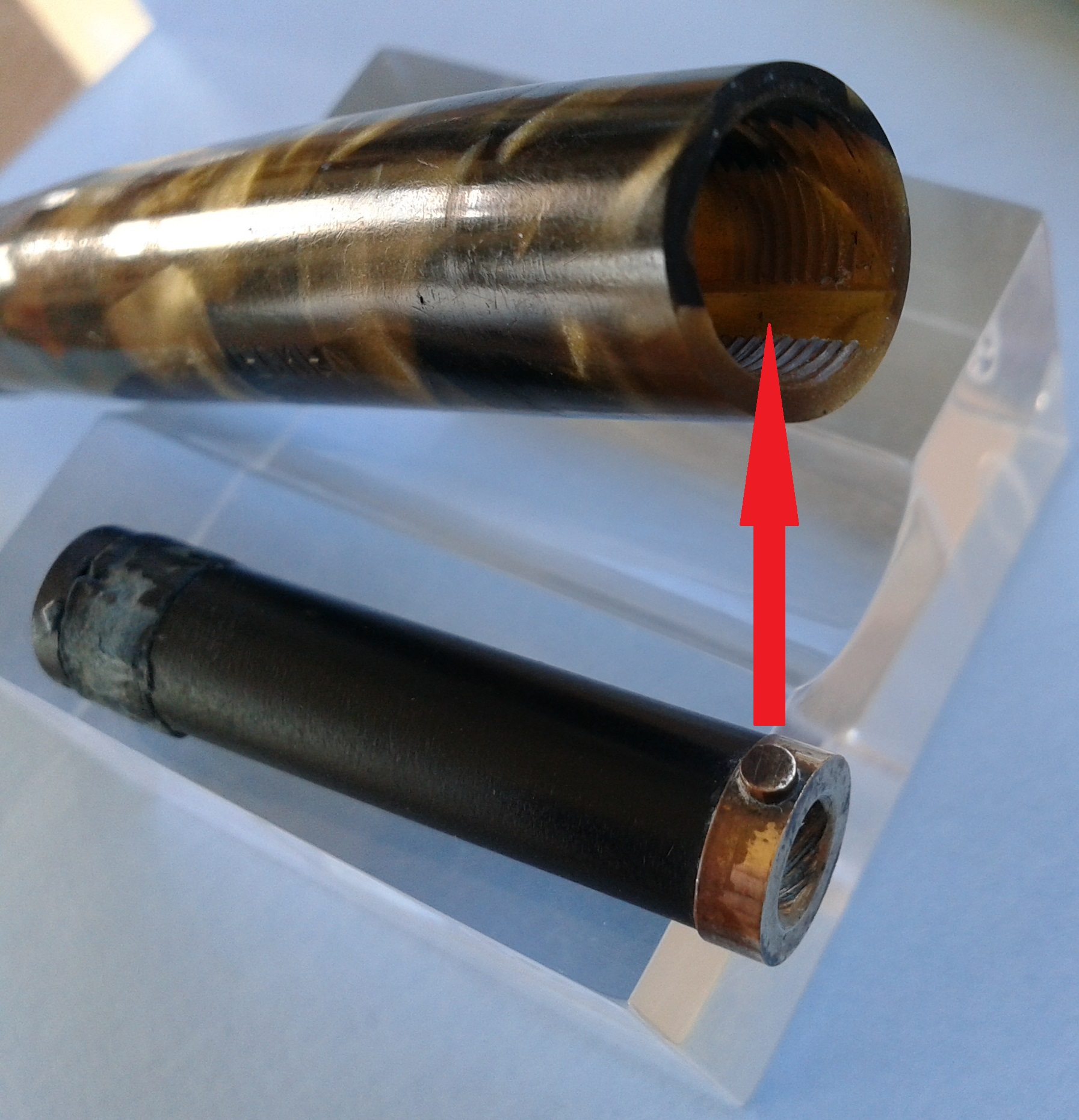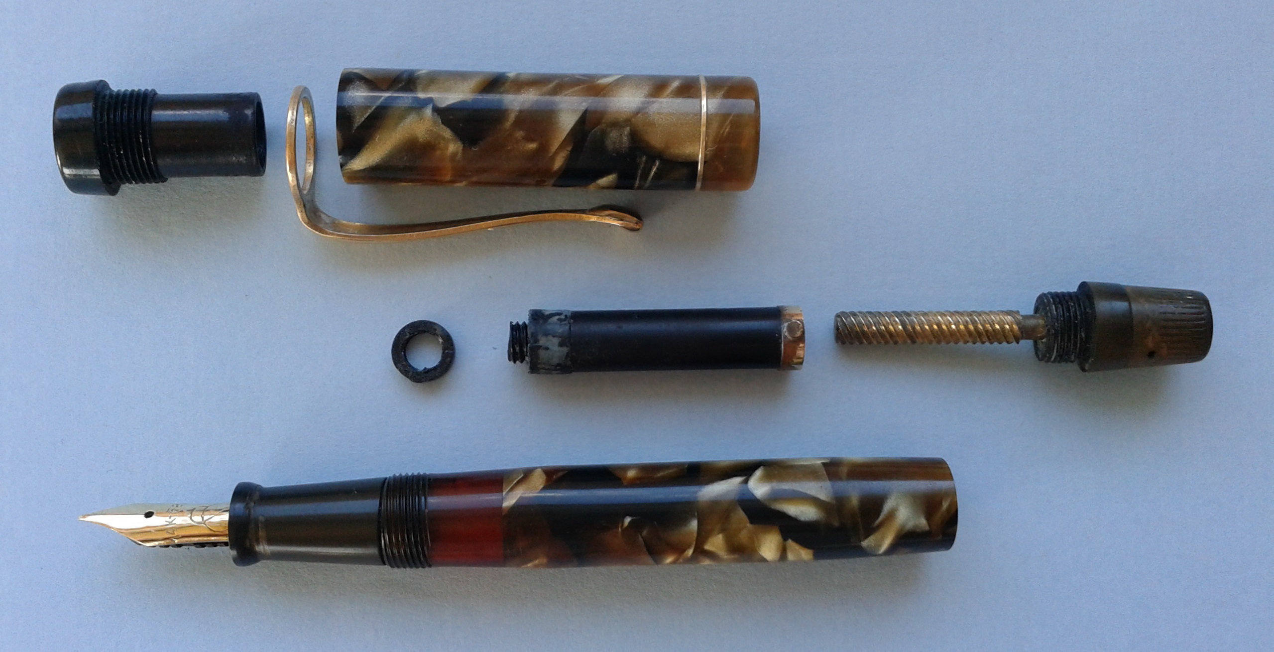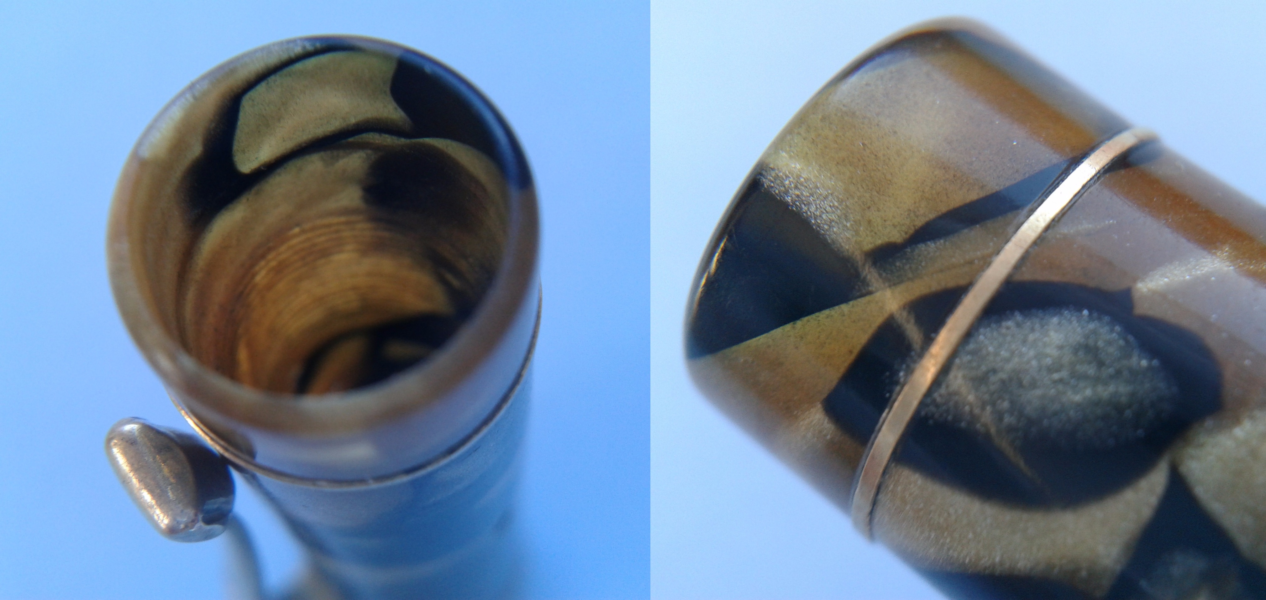 Dal labbro osserviamo l'interno del cappuccio, rinforzato e decorato da un singolo anellino dorato: Il sistema di caricamento è veramente fenomenale: osserviamolo in un esploso della penna (in evidenza l'anellino di ebanite che trattiene il vecchio sughero sul pistone svitato); il pistone ricomposto ed il fondello di carica in ebanite con la vite senza fine in ottone; il pistone avanza e retrocede nel fusto seguendo una guida scanalata nella celluloide. Grande robustezza ed affidabilità, relativa leggerezza e grande fluidità di funzionamento: queste le doti di un sistema di caricamento davvero eccellente!!