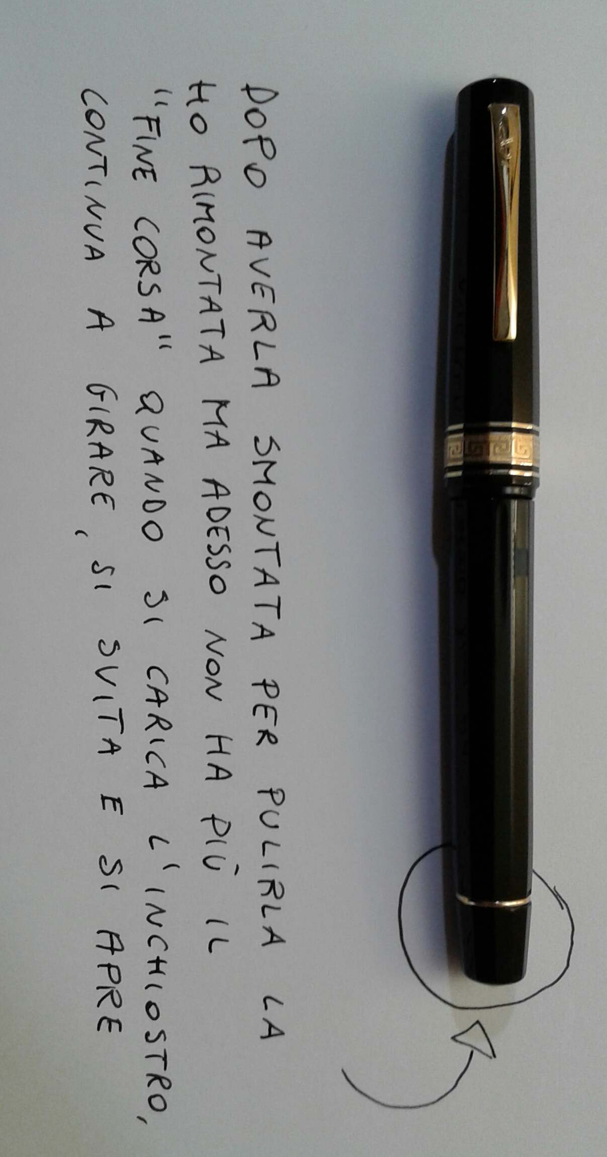 Adesso scrive perfettamente. Però ho un problema: prima di aprirla, la penna aveva una posizione di fine corsa per il caricamento che adesso è sparita quindi ho vado ad occhio...e che non si ferma, continua a girare e si svita.