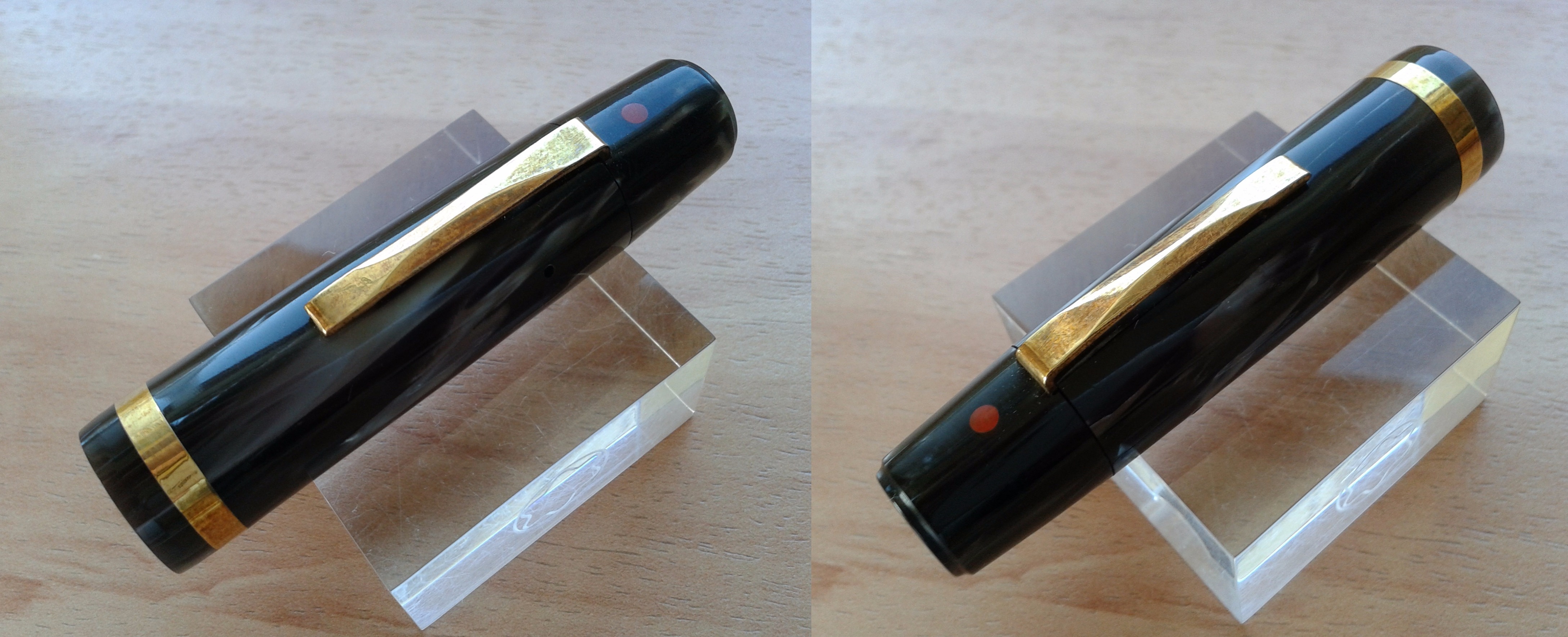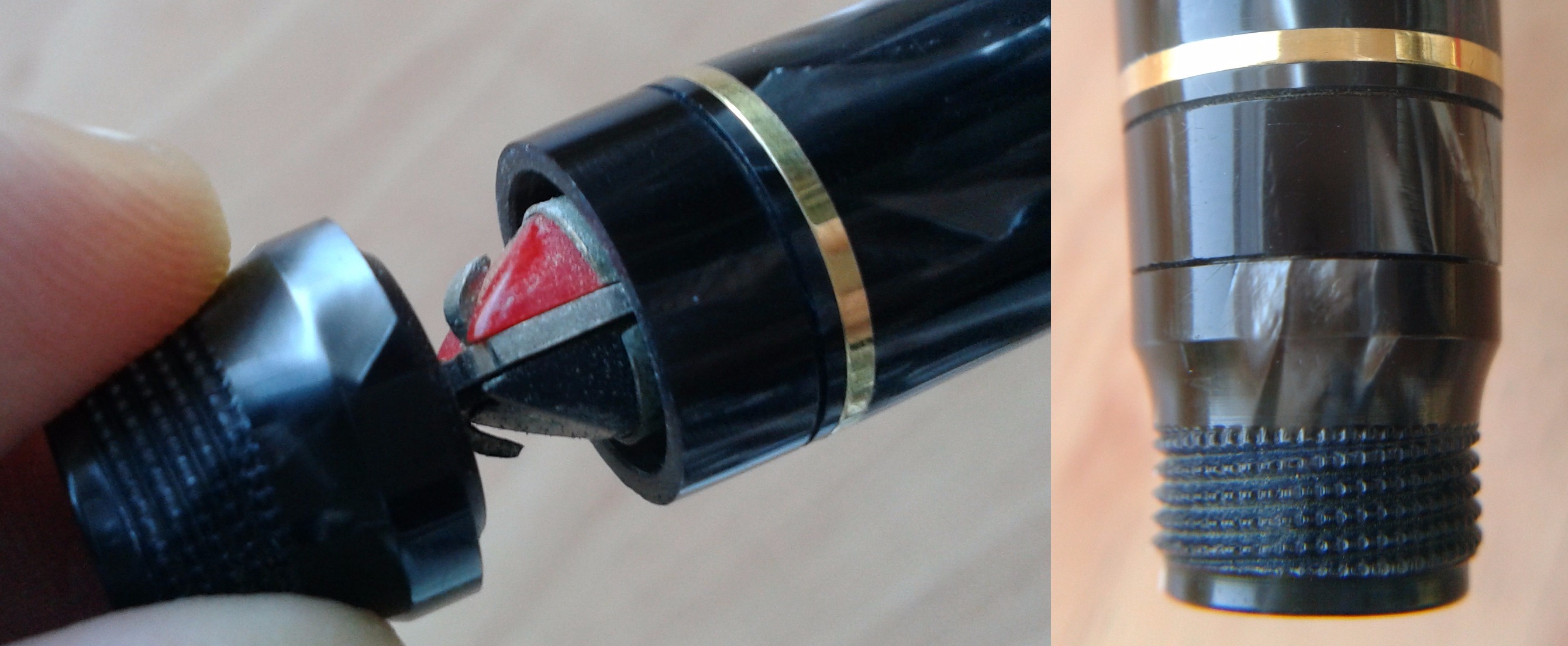 Aggiungo, inoltre, che mi erano sfuggiti alcuni hairlines sul cappuccio, di fatto invisibili nella trama delle striature della celluloide: il cappuccio è decisamente leggero e delicato, e ha patito un maldestro tentativo di svitamento della testina.