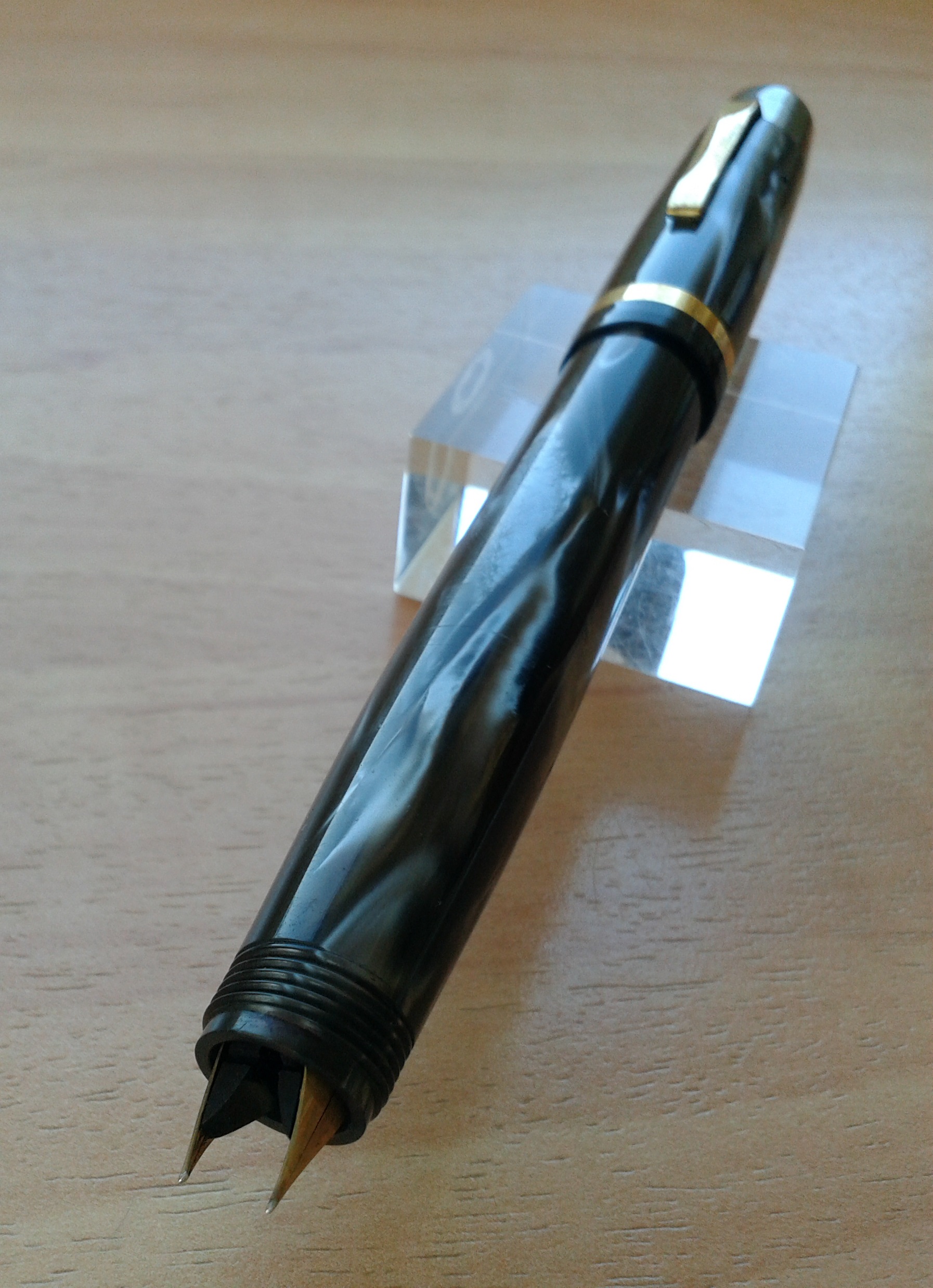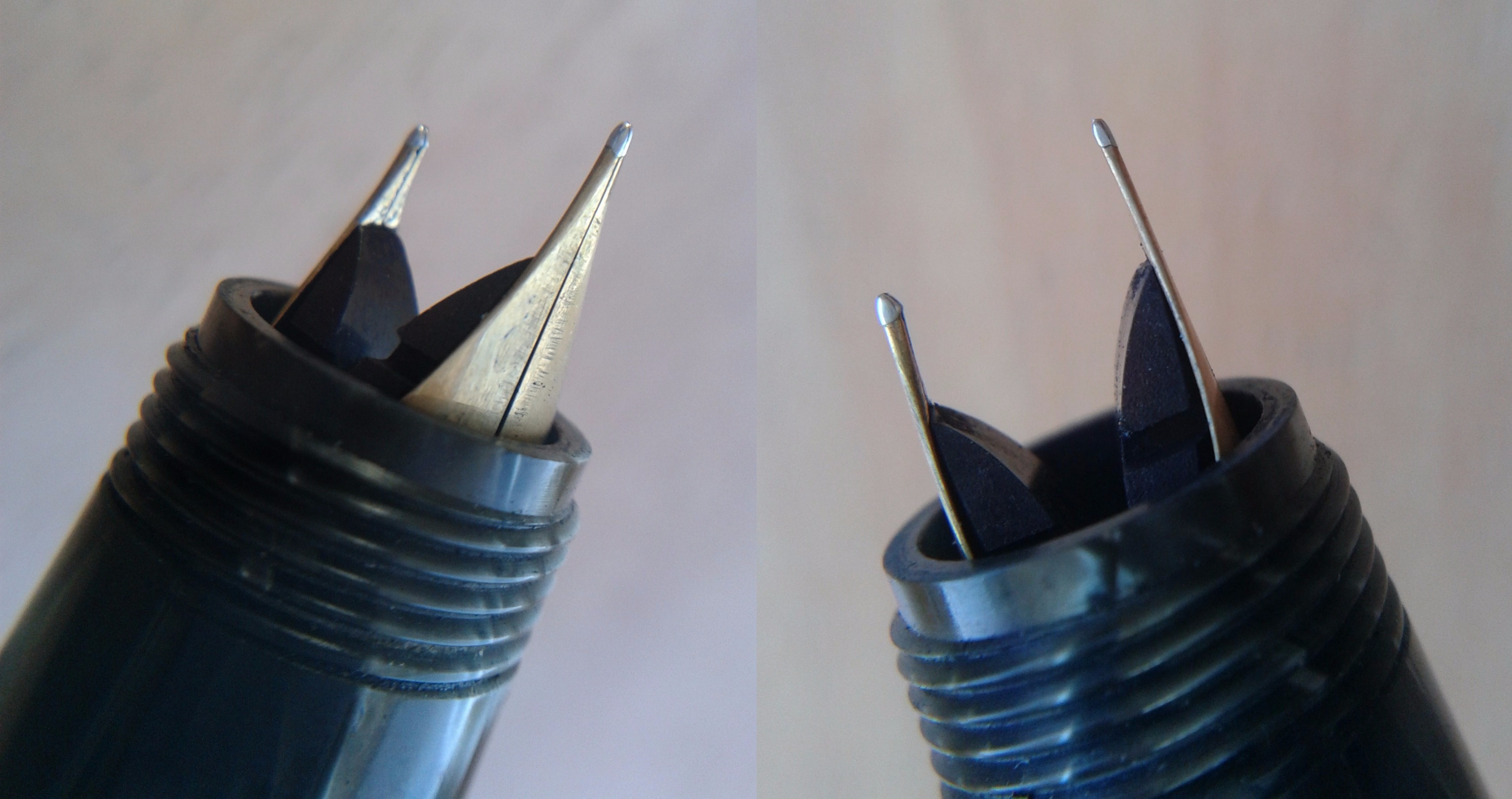 m'ero interessato a questa penna qualche tempo fa e ho letto non ricordo dove che in realtà la posizione corretta a riposo è con i due pennini equivalentemente uscenti dal corpo proprio come nelle tue foto.