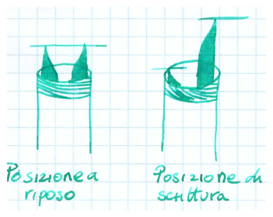 "Come si può vedere, in posizione di riposo (anche con cappuccio calzato a differenza delle rientranti) si dovrebbe sempre vedere "un solo pennino" estratto: tirando il fondello a molla (quindi non girandolo!), il pennino già estratto dovrebbe rientrare e quello ancora all'interno dovrebbe fuoriuscire. Bene, io ho trovato la penna con i pennini perfettamente appaiati, in posizione di riposo scorretta, dunque"...